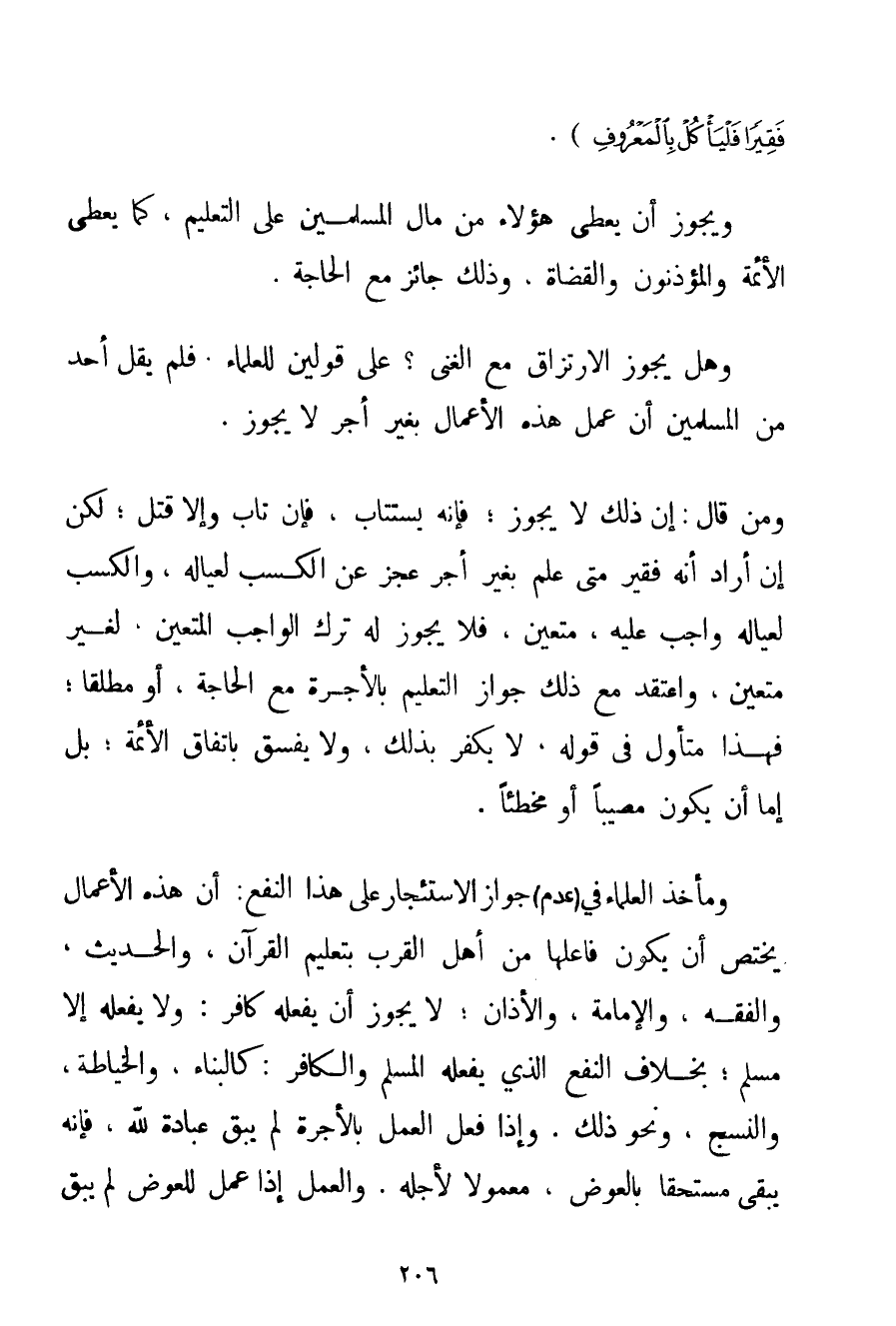 كَانَ فَقِيرًا فَلْيَأْكُلْ بِالْمَعْرُوفِ} . وَيَجُوزُ أَنْ يُعْطَى هَؤُلَاءِ مِنْ مَالِ الْمُسْلِمِينَ عَلَى التَّعْلِيمِ كَمَا يُعْطَى الْأَئِمَّةُ وَالْمُؤَذِّنُونَ وَالْقُضَاةُ وَذَلِكَ جَائِزٌ مَعَ الْحَاجَةِ. وَهَلْ يَجُوزُ الِارْتِزَاقُ مَعَ الْغِنَى؟ عَلَى قَوْلَيْنِ لِلْعُلَمَاءِ. فَلَمْ يَقُلْ أَحَدٌ مِنْ الْمُسْلِمِينَ أَنَّ عَمَلَ هَذِهِ الْأَعْمَالِ بِغَيْرِ أَجْرٍ لَا يَجُوزُ. وَمَنْ قَالَ: إنَّ ذَلِكَ لَا يَجُوزُ؛ فَإِنَّهُ يُسْتَتَابُ فَإِنْ تَابَ وَإِلَّا قُتِلَ؛ لَكِنْ إنْ أَرَادَ أَنَّهُ فَقِيرٌ مَتَى عَلَّمَ بِغَيْرِ أَجْرٍ عَجَزَ عَنْ الْكَسْبِ لِعِيَالِهِ وَالْكَسْبُ لِعِيَالِهِ وَاجِبٌ عَلَيْهِ مُتَعَيِّنٌ فَلَا يَجُوزُ لَهُ تَرْكُ الْوَاجِبِ الْمُتَعَيِّنِ لِغَيْرِ مُتَعَيِّنٍ وَاعْتَقَدَ مَعَ ذَلِكَ جَوَازَ التَّعْلِيمِ بِالْأُجْرَةِ مَعَ الْحَاجَةِ أَوْ مُطْلَقًا؛ فَهَذَا مُتَأَوِّلٌ فِي قَوْلِهِ لَا يَكْفُرُ بِذَلِكَ وَلَا يَفْسُقُ بِاتِّفَاقِ الْأَئِمَّةِ؛ بَلْ إمَّا أَنْ يَكُونَ مُصِيبًا أَوْ مُخْطِئًا. وَمَأْخَذُ الْعُلَمَاءِ فِي (عَدَمِ جَوَازِ الِاسْتِئْجَارِ عَلَى هَذَا النَّفْعِ: أَنَّ هَذِهِ الْأَعْمَالَ يَخْتَصُّ أَنْ يَكُونَ فَاعِلُهَا مِنْ أَهْلِ الْقُرَبِ بِتَعْلِيمِ الْقُرْآنِ وَالْحَدِيثِ وَالْفِقْهِ وَالْإِمَامَةِ وَالْأَذَانِ؛ لَا يَجُوزُ أَنْ يَفْعَلَهُ كَافِرٌ: وَلَا يَفْعَلُهُ إلَّا مُسْلِمٌ؛ بِخِلَافِ النَّفْعِ الَّذِي يَفْعَلُهُ الْمُسْلِمُ وَالْكَافِرُ: كَالْبِنَاءِ وَالْخِيَاطَةِ وَالنَّسْجِ وَنَحْوِ ذَلِكَ. وَإِذَا فُعِلَ الْعَمَلُ بِالْأُجْرَةِ لَمْ يَبْقَ عِبَادَةً لِلَّهِ فَإِنَّهُ يَبْقَى مُسْتَحَقًّا بِالْعِوَضِ مَعْمُولًا لِأَجْلِهِ. وَالْعَمَلُ إذَا عُمِلَ لِلْعِوَضِ لَمْ يَبْقَ