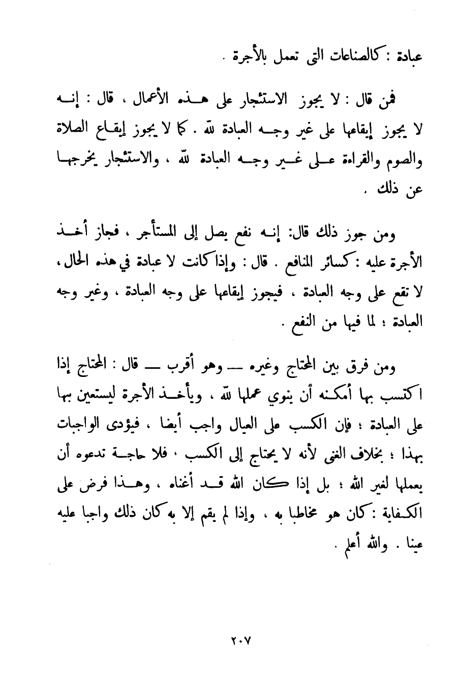 عِبَادَةً: كَالصِّنَاعَاتِ الَّتِي تُعْمَلُ بِالْأُجْرَةِ. فَمَنْ قَالَ: لَا يَجُوزُ الِاسْتِئْجَارُ عَلَى هَذِهِ الْأَعْمَالِ قَالَ: إنَّهُ لَا يَجُوزُ إيقَاعُهَا عَلَى غَيْرِ وَجْهِ الْعِبَادَةِ لِلَّهِ. كَمَا لَا يَجُوزُ إيقَاعُ الصَّلَاةِ وَالصَّوْمِ وَالْقِرَاءَةِ عَلَى غَيْرِ وَجْهِ الْعِبَادَةِ لِلَّهِ وَالِاسْتِئْجَارُ يُخْرِجُهَا عَنْ ذَلِكَ. وَمَنْ جَوَّزَ ذَلِكَ قَالَ: إنَّهُ نَفْعٌ يَصِلُ إلَى الْمُسْتَأْجِرِ فَجَازَ أَخْذُ الْأُجْرَةِ عَلَيْهِ: كَسَائِرِ الْمَنَافِعِ. قَالَ: وَإِذَا كَانَتْ لَا عِبَادَةَ فِي هَذِهِ الْحَالِ لَا تَقَعُ عَلَى وَجْهِ الْعِبَادَةِ فَيَجُوزُ إيقَاعُهَا عَلَى وَجْهِ الْعِبَادَةِ وَغَيْرِ وَجْهِ الْعِبَادَةِ؛ لِمَا فِيهَا مِنْ النَّفْعِ. وَمَنْ فَرَّقَ بَيْنَ الْمُحْتَاجِ وَغَيْرِهِ - وَهُوَ أَقْرَبُ - قَالَ: الْمُحْتَاجُ إذَا اكْتَسَبَ بِهَا أَمْكَنَهُ أَنْ يَنْوِيَ عَمَلَهَا لِلَّهِ وَيَأْخُذُ الْأُجْرَةَ لِيَسْتَعِينَ بِهَا عَلَى الْعِبَادَةِ؛ فَإِنَّ الْكَسْبَ عَلَى الْعِيَالِ وَاجِبٌ أَيْضًا فَيُؤَدِّي الْوَاجِبَاتِ بِهَذَا؛ بِخِلَافِ الْغَنِيِّ لِأَنَّهُ لَا يَحْتَاجُ إلَى الْكَسْبِ فَلَا حَاجَةَ تَدْعُوهُ أَنْ يَعْمَلَهَا لِغَيْرِ اللَّهِ؛ بَلْ إذَا كَانَ اللَّهُ قَدْ أَغْنَاهُ وَهَذَا فُرِضَ عَلَى الْكِفَايَةِ: كَانَ هُوَ مُخَاطَبًا بِهِ وَإِذَا لَمْ يَقُمْ إلَّا بِهِ كَانَ ذَلِكَ وَاجِبًا عَلَيْهِ عَيْنًا. وَاَللَّهُ أَعْلَمُ.