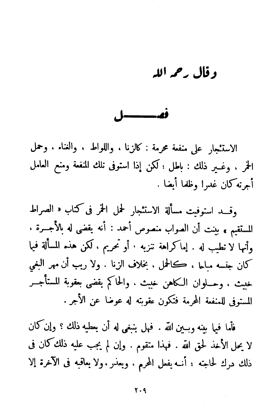 الِاسْتِئْجَارُ عَلَى مَنْفَعَةٍ مُحَرَّمَةٍ: كَالزِّنَا وَاللِّوَاطِ وَالْغِنَاءِ وَحَمْلِ الْخَمْرِ وَغَيْرِ ذَلِكَ: بَاطِلٌ؛ لَكِنْ إذَا اسْتَوْفَى تِلْكَ الْمَنْفَعَةَ وَمَنَعَ الْعَامِلَ أُجْرَتَهُ كَانَ غَدْرًا وَظُلْمًا أَيْضًا. وَقَدْ اسْتَوْفَيْت مَسْأَلَةَ الِاسْتِئْجَارِ لِحَمْلِ الْخَمْرِ فِي كِتَابِ " الصِّرَاطِ الْمُسْتَقِيمِ " بَيَّنْت أَنَّ الصَّوَابَ مَنْصُوصُ أَحْمَد: أَنَّهُ يُقْضَى لَهُ بِالْأُجْرَةِ وَأَنَّهَا لَا تَطِيبُ لَهُ. إمَّا كَرَاهَةَ تَنْزِيهٍ أَوْ تَحْرِيمٍ لَكِنَّ هَذِهِ الْمَسْأَلَةَ فِيمَا كَانَ جِنْسُهُ مُبَاحًا كَالْحَمْلِ بِخِلَافِ الزِّنَا. وَلَا رَيْبَ أَنَّ مَهْرَ الْبَغِيِّ خَبِيثٌ وَحُلْوَانُ الْكَاهِنِ خَبِيثٌ وَالْحَاكِمُ يَقْضِي بِعُقُوبَةِ الْمُسْتَأْجِرِ الْمُسْتَوْفِي لِلْمَنْفَعَةِ الْمُحَرَّمَةِ فَتَكُونُ عُقُوبَتُهُ لَهُ عِوَضًا عَنْ الْأَجْرِ. فَأَمَّا فِيمَا بَيْنَهُ وَبَيْنَ اللَّهِ. فَهَلْ يَنْبَغِي لَهُ أَنْ يُعْطِيَهُ ذَلِكَ؟ وَإِنْ كَانَ لَا يَحِلُّ الْأَخْذُ لِحَقِّ اللَّهِ. فَهَذَا مُتَقَوِّمٌ. وَإِنْ لَمْ يَجِبْ عَلَيْهِ ذَلِكَ كَانَ فِي ذَلِكَ دَرْكٌ لِحَاجَتِهِ؛ أَنَّهُ يَفْعَلُ الْمُحَرَّمَ وَيُعْذَرُ وَلَا يُعَاقِبُهُ فِي الْآخِرَةِ إلَّا