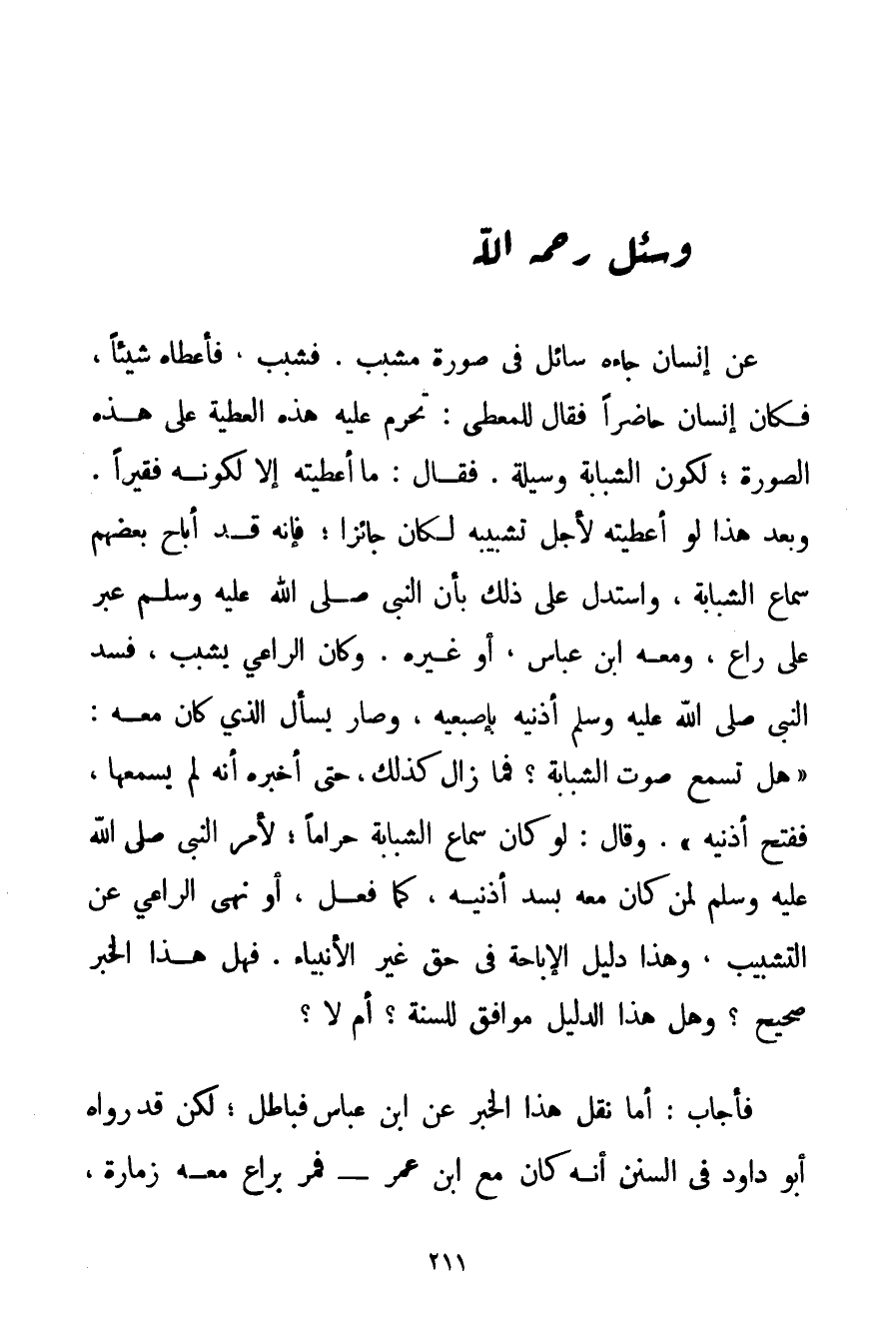 عَنْ إنْسَانٍ جَاءَهُ سَائِلٌ فِي صُورَةِ مُشَبِّبٍ. فَشَبَّبَ. فَأَعْطَاهُ شَيْئًا فَكَانَ إنْسَانٌ حَاضِرًا فَقَالَ لِلْمُعْطَى: تَحْرُمُ عَلَيْهِ هَذِهِ الْعَطِيَّةُ عَلَى هَذِهِ الصُّورَةِ؛ لِكَوْنِ الشبابة وَسِيلَةً: فَقَالَ: مَا أَعْطَيْته إلَّا لِكَوْنِهِ فَقِيرًا وَبَعْدَ هَذَا لَوْ أَعْطَيْته لِأَجْلِ تَشْبِيبِهِ لَكَانَ جَائِزًا؛ فَإِنَّهُ قَدْ أَبَاحَ بَعْضُهُمْ سَمَاعَ الشبابة وَاسْتَدَلَّ عَلَى ذَلِكَ بِأَنَّ {النَّبِيَّ صَلَّى اللَّهُ عَلَيْهِ وَسَلَّمَ عَبَرَ عَلَى رَاعٍ وَمَعَهُ ابْنُ عَبَّاسٍ أَوْ غَيْرُهُ. وَكَانَ الرَّاعِي يُشَبِّبُ فَسَدَّ النَّبِيُّ صَلَّى اللَّهُ عَلَيْهِ وَسَلَّمَ أُذُنَيْهِ بِإِصْبَعَيْهِ وَصَارَ يَسْأَلُ الَّذِي كَانَ مَعَهُ: هَلْ تَسْمَعُ صَوْتَ الشبابة؟ فَمَا زَالَ كَذَلِكَ حَتَّى أَخْبَرَهُ أَنَّهُ لَمْ يَسْمَعْهَا فَفَتَحَ أُذُنَيْهِ} . وَقَالَ: لَوْ كَانَ سَمَاعُ الشبابة حَرَامًا؛ لَأَمَرَ النَّبِيُّ صَلَّى اللَّهُ عَلَيْهِ وَسَلَّمَ لِمَنْ كَانَ مَعَهُ بِسَدِّ أُذُنَيْهِ كَمَا فَعَلَ أَوْ نَهَى الرَّاعِيَ عَنْ التَّشْبِيبِ وَهَذَا دَلِيلُ الْإِبَاحَةِ فِي حَقِّ غَيْرِ الْأَنْبِيَاءِ. فَهَلْ هَذَا الْخَبَرُ صَحِيحٌ؟ وَهَلْ هَذَا الدَّلِيلُ مُوَافِقٌ لِلسُّنَّةِ؟ أَمْ لَا؟