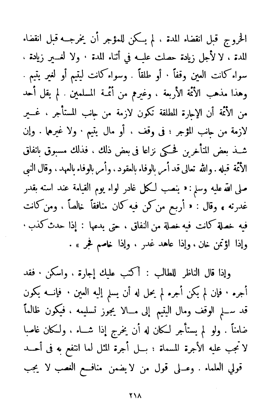 الْخُرُوجُ قَبْلَ انْقِضَاءِ الْمُدَّةِ لَمْ يَكُنْ لِلْمُؤَجِّرِ أَنْ يُخْرِجَهُ قَبْلَ انْقِضَاءِ الْمُدَّةِ لَا لِأَجْلِ زِيَادَةٍ حَصَلَتْ عَلَيْهِ فِي أَثْنَاءِ الْمُدَّةِ وَلَا لِغَيْرِ زِيَادَةٍ سَوَاءٌ كَانَتْ الْعَيْنُ وَقْفًا أَوْ طَلْقًا. وَسَوَاءٌ كَانَتْ لِيَتِيمِ أَوْ لِغَيْرِ يَتِيمٍ. وَهَذَا مَذْهَبُ الْأَئِمَّةِ الْأَرْبَعَةِ وَغَيْرِهِمْ مِنْ أَئِمَّةِ الْمُسْلِمِينَ. لَمْ يَقُلْ أَحَدٌ مِنْ الْأَئِمَّةِ أَنَّ الْإِجَارَةَ الْمُطْلَقَةَ تَكُونُ لَازِمَةً مِنْ جَانِبِ الْمُسْتَأْجِرِ غَيْرَ لَازِمَةٍ مِنْ جَانِبِ الْمُؤَجِّرِ؛ فِي وَقْفٍ أَوْ مَالِ يَتِيمٍ وَلَا غَيْرِهِمَا. وَإِنْ شَذَّ بَعْضُ الْمُتَأَخِّرِينَ فَحَكَى نِزَاعًا فِي بَعْضِ ذَلِكَ فَذَلِكَ مَسْبُوقٌ بِاتِّفَاقِ الْأَئِمَّةِ قَبْلَهُ. وَاَللَّهُ تَعَالَى قَدْ أَمَرَ بِالْوَفَاءِ بِالْعُقُودِ وَأَمَرَ بِالْوَفَاءِ بِالْعَهْدِ وَقَالَ النَّبِيُّ صَلَّى اللَّهُ عَلَيْهِ وَسَلَّمَ {يُنْصَبُ لِكُلِّ غَادِرٍ لِوَاءٌ يَوْمَ الْقِيَامَةِ عِنْدَ اسْتِهِ بِقَدْرِ غَدْرَتِهِ} وَقَالَ: {أَرْبَعٌ مَنْ كُنَّ فِيهِ كَانَ مُنَافِقًا خَالِصًا وَمَنْ كَانَتْ فِيهِ خَصْلَةٌ كَانَتْ فِيهِ خَصْلَةٌ مِنْ النِّفَاقِ حَتَّى يَدَعَهَا: إذَا حَدَّثَ كَذَبَ وَإِذَا اُؤْتُمِنَ خَانَ وَإِذَا عَاهَدَ غَدَرَ وَإِذَا خَاصَمَ فَجَرَ} . وَإِذَا قَالَ النَّاظِرُ لِلطَّالِبِ: أَكْتُبُ عَلَيْك إجَارَةً وَاسْكُنْ فَقَدْ أَجَّرَهُ فَإِنْ لَمْ يَكُنْ أَجَّرَهُ لَمْ يَحِلَّ لَهُ أَنْ يُسَلِّمَ إلَيْهِ الْعَيْنَ فَإِنَّهُ يَكُونُ قَدْ سَلَّمَ الْوَقْفَ وَمَالَ الْيَتِيمِ إلَى مَا لَا يَجُوزُ تَسْلِيمُهُ فَيَكُونُ ظَالِمًا ضَامِنًا. وَلَوْ لَمْ يَسْتَأْجِرْ لَكَانَ لَهُ أَنْ يَخْرُجَ إذَا شَاءَ وَلَكَانَ غَاصِبًا لَا تَجِبُ عَلَيْهِ الْأُجْرَةُ الْمُسَمَّاةُ؛ بَلْ أُجْرَةُ الْمِثْلِ لِمَا انْتَفَعَ بِهِ فِي أَحَدِ قَوْلَيْ الْعُلَمَاءِ. وَعَلَى قَوْلِ مَنْ لَا يَضْمَنُ مَنَافِعَ الْغَصْبِ لَا يَجِبُ