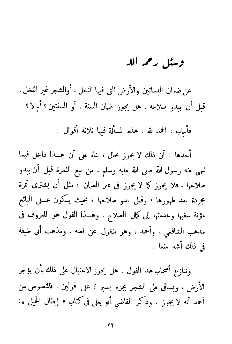 الْحَمْدُ لِلَّهِ، هَذِهِ الْمَسْأَلَةُ فِيهَا ثَلَاثَةُ أَقْوَالٍ: أَحَدُهَا: أَنَّ ذَلِكَ لَا يَجُوزُ بِحَالِ؛ بِنَاءً عَلَى أَنَّ هَذَا دَاخِلٌ فِيمَا نَهَى عَنْهُ رَسُولُ اللَّهِ صَلَّى اللَّهُ عَلَيْهِ وَسَلَّمَ. مِنْ بَيْعِ الثَّمَرَةِ قَبْلَ أَنْ يَبْدُوَ صَلَاحُهَا فَلَا يَجُوزُ كَمَا لَا يَجُوزُ فِي غَيْرِ الضَّمَانِ؛ مَثَلًا أَنْ يَشْتَرِيَ ثَمَرَةً مُجَرَّدَةً بَعْدَ ظُهُورِهَا وَقَبْلَ بُدُوِّ صَلَاحِهَا؛ بِحَيْثُ يَكُونُ عَلَى الْبَائِعِ مُؤْنَةُ سَقْيِهَا وَخِدْمَتِهَا إلَى كَمَالِ الصَّلَاحِ. وَهَذَا الْقَوْلُ هُوَ الْمَعْرُوفُ فِي مَذْهَبِ الشَّافِعِيِّ وَأَحْمَدَ وَهُوَ مَنْقُولٌ عَنْ نَصِّهِ. وَمَذْهَبُ أَبِي حَنِيفَةَ فِي ذَلِكَ أَشَدُّ مَنْعًا. وَتَنَازَعَ أَصْحَابُ هَذَا الْقَوْلِ. هَلْ يَجُوزُ الِاحْتِيَالُ عَلَى ذَلِكَ بِأَنْ يُؤَجِّرَ الْأَرْضَ وَيُسَاقِيَ عَلَى الشَّجَرِ بِجُزْءِ يَسِيرٍ؟ عَلَى قَوْلَيْنِ. فَالْمَنْصُوصُ عَنْ أَحْمَدَ أَنَّهُ لَا يَجُوزُ. وَذَكَرَ الْقَاضِي أَبُو يَعْلَى فِي كِتَابِ " إبْطَالِ الْحِيَلِ ":
