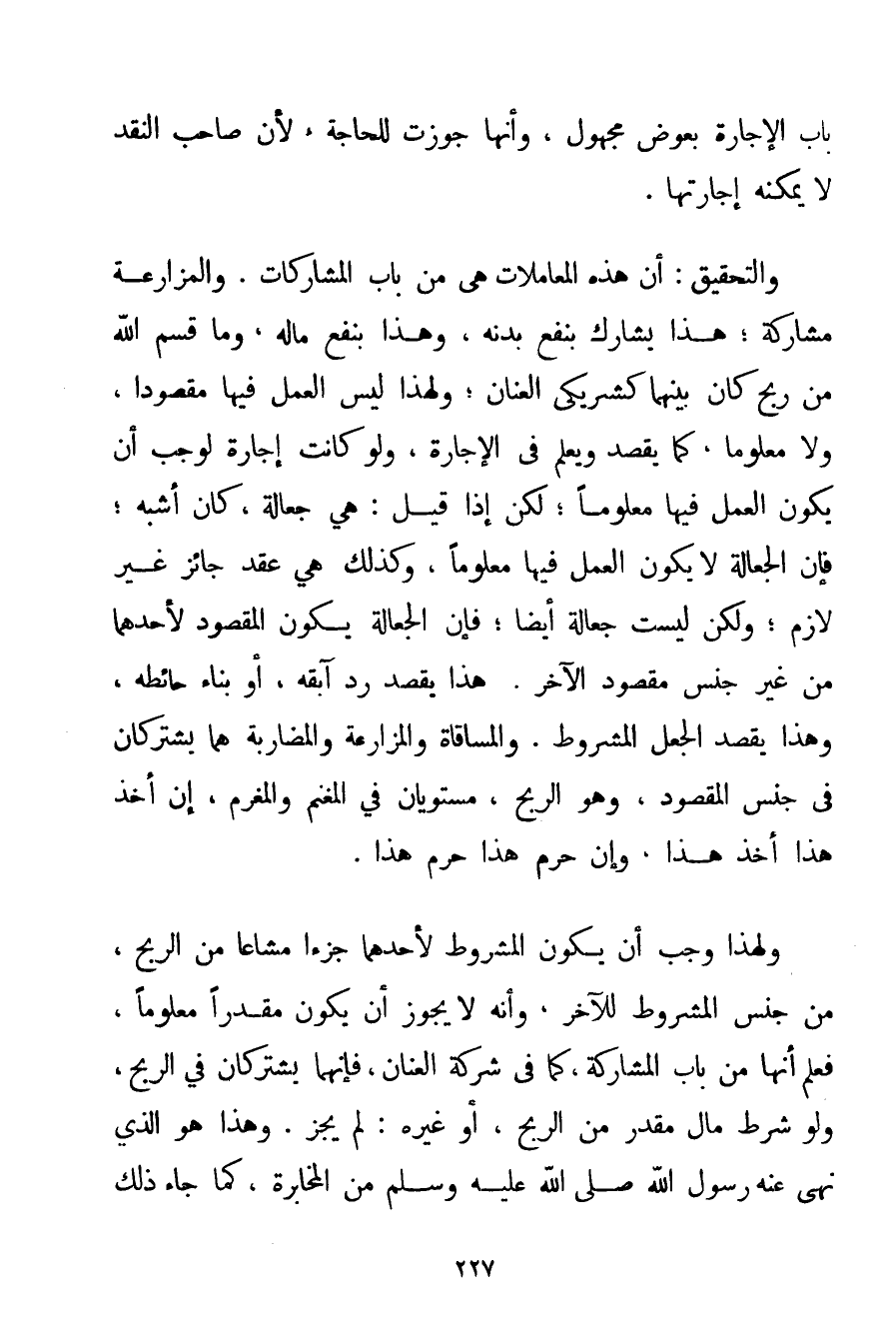 بَابِ الْإِجَارَةِ بِعِوَضِ مَجْهُولٍ وَأَنَّهَا جُوِّزَتْ لِلْحَاجَةِ؛ لِأَنَّ صَاحِبَ النَّقْدِ لَا يُمْكِنُهُ إجَارَتَهَا. وَالتَّحْقِيقُ: أَنَّ هَذِهِ الْمُعَامَلَاتِ هِيَ مِنْ بَابِ الْمُشَارَكَاتِ. وَالْمُزَارَعَةُ مُشَارَكَةٌ؛ هَذَا يُشَارِكُ بِنَفْعِ بَدَنِهِ وَهَذَا بِنَفْعِ مَالِهِ وَمَا قَسَمَ اللَّهُ مِنْ رِبْحٍ كَانَ بَيْنَهُمَا كَشَرِيكَيْ الْعِنَانِ؛ وَلِهَذَا لَيْسَ الْعَمَلُ فِيهَا مَقْصُودًا وَلَا مَعْلُومًا كَمَا يُقْصَدُ وَيُعْلَمُ فِي الْإِجَارَةِ وَلَوْ كَانَتْ إجَارَةً لَوَجَبَ أَنْ يَكُونَ الْعَمَلُ فِيهَا مَعْلُومًا؛ لَكِنْ إذَا قِيلَ: هِيَ جَعَالَةٌ كَانَ أَشْبَهَ؛ فَإِنَّ الْجَعَالَةَ لَا يَكُونُ الْعَمَلُ فِيهَا مَعْلُومًا وَكَذَلِكَ هِيَ عَقْدٌ جَائِزٌ غَيْرُ لَازِمٍ؛ وَلَكِنْ لَيْسَتْ جَعَالَةً أَيْضًا؛ فَإِنَّ الْجَعَالَةَ يَكُونُ الْمَقْصُودُ لِأَحَدِهِمَا مِنْ غَيْرِ جِنْسِ مَقْصُودِ الْآخَرِ. هَذَا يَقْصِدُ رَدَّ آبِقِهِ أَوْ بِنَاءَ حَائِطِهِ وَهَذَا يَقْصِدُ الْجَعْلَ الْمَشْرُوطَ. وَالْمُسَاقَاةُ وَالْمُزَارَعَةُ وَالْمُضَارَبَةُ هُمَا يَشْتَرِكَانِ فِي جِنْسِ الْمَقْصُودِ وَهُوَ الرِّبْحُ مُسْتَوِيَانِ فِي الْمَغْنَمِ وَالْمَغْرَمِ إنْ أَخَذَ هَذَا أَخَذَ هَذَا وَإِنْ حُرِمَ هَذَا حُرِمَ هَذَا. وَلِهَذَا وَجَبَ أَنْ يَكُونَ الْمَشْرُوطُ لِأَحَدِهِمَا جُزْءًا مُشَاعًا مِنْ الرِّبْحِ مِنْ جِنْسِ الْمَشْرُوطِ لِلْآخَرِ وَأَنَّهُ لَا يَجُوزُ أَنْ يَكُونَ مُقَدَّرًا مَعْلُومًا فَعُلِمَ أَنَّهَا مِنْ بَابِ الْمُشَارَكَةِ كَمَا فِي شَرِكَةِ الْعِنَانِ فَإِنَّهُمَا يَشْتَرِكَانِ فِي الرِّبْحِ وَلَوْ شُرِطَ مَالٌ مُقَدَّرٌ مِنْ الرِّبْحِ أَوْ غَيْرِهِ: لَمْ يَجُزْ. وَهَذَا هُوَ الَّذِي نَهَى عَنْهُ رَسُولُ اللَّهِ صَلَّى اللَّهُ عَلَيْهِ وَسَلَّمَ مِنْ الْمُخَابَرَةِ كَمَا جَاءَ ذَلِكَ