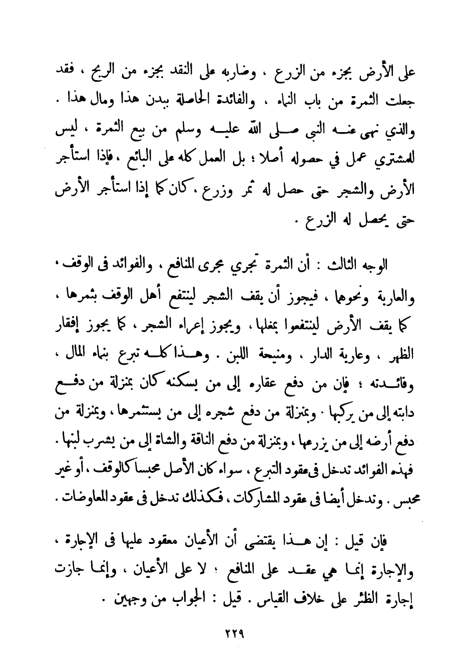 عَلَى الْأَرْضِ بِجُزْءِ مِنْ الزَّرْعِ وَضَارَبَهُ عَلَى النَّقْدِ بِجُزْءِ مِنْ الرِّبْحِ فَقَدْ جُعِلَتْ الثَّمَرَةُ مِنْ بَابِ النَّمَاءِ وَالْفَائِدَةُ الْحَاصِلَةُ بِبَدَنِ هَذَا وَمَالِ هَذَا. وَاَلَّذِي نَهَى عَنْهُ النَّبِيُّ صَلَّى اللَّهُ عَلَيْهِ وَسَلَّمَ مِنْ بَيْعِ الثَّمَرَةِ لَيْسَ لِلْمُشْتَرِي عَمَلٌ فِي حُصُولِهِ أَصْلًا؛ بَلْ الْعَمَلُ كُلُّهُ عَلَى الْبَائِعِ فَإِذَا اسْتَأْجَرَ الْأَرْضَ وَالشَّجَرَ حَتَّى حَصَلَ لَهُ ثَمَرٌ وَزَرْعٌ. كَانَ كَمَا إذَا اسْتَأْجَرَ الْأَرْضَ حَتَّى يَحْصُلَ لَهُ الزَّرْعُ. الْوَجْهُ الثَّالِثُ: أَنَّ الثَّمَرَةَ تَجْرِي مَجْرَى الْمَنَافِعِ وَالْفَوَائِدِ فِي الْوَقْفِ وَالْعَارِيَةِ وَنَحْوِهِمَا فَيَجُوزُ أَنْ يَقِفَ الشَّجَرَ لِيَنْتَفِعَ أَهْلُ الْوَقْفِ بِثَمَرِهَا كَمَا يَقِفُ الْأَرْضَ لِيَنْتَفِعُوا بِمُغَلِّهَا وَيَجُوزُ إعْرَاءُ الشَّجَرِ كَمَا يَجُوزُ إفْقَارُ الظَّهْرِ وَعَارِيَةُ الدَّارِ وَمَنِيحَةُ اللَّبَنِ. وَهَذَا كُلُّهُ تَبَرُّعٌ بِنَمَاءِ الْمَالِ وَفَائِدَتِهِ؛ فَإِنَّ مَنْ دَفَعَ عَقَارَهُ إلَى مَنْ يَسْكُنُهُ كَانَ بِمَنْزِلَةِ مَنْ دَفَعَ دَابَّتَهُ إلَى مَنْ يَرْكَبُهَا وَبِمَنْزِلَةِ مَنْ دَفَعَ شَجَرَهُ إلَى مَنْ يَسْتَثْمِرُهَا وَبِمَنْزِلَةِ مَنْ دَفَعَ أَرْضَهُ إلَى مَنْ يَزْرَعُهَا وَبِمَنْزِلَةِ مَنْ دَفَعَ النَّاقَةَ وَالشَّاةَ إلَى مَنْ يَشْرَبُ لَبَنَهَا. فَهَذِهِ الْفَوَائِدُ تَدْخُلُ فِي عُقُودِ التَّبَرُّعِ سَوَاءٌ كَانَ الْأَصْلُ مُحْبَسًا كَالْوَقْفِ أَوْ غَيْرَ مُحْبَسٍ. وَتَدْخُلُ أَيْضًا فِي عُقُودِ الْمُشَارَكَاتِ فَكَذَلِكَ تَدْخُلُ فِي عُقُودِ الْمُعَاوَضَاتِ. فَإِنْ قِيلَ: إنَّ هَذَا يَقْتَضِي أَنَّ الْأَعْيَانَ مَعْقُودٌ عَلَيْهَا فِي الْإِجَارَةِ وَالْإِجَارَةُ إنَّمَا هِيَ عَقْدٌ عَلَى الْمَنَافِعِ لَا عَلَى الْأَعْيَانِ وَإِنَّمَا جَازَتْ إجَارَةُ الظِّئْرِ عَلَى خِلَافِ الْقِيَاسِ. قِيلَ: الْجَوَابُ مِنْ وَجْهَيْنِ.