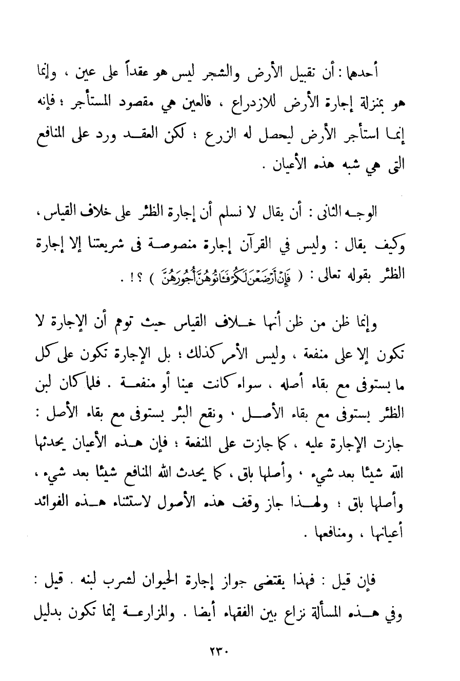 أَحَدُهُمَا: أَنَّ تَقْبِيلَ الْأَرْضِ وَالشَّجَرِ لَيْسَ هُوَ عَقْدًا عَلَى عَيْنٍ وَإِنَّمَا هُوَ بِمَنْزِلَةِ إجَارَةِ الْأَرْضِ لِلِازْدِرَاعِ فَالْعَيْنُ هِيَ مَقْصُودُ الْمُسْتَأْجِرِ؛ فَإِنَّهُ إنَّمَا اسْتَأْجَرَ الْأَرْضَ لِيَحْصُلَ لَهُ الزَّرْعُ؛ لَكِنَّ الْعَقْدَ وَرَدَ عَلَى الْمَنَافِعِ الَّتِي هِيَ شِبْهُ هَذِهِ الْأَعْيَانِ. الْوَجْهُ الثَّانِي: أَنْ يُقَالَ لَا نُسَلِّمُ أَنَّ إجَارَةَ الظِّئْرِ عَلَى خِلَافِ الْقِيَاسِ وَكَيْفَ يُقَالُ: وَلَيْسَ فِي الْقُرْآنِ إجَارَةٌ مَنْصُوصَةٌ فِي شَرِيعَتِنَا إلَّا إجَارَةُ الظِّئْرِ بِقَوْلِهِ تَعَالَى: {فَإِنْ أَرْضَعْنَ لَكُمْ فَآتُوهُنَّ أُجُورَهُنَّ} . وَإِنَّمَا ظَنَّ مَنْ ظَنَّ أَنَّهَا خِلَافَ الْقِيَاسِ حَيْثُ تَوَهَّمَ أَنَّ الْإِجَارَةَ لَا تَكُونُ إلَّا عَلَى مَنْفَعَةٍ وَلَيْسَ الْأَمْرُ كَذَلِكَ؛ بَلْ الْإِجَارَةُ تَكُونُ عَلَى كُلِّ مَا يُسْتَوْفَى مَعَ بَقَاءِ أَصْلِهِ سَوَاءٌ كَانَتْ عَيْنًا أَوْ مَنْفَعَةً. فَلَمَّا كَانَ لَبَنُ الظِّئْرِ يُسْتَوْفَى مَعَ بَقَاءِ الْأَصْلِ وَنَقْعُ الْبِئْرِ يُسْتَوْفَى مَعَ بَقَاءِ الْأَصْلِ: جَازَتْ الْإِجَارَةُ عَلَيْهِ كَمَا جَازَتْ عَلَى الْمَنْفَعَةِ؛ فَإِنَّ هَذِهِ الْأَعْيَانَ يُحْدِثُهَا اللَّهُ شَيْئًا بَعْدَ شَيْءٍ وَأَصْلُهَا بَاقٍ كَمَا يُحْدِثُ اللَّهُ الْمَنَافِعَ شَيْئًا بَعْدَ شَيْءٍ وَأَصْلُهَا بَاقٍ؛ وَلِهَذَا جَازَ وَقْفُ هَذِهِ الْأُصُولِ لِاسْتِثْنَاءِ هَذِهِ الْفَوَائِدِ أَعْيَانِهَا وَمَنَافِعِهَا. فَإِنْ قِيلَ: فَهَذَا يَقْتَضِي جَوَازَ إجَارَةِ الْحَيَوَانِ لِشُرْبِ لَبَنِهِ. قِيلَ: وَفِي هَذِهِ الْمَسْأَلَةِ نِزَاعٌ بَيْنَ الْفُقَهَاءِ أَيْضًا. وَالْمُزَارَعَةُ إنَّمَا تَكُونُ بِدَلِيلِ