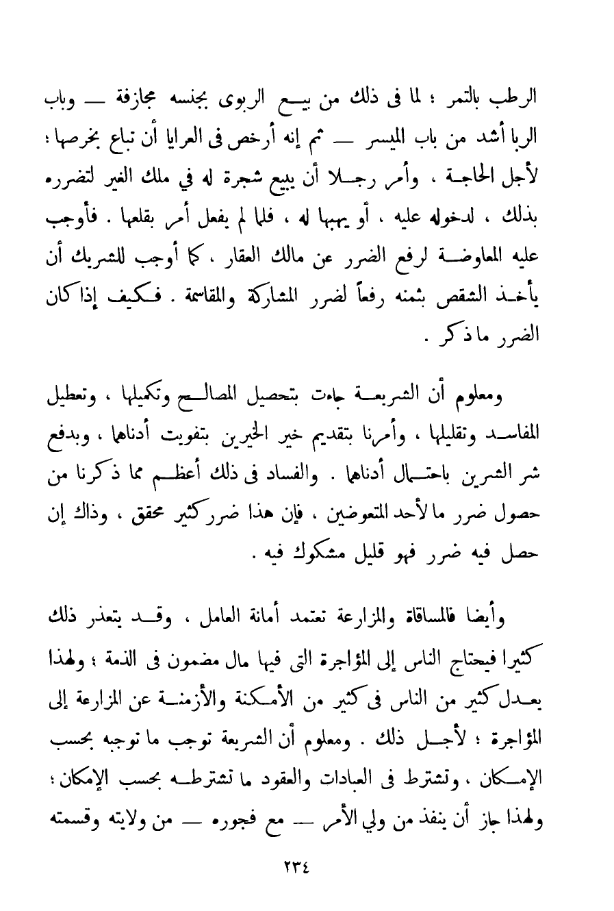 الرُّطَبِ بِالتَّمْرِ؛ لِمَا فِي ذَلِكَ مِنْ بَيْعِ الرِّبَوِيِّ بِجِنْسِهِ مُجَازَفَةً - وَبَابُ الرِّبَا أَشَدُّ مِنْ بَابِ الْمَيْسِرِ - ثُمَّ إنَّهُ أَرْخَصَ فِي الْعَرَايَا أَنْ تُبَاعَ بِخَرْصِهَا؛ لِأَجْلِ الْحَاجَةِ وَأَمَرَ رَجُلًا أَنْ يَبِيعَ شَجَرَةً لَهُ فِي مِلْكِ الْغَيْرِ لِتَضَرُّرِهِ بِذَلِكَ لِدُخُولِهِ عَلَيْهِ أَوْ يَهَبَهَا لَهُ فَلَمَّا لَمْ يَفْعَلْ أُمِرَ بِقَلْعِهَا. فَأَوْجَبَ عَلَيْهِ الْمُعَاوَضَةَ لِرَفْعِ الضَّرَرِ عَنْ مَالِكِ الْعَقَارِ كَمَا أَوْجَبَ لِلشَّرِيكِ أَنْ يَأْخُذَ الشِّقْصَ بِثَمَنِهِ رَفْعًا لِضَرَرِ الْمُشَارَكَةِ وَالْمُقَاسَمَةِ. فَكَيْفَ إذَا كَانَ الضَّرَرُ مَا ذَكَرَ. وَمَعْلُومٌ أَنَّ الشَّرِيعَةَ جَاءَتْ بِتَحْصِيلِ الْمَصَالِحِ وَتَكْمِيلِهَا وَتَعْطِيلِ الْمَفَاسِدِ وَتَقْلِيلِهَا وَأُمِرْنَا بِتَقْدِيمِ خَيْرِ الْخَيْرَيْنِ بِتَفْوِيتِ أَدْنَاهُمَا وَبِدَفْعِ شَرِّ الشَّرَّيْنِ بِاحْتِمَالِ أَدْنَاهُمَا. وَالْفَسَادُ فِي ذَلِكَ أَعْظَمُ مِمَّا ذَكَرْنَا مِنْ حُصُولِ ضَرَرٍ مَا لِأَحَدِ الْمُتَعَوِّضِينَ فَإِنَّ هَذَا ضَرَرٌ كَثِيرٌ مُحَقَّقٌ وَذَاكَ إنْ حَصَلَ فِيهِ ضَرَرٌ فَهُوَ قَلِيلٌ مَشْكُوكٌ فِيهِ. وَأَيْضًا فَالْمُسَاقَاةُ وَالْمُزَارَعَةُ تَعْتَمِدُ أَمَانَةَ الْعَامِلِ وَقَدْ يَتَعَذَّرُ ذَلِكَ كَثِيرًا فَيَحْتَاجُ النَّاسُ إلَى الْمُؤَاجَرَةِ الَّتِي فِيهَا مَالٌ مَضْمُونٌ فِي الذِّمَّةِ؛ وَلِهَذَا يَعْدِلُ كَثِيرٌ مِنْ النَّاسِ فِي كَثِيرٍ مِنْ الْأَمْكِنَةِ وَالْأَزْمِنَةِ عَنْ الْمُزَارَعَةِ إلَى الْمُؤَاجَرَةِ؛ لِأَجْلِ ذَلِكَ وَمَعْلُومٌ أَنَّ الشَّرِيعَةَ تُوجِبُ مَا تُوجِبُهُ بِحَسَبِ الْإِمْكَانِ وَتَشْتَرِطُ فِي الْعِبَادَاتِ وَالْعُقُودِ مَا تَشْتَرِطُهُ بِحَسَبِ الْإِمْكَانِ؛ وَلِهَذَا جَازَ أَنْ يَنْفُذَ مِنْ وَلِيِّ الْأَمْرِ - مَعَ فُجُورِهِ - مِنْ وِلَايَتِهِ وَقِسْمَتِهِ