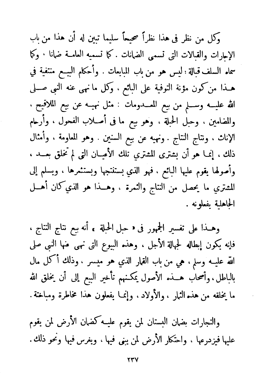 وَكُلُّ مَنْ نَظَرَ فِي هَذَا نَظَرًا صَحِيحًا سَلِيمًا تَبَيَّنَ لَهُ أَنَّ هَذَا مِنْ بَابِ الْإِجَارَاتِ والقبالات الَّتِي تُسَمَّى الضَّمَانَاتِ. كَمَا تُسَمِّيهِ الْعَامَّةُ ضَمَانًا وَكَمَا سَمَّاهُ السَّلَفُ قِبَالَةً؛ لَيْسَ هُوَ مِنْ بَابِ الْمُبَايَعَاتِ. وَأَحْكَامُ الْبَيْعِ مُنْتَفِيَةٌ فِي هَذَا مِنْ كَوْنِ مُؤْنَةِ التَّوْفِيَةِ عَلَى الْبَائِعِ وَكُلُّ مَا نَهَى عَنْهُ النَّبِيُّ صَلَّى اللَّهُ عَلَيْهِ وَسَلَّمَ مِنْ بَيْعِ الْمَعْدُومَاتِ: مِثْلَ نَهْيِهِ عَنْ بَيْعِ الملاقيح وَالْمَضَامِينِ وَحَبَلِ الْحَبَلَةِ وَهُوَ بَيْعُ مَا فِي أَصْلَابِ الْفُحُولِ وَأَرْحَامِ الْإِنَاثِ وَنَتَاجِ النَّتَاجِ. وَنَهْيُهُ عَنْ بَيْعِ السِّنِينَ. وَهُوَ الْمُعَاوَمَةُ وَأَمْثَالُ ذَلِكَ إنَّمَا هُوَ أَنْ يَشْتَرِيَ الْمُشْتَرِيَ تِلْكَ الْأَعْيَانَ الَّتِي لَمْ تُخْلَقْ بَعْدُ وَأُصُولُهَا يَقُومُ عَلَيْهَا الْبَائِعُ فَهُوَ الَّذِي يَسْتَنْتِجُهَا وَيَسْتَثْمِرُهَا وَيُسَلِّمُ إلَى الْمُشْتَرِي مَا يَحْصُلُ مِنْ النَّتَاجِ وَالثَّمَرَةِ وَهَذَا هُوَ الَّذِي كَانَ أَهْلُ الْجَاهِلِيَّةِ يَفْعَلُونَهُ. وَهَذَا عَلَى تَفْسِيرِ الْجُمْهُورِ فِي " حَبَلِ الْحَبَلَةِ " أَنَّهُ بَيْعُ نَتَاجِ النَّتَاجِ فَإِنَّهُ يَكُونُ إبْطَالُهُ لِجَهَالَةِ الْأَجَلِ وَهَذِهِ الْبُيُوعُ الَّتِي نَهَى عَنْهَا النَّبِيُّ صَلَّى اللَّهُ عَلَيْهِ وَسَلَّمَ هِيَ مِنْ بَابِ الْقِمَارِ الَّذِي هُوَ مَيْسِرٌ وَذَلِكَ أَكْلُ مَالٍ بِالْبَاطِلِ وَأَصْحَابُ هَذِهِ الْأُصُولِ يُمْكِنُهُمْ تَأْخِيرُ الْبَيْعِ إلَى أَنْ يَخْلُقَ اللَّهُ مَا يَخْلُقُهُ مِنْ هَذِهِ الثِّمَارِ وَالْأَوْلَادِ وَإِنَّمَا يَفْعَلُونَ هَذَا مُخَاطَرَةً ومباختة. وَالتِّجَارَاتُ بِضَمَانِ الْبُسْتَانِ لِمَنْ يَقُومُ عَلَيْهِ كَضَمَانِ الْأَرْضِ لِمَنْ يَقُومُ عَلَيْهَا فَيَزْدَرِعَهَا وَاحْتِكَارِ الْأَرْضِ لِمَنْ يَبْنِي فِيهَا وَيَغْرِسُ فِيهَا وَنَحْوَ ذَلِكَ.