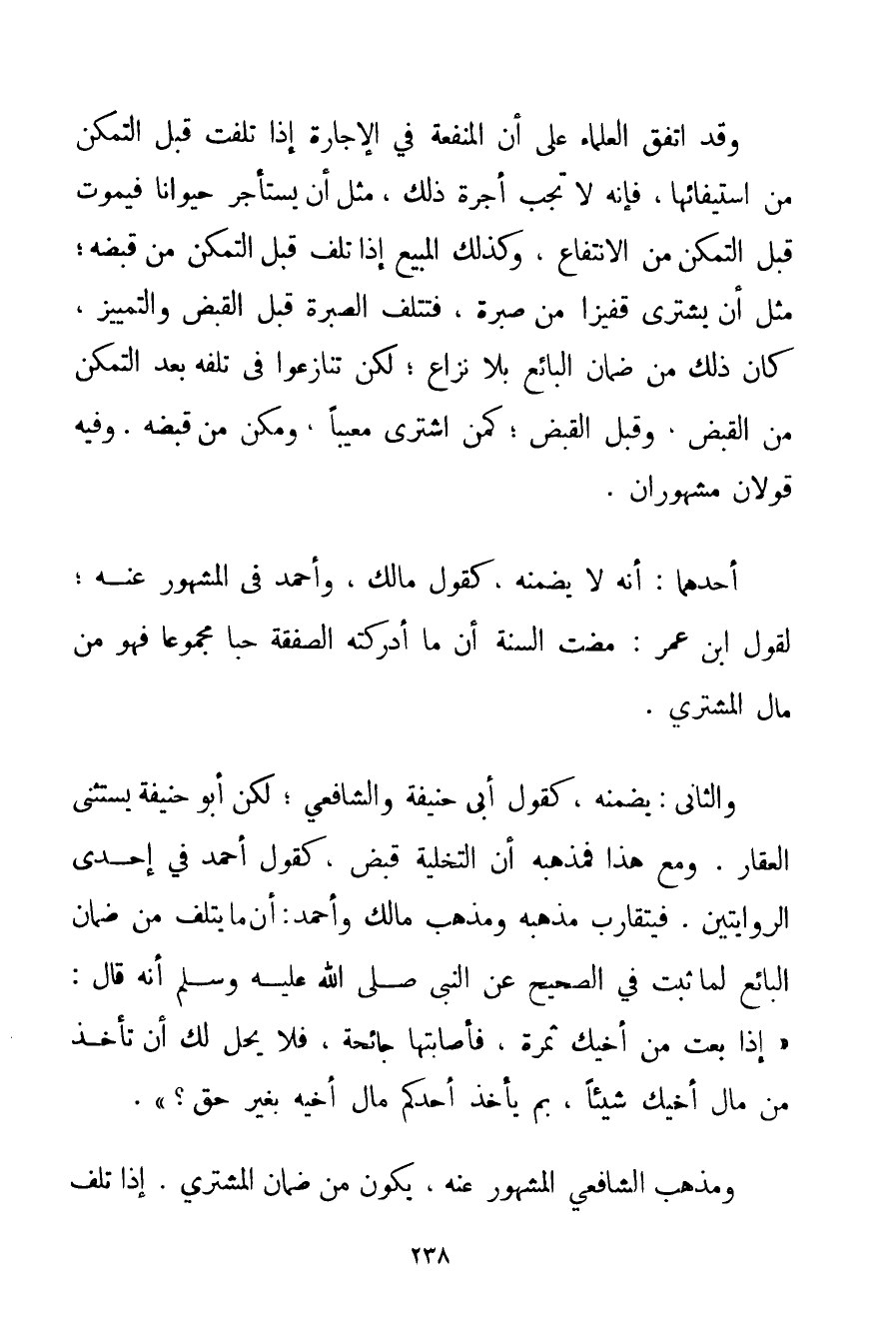وَقَدْ اتَّفَقَ الْعُلَمَاءُ عَلَى أَنَّ الْمَنْفَعَةَ فِي الْإِجَارَةِ إذَا تَلِفَتْ قَبْلَ التَّمَكُّنِ مِنْ اسْتِيفَائِهَا فَإِنَّهُ لَا تَجِبُ أُجْرَةُ ذَلِكَ مِثْلَ أَنْ يَسْتَأْجِرَ حَيَوَانًا فَيَمُوتَ قَبْلَ التَّمَكُّنِ مِنْ الِانْتِفَاعِ وَكَذَلِكَ الْمَبِيع إذَا تَلِفَ قَبْلَ التَّمَكُّنِ مِنْ قَبْضِهِ؛ مِثْلَ أَنْ يَشْتَرِيَ قَفِيزًا مِنْ صُبْرَةٍ فَتَتْلَفُ الصُّبْرَةُ قَبْلَ الْقَبْضِ وَالتَّمْيِيزِ كَانَ ذَلِكَ مِنْ ضَمَانِ الْبَائِعِ بِلَا نِزَاعٍ؛ لَكِنْ تَنَازَعُوا فِي تَلَفِهِ بَعْدَ التَّمَكُّنِ مِنْ الْقَبْضِ. وَقَبْلَ الْقَبْضِ؛ كَمَنْ اشْتَرَى مَعِيبًا وَمُكِّنَ مِنْ قَبْضِهِ. وَفِيهِ قَوْلَانِ مَشْهُورَانِ. أَحَدُهُمَا: أَنَّهُ لَا يَضْمَنُهُ كَقَوْلِ مَالِكٍ وَأَحْمَدَ فِي الْمَشْهُورِ عَنْهُ؛ لِقَوْلِ ابْنِ عُمَرَ: مَضَتْ السُّنَّةُ أَنَّ مَا أَدْرَكَتْهُ الصَّفْقَةُ حَبًّا مَجْمُوعًا فَهُوَ مِنْ مَالِ الْمُشْتَرِي. وَالثَّانِي: يَضْمَنُهُ كَقَوْلِ أَبِي حَنِيفَةَ وَالشَّافِعِيِّ؛ لَكِنْ أَبُو حَنِيفَةَ يَسْتَثْنِي الْعَقَارَ. وَمَعَ هَذَا فَمَذْهَبُهُ أَنَّ التَّخْلِيَةَ قَبْضٌ كَقَوْلِ أَحْمَدَ فِي إحْدَى الرِّوَايَتَيْنِ. فَيَتَقَارَبُ مَذْهَبُهُ وَمَذْهَبُ مَالِكٍ وَأَحْمَدَ: أَنَّ مَا يَتْلَفُ مِنْ ضَمَانِ الْبَائِعِ لِمَا ثَبَتَ فِي الصَّحِيحِ عَنْ النَّبِيِّ صَلَّى اللَّهُ عَلَيْهِ وَسَلَّمَ أَنَّهُ قَالَ: {إذَا بِعْت مِنْ أَخِيك ثَمَرَةً فَأَصَابَتْهَا جَائِحَةٌ فَلَا يَحِلُّ لَك أَنْ تَأْخُذَ مَنْ مَالِ أَخِيك شَيْئًا بِمَ يَأْخُذُ أَحَدُكُمْ مَالَ أَخِيهِ بِغَيْرِ حَقٍّ؟} . وَمَذْهَبُ الشَّافِعِيِّ الْمَشْهُورُ عَنْهُ يَكُونُ مِنْ ضَمَانِ الْمُشْتَرِي. إذَا تَلِفَ