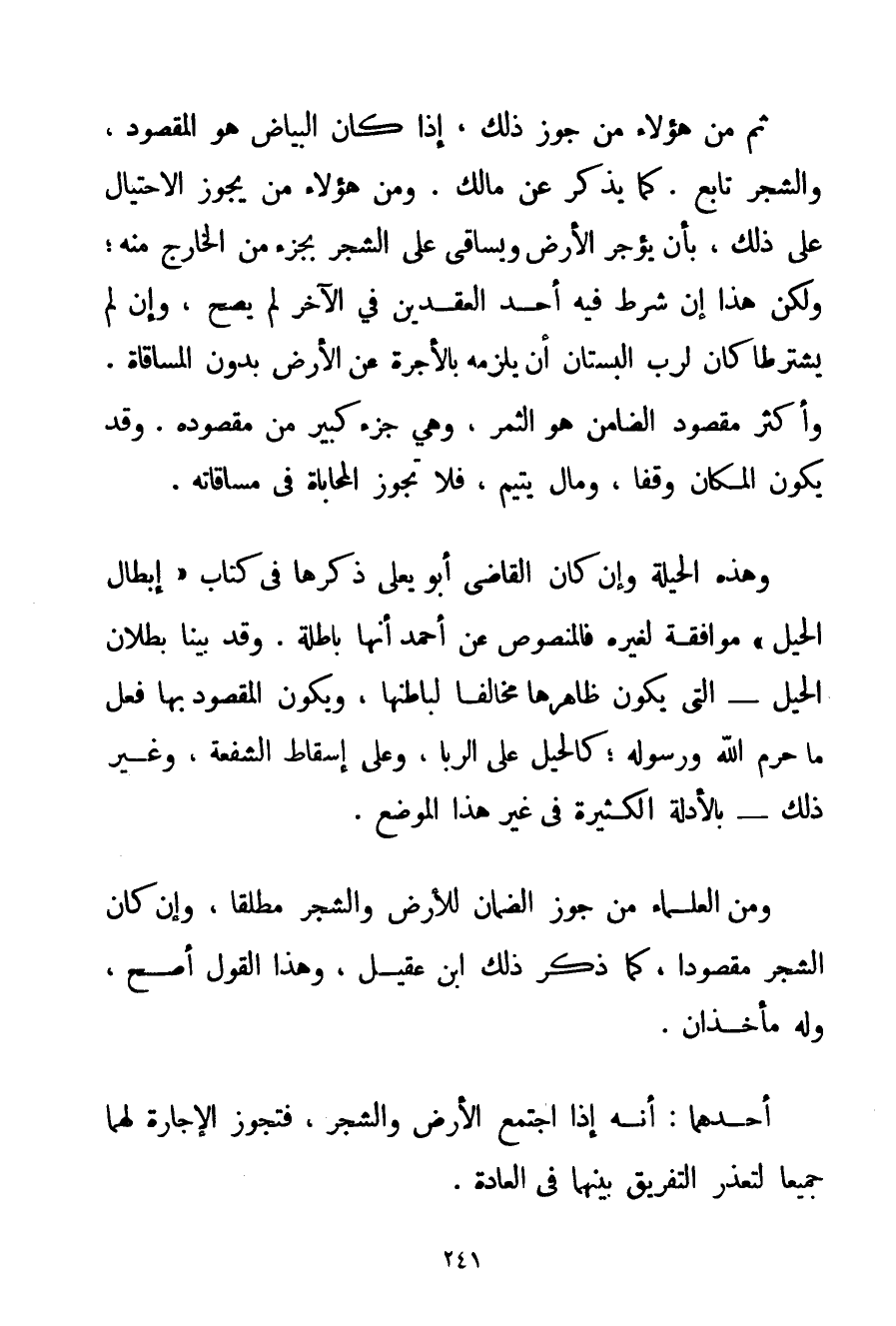 ثُمَّ مِنْ هَؤُلَاءِ مَنْ جَوَّزَ ذَلِكَ إذَا كَانَ الْبَيَاضُ هُوَ الْمَقْصُودُ وَالشَّجَرُ تَابِعٌ كَمَا يُذْكَرُ عَنْ مَالِكٍ. وَمِنْ هَؤُلَاءِ مَنْ يُجَوِّزُ الِاحْتِيَالَ عَلَى ذَلِكَ بِأَنْ يُؤَجِّرَ الْأَرْضَ وَيُسَاقِيَ عَلَى الشَّجَرِ بِجُزْءِ مِنْ الْخَارِجِ مِنْهُ؛ وَلَكِنَّ هَذَا إنْ شُرِطَ فِيهِ أَحَدُ الْعَقْدَيْنِ فِي الْآخَرِ لَمْ يَصِحَّ وَإِنْ لَمْ يَشْتَرِطَا كَانَ لِرَبِّ الْبُسْتَانِ أَنْ يُلْزِمَهُ بِالْأُجْرَةِ عَنْ الْأَرْضِ بِدُونِ الْمُسَاقَاةِ. وَأَكْثَرُ مَقْصُودِ الضَّامِنِ هُوَ الثَّمَرُ وَهِيَ جُزْءٌ كَبِيرٌ مِنْ مَقْصُودِهِ. وَقَدْ يَكُونُ الْمَكَانُ وَقْفًا وَمَالَ يَتِيمٍ فَلَا تَجُوزُ الْمُحَابَاةُ فِي مُسَاقَاتِهِ. وَهَذِهِ الْحِيلَةُ وَإِنْ كَانَ الْقَاضِي أَبُو يَعْلَى ذَكَرَهَا فِي كِتَابِ " إبْطَالِ الْحِيَلِ " مُوَافَقَةً لِغَيْرِهِ فَالْمَنْصُوصُ عَنْ أَحْمَد أَنَّهَا بَاطِلَةٌ. وَقَدْ بَيَّنَّا بُطْلَانَ الْحِيَلِ - الَّتِي يَكُونُ ظَاهِرُهَا مُخَالِفًا لِبَاطِنِهَا وَيَكُونُ الْمَقْصُودُ بِهَا فِعْلَ مَا حَرَّمَ اللَّهُ وَرَسُولُهُ كَالْحِيَلِ عَلَى الرِّبَا وَعَلَى إسْقَاطِ الشُّفْعَةِ وَغَيْرِ ذَلِكَ - بِالْأَدِلَّةِ الْكَثِيرَةِ فِي غَيْرِ هَذَا الْمَوْضِعِ. وَمِنْ الْعُلَمَاءِ مَنْ جَوَّزَ الضَّمَانَ لِلْأَرْضِ وَالشَّجَرِ مُطْلَقًا وَإِنْ كَانَ الشَّجَرُ مَقْصُودًا كَمَا ذَكَرَ ذَلِكَ ابْنُ عَقِيلٍ وَهَذَا الْقَوْلُ أَصَحُّ وَلَهُ مَأْخَذَانِ. أَحَدُهُمَا: أَنَّهُ إذَا اجْتَمَعَ الْأَرْضُ وَالشَّجَرُ فَتَجُوزُ الْإِجَارَةُ لَهُمَا جَمِيعًا لِتَعَذُّرِ التَّفْرِيقِ بَيْنَهُمَا فِي الْعَادَةِ.