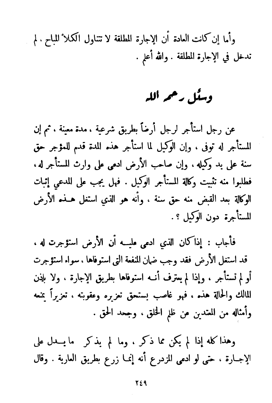 عَنْ رَجُلٍ اسْتَأْجَرَ لِرَجُلِ أَرْضًا بِطَرِيقِ شَرْعِيَّةٍ مُدَّةً مُعَيَّنَةً ثُمَّ إنَّ الْمُسْتَأْجِرَ لَهُ تُوُفِّيَ وَإِنَّ الْوَكِيلَ لَمَّا اسْتَأْجَرَ هَذِهِ الْمُدَّةَ قَدَّمَ لِلْمُؤَجِّرِ حَقَّ سَنَةٍ عَلَى يَدِ وَكِيلِهِ وَإِنَّ صَاحِبَ الْأَرْضِ ادَّعَى عَلَى وَارِثِ الْمُسْتَأْجِرِ لَهُ فَطَلَبُوا مِنْهُ تَثْبِيتَ وِكَالَةَ الْمُسْتَأْجِرِ الْوَكِيلِ. فَهَلْ يَجِبُ عَلَى الْمُدَّعِي إثْبَاتُ الْوِكَالَةِ بَعْدَ الْقَبْضِ مِنْهُ حَقَّ سَنَةٍ وَأَنَّهُ هُوَ الَّذِي اسْتَغَلَّ هَذِهِ الْأَرْضَ الْمُسْتَأْجَرَةَ دُونَ الْوَكِيلِ؟ .