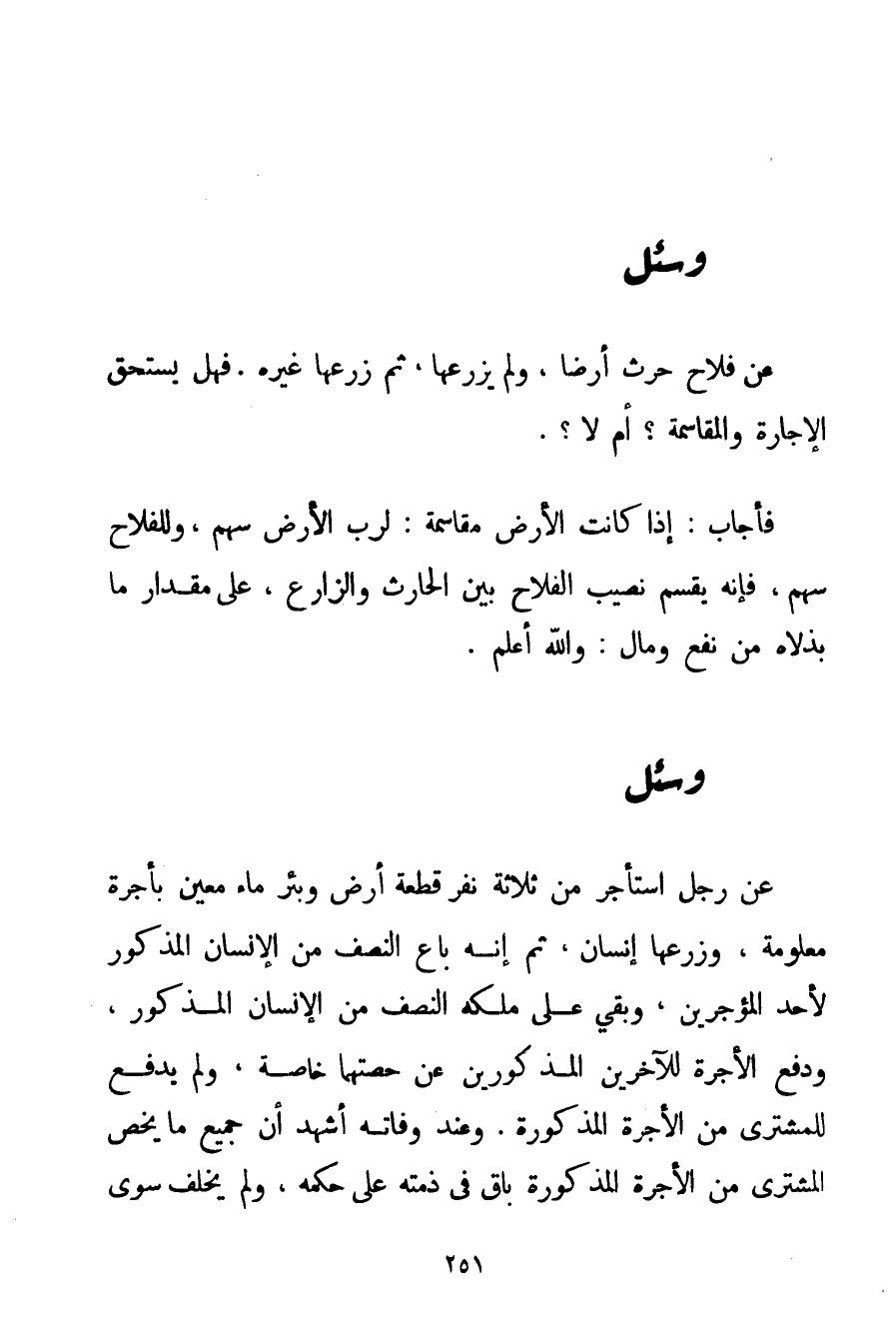 إذَا كَانَتْ الْأَرْضُ مُقَاسَمَةً: لِرَبِّ الْأَرْضِ سَهْمٌ وَلِلْفَلَّاحِ سَهْمٌ فَإِنَّهُ يُقْسَمُ نَصِيبُ الْفَلَّاحِ بَيْنَ الْحَارِثِ وَالزَّارِعِ عَلَى مِقْدَارِ مَا بَذَلَاهُ مِنْ نَفْعٍ وَمَالٍ: وَاَللَّهُ أَعْلَمُ.