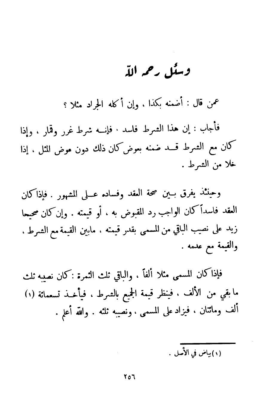 إنَّ هَذَا الشَّرْطَ فَاسِدٌ فَإِنَّهُ شَرْطُ غَرَرٍ وَقِمَارٍ وَإِذَا كَانَ مَعَ الشَّرْطِ قَدْ ضَمِنَهُ بِعِوَضِ كَانَ ذَلِكَ دُونَ عِوَضِ الْمِثْلِ إذَا خَلَا مِنْ الشَّرْطِ. وَحِينَئِذٍ يُفَرَّقُ بَيْنَ صِحَّةِ الْعَقْدِ وَفَسَادِهِ عَلَى الْمَشْهُورِ. فَإِذَا كَانَ الْعَقْدُ فَاسِدًا كَانَ الْوَاجِبُ رَدَّ الْمَقْبُوضِ بِهِ أَوْ قِيمَتِهِ. وَإِنْ كَانَ صَحِيحًا زِيدَ عَلَى نَصِيبِ الْبَاقِي مِنْ الْمُسَمَّى بِقَدْرِ قِيمَتِهِ مَا بَيْنَ الْقِيمَةِ مَعَ الشَّرْطِ وَالْقِيمَةِ مَعَ عَدَمِهِ. فَإِذَا كَانَ الْمُسَمَّى مَثَلًا أَلْفًا وَالْبَاقِي ثُلُثَ الثَّمَرَةِ: كَانَ نَصِيبُهُ ثُلُثَ مَا بَقِيَ مِنْ الْأَلْفِ فَيَنْظُرُ قِيمَةَ الْجَمِيعِ بِالشَّرْطِ فَيَأْخُذُ تِسْعَمِائَةِ. . . (1) أَلْفٍ وَمِائَتَانِ فَيُزَادُ عَلَى الْمُسَمَّى وَنَصِيبِهِ ثُلُثَهُ. وَاَللَّهُ أَعْلَمُ.