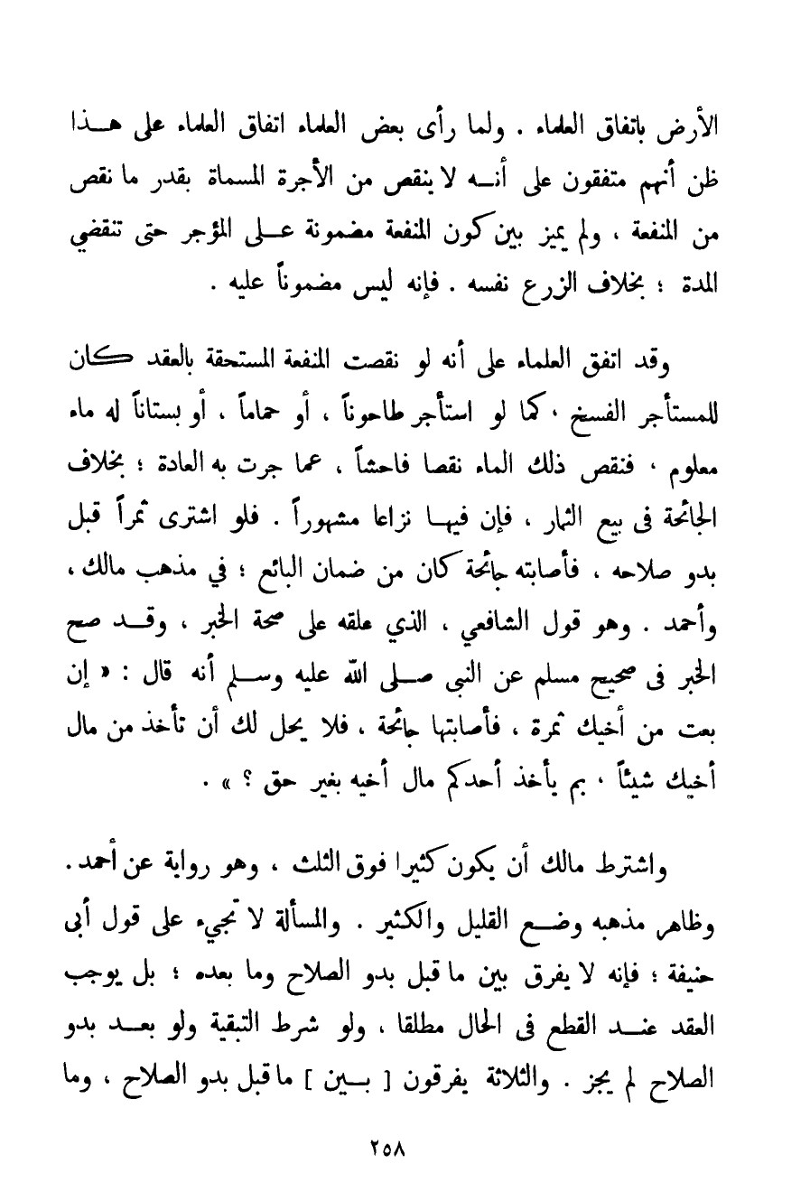 الْأَرْضِ بِاتِّفَاقِ الْعُلَمَاءِ. وَلَمَّا رَأَى بَعْضُ الْعُلَمَاءِ اتِّفَاقَ الْعُلَمَاءِ عَلَى هَذَا ظَنَّ أَنَّهُمْ مُتَّفِقُونَ عَلَى أَنَّهُ لَا يَنْقُصُ مِنْ الْأُجْرَةِ الْمُسَمَّاةِ بِقَدْرِ مَا نَقَصَ مِنْ الْمَنْفَعَةِ وَلَمْ يُمَيِّزْ بَيْنَ كَوْنِ الْمَنْفَعَةِ مَضْمُونَةً عَلَى الْمُؤَجِّرِ حَتَّى تَنْقَضِيَ الْمُدَّةُ؛ بِخِلَافِ الزَّرْعِ نَفْسِهِ. فَإِنَّهُ لَيْسَ مَضْمُونًا عَلَيْهِ. وَقَدْ اتَّفَقَ الْعُلَمَاءُ عَلَى أَنَّهُ لَوْ نَقَصَتْ الْمَنْفَعَةُ الْمُسْتَحَقَّةُ بِالْعَقْدِ كَانَ لِلْمُسْتَأْجِرِ الْفَسْخُ كَمَا لَوْ اسْتَأْجَرَ طَاحُونًا أَوْ حَمَّامًا أَوْ بُسْتَانًا لَهُ مَاءٌ مَعْلُومٌ فَنَقَصَ ذَلِكَ الْمَاءُ نَقْصًا فَاحِشًا عَمَّا جَرَتْ بِهِ الْعَادَةُ؛ بِخِلَافِ الْجَائِحَةِ فِي بَيْعِ الثِّمَارِ فَإِنَّ فِيهَا نِزَاعًا مَشْهُورًا. فَلَوْ اشْتَرَى ثَمَرًا قَبْلَ بُدُوِّ صَلَاحِهِ فَأَصَابَتْهُ جَائِحَةٌ كَانَ مِنْ ضَمَانِ الْبَائِعِ؛ فِي مَذْهَبِ مَالِكٍ وَأَحْمَد. وَهُوَ قَوْلُ الشَّافِعِيِّ الَّذِي عَلَّقَهُ عَلَى صِحَّةِ الْخَبَرِ وَقَدْ صَحَّ الْخَبَرُ فِي صَحِيحِ مُسْلِمٍ عَنْ النَّبِيِّ صَلَّى اللَّهُ عَلَيْهِ وَسَلَّمَ أَنَّهُ قَالَ: {إنْ بِعْت مِنْ أَخِيك ثَمَرَةً فَأَصَابَتْهَا جَائِحَةٌ فَلَا يَحِلُّ لَك أَنْ تَأْخُذَ مِنْ مَالِ أَخِيك شَيْئًا بِمَ يَأْخُذُ أَحَدُكُمْ مَالَ أَخِيهِ بِغَيْرِ حَقٍّ؟} . وَاشْتَرَطَ مَالِكٍ أَنْ يَكُونَ كَثِيرًا فَوْقَ الثُّلُثِ وَهُوَ رِوَايَةٌ عَنْ أَحْمَد. وَظَاهِرُ مَذْهَبِهِ وَضْعُ الْقَلِيلِ وَالْكَثِيرِ. وَالْمَسْأَلَةُ لَا تَجِيءُ عَلَى قَوْلِ أَبِي حَنِيفَةَ؛ فَإِنَّهُ لَا يُفَرِّقُ بَيْنَ مَا قَبْلَ بُدُوِّ الصَّلَاحِ وَمَا بَعْدَهُ؛ بَلْ يُوجِبُ الْعَقْدَ عِنْدَ الْقَطْعِ فِي الْحَالِ مُطْلَقًا وَلَوْ شَرَطَ التَّبْقِيَةَ وَلَوْ بَعْدَ بُدُوِّ الصَّلَاحِ لَمْ يَجُزْ. وَالثَّلَاثَةُ يُفَرِّقُونَ بَيْنَ مَا قَبْلَ بُدُوِّ الصَّلَاحِ وَمَا