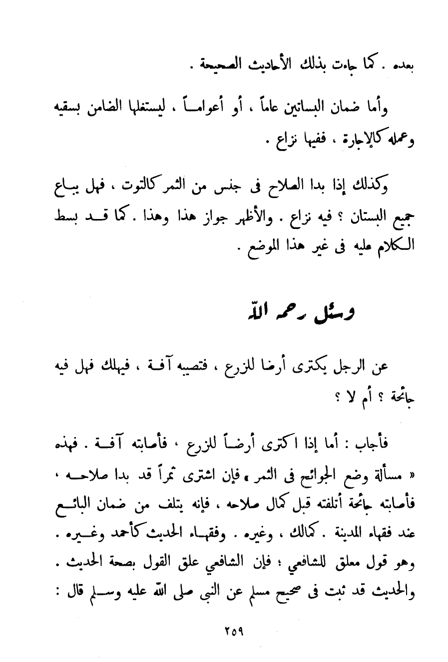 بَعْدَهُ. كَمَا جَاءَتْ بِذَلِكَ الْأَحَادِيثُ الصَّحِيحَةُ. وَأَمَّا ضَمَانُ الْبَسَاتِينِ عَامًا أَوْ أَعْوَامًا لِيَسْتَغِلَّهَا الضَّامِنُ بِسَقْيِهِ وَعَمَلِهِ كَالْإِجَارَةِ فَفِيهَا نِزَاعٌ. وَكَذَلِكَ إذَا بَدَا الصَّلَاحُ فِي جِنْسٍ مِنْ الثَّمَرِ كَالتُّوتِ فَهَلْ يُبَاعُ جَمِيعُ الْبُسْتَانِ؟ فِيهِ نِزَاعٌ. وَالْأَظْهَرُ جَوَازُ هَذَا وَهَذَا. كَمَا قَدْ بُسِطَ الْكَلَامُ عَلَيْهِ فِي غَيْرِ هَذَا الْمَوْضِعِ.