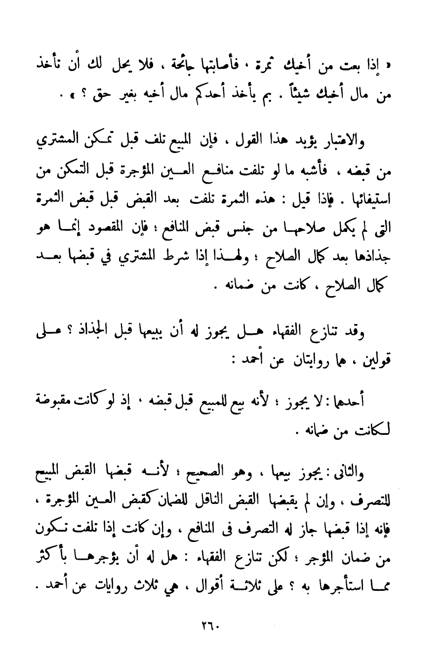 {إذَا بِعْت مِنْ أَخِيك ثَمَرَةً فَأَصَابَتْهَا جَائِحَةٌ فَلَا يَحِلُّ لَك أَنْ تَأْخُذَ مِنْ مَالِ أَخِيك شَيْئًا. بِمَ يَأْخُذُ أَحَدُكُمْ مَالَ أَخِيهِ بِغَيْرِ حَقٍّ؟} . وَالِاعْتِبَارُ يُؤَيِّدُ هَذَا الْقَوْلَ فَإِنَّ الْمَبِيع تَلِفَ قَبْلَ تَمَكُّنِ الْمُشْتَرِي مِنْ قَبْضِهِ فَأَشْبَهَ مَا لَوْ تَلِفَتْ مَنَافِعُ الْعَيْنِ الْمُؤَجَّرَةِ قَبْلَ التَّمَكُّنِ مِنْ اسْتِيفَائِهَا. فَإِذَا قِيلَ: هَذِهِ الثَّمَرَةُ تَلِفَتْ بَعْدَ الْقَبْضِ قَبْلَ قَبْضِ الثَّمَرَةِ الَّتِي لَمْ يَكْمُلْ صَلَاحُهَا مِنْ جِنْسِ قَبْضِ الْمَنَافِعِ؛ فَإِنَّ الْمَقْصُودَ إنَّمَا هُوَ جِذَاذُهَا بَعْدَ كَمَالِ الصَّلَاحِ؛ وَلِهَذَا إذَا شَرَطَ الْمُشْتَرِي فِي قَبْضِهَا بَعْدَ كَمَالِ الصَّلَاحِ كَانَتْ مِنْ ضَمَانِهِ. وَقَدْ تَنَازَعَ الْفُقَهَاء هَلْ يَجُوزُ لَهُ أَنْ يَبِيعَهَا قَبْلَ الْجِذَاذِ؟ عَلَى قَوْلَيْنِ هُمَا رِوَايَتَانِ عَنْ أَحْمَدَ: أَحَدُهُمَا: لَا يَجُوزُ؛ لِأَنَّهُ بَيْعٌ لِلْمَبِيعِ قَبْلَ قَبْضِهِ إذْ لَوْ كَانَتْ مَقْبُوضَةً لَكَانَتْ مِنْ ضَمَانِهِ. وَالثَّانِي: يَجُوزُ بَيْعُهَا وَهُوَ الصَّحِيحُ؛ لِأَنَّهُ قَبَضَهَا الْقَبْضَ الْمُبِيحَ لِلتَّصَرُّفِ وَإِنْ لَمْ يَقْبِضْهَا الْقَبْضَ النَّاقِلَ لِلضَّمَانِ كَقَبْضِ الْعَيْنِ الْمُؤَجَّرَةِ فَإِنَّهُ إذَا قَبَضَهَا جَازَ لَهُ التَّصَرُّفُ فِي الْمَنَافِعِ وَإِنْ كَانَتْ إذَا تَلِفَتْ تَكُونُ مِنْ ضَمَانِ الْمُؤَجِّرِ؛ لَكِنْ تَنَازَعَ الْفُقَهَاءُ: هَلْ لَهُ أَنْ يُؤَجِّرَهَا بِأَكْثَرِ مِمَّا اسْتَأْجَرَهَا بِهِ؟ عَلَى ثَلَاثَةِ أَقْوَالٍ هِيَ ثَلَاثُ رِوَايَاتٍ عَنْ أَحْمَدَ.
