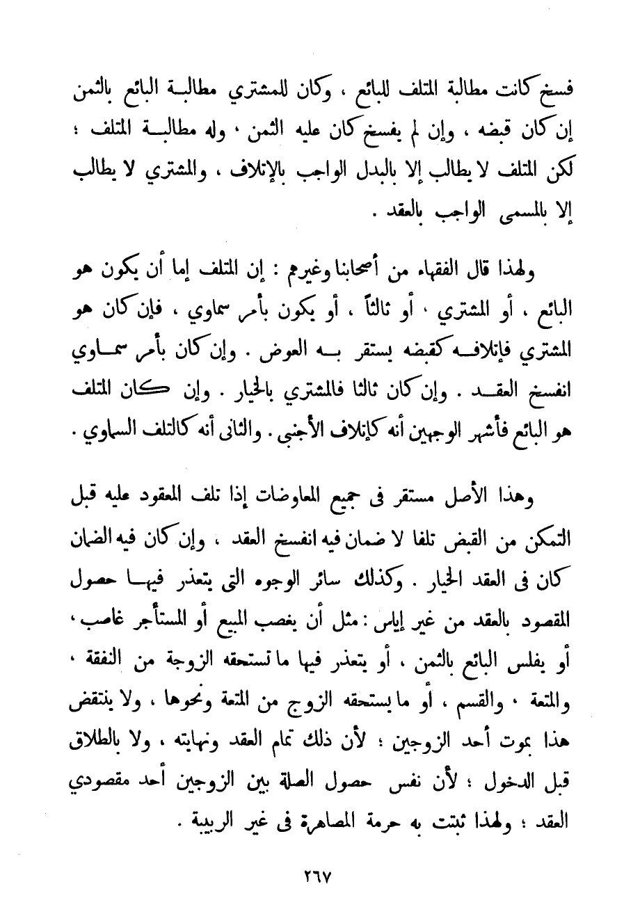فَسَخَ كَانَتْ مُطَالَبَةُ الْمُتْلِفِ لِلْبَائِعِ وَكَانَ لِلْمُشْتَرِي مُطَالَبَةُ الْبَائِعِ بِالثَّمَنِ إنْ كَانَ قَبَضَهُ وَإِنْ لَمْ يَفْسَخْ كَانَ عَلَيْهِ الثَّمَنُ وَلَهُ مُطَالَبَةُ الْمُتْلِفِ؛ لَكِنَّ الْمُتْلِفَ لَا يُطَالَبُ إلَّا بِالْبَدَلِ الْوَاجِبِ بِالْإِتْلَافِ وَالْمُشْتَرِي لَا يُطَالِبُ إلَّا بِالْمُسَمَّى الْوَاجِبِ بِالْعَقْدِ. وَلِهَذَا قَالَ الْفُقَهَاءُ مِنْ أَصْحَابِنَا وَغَيْرِهِمْ: إنَّ الْمُتْلِفَ إمَّا أَنْ يَكُونَ هُوَ الْبَائِعَ أَوْ الْمُشْتَرِيَ أَوْ ثَالِثًا أَوْ يَكُونَ بِأَمْرِ سَمَاوِيٍّ فَإِنْ كَانَ هُوَ الْمُشْتَرِيَ فَإِتْلَافُهُ كَقَبْضِهِ يَسْتَقِرُّ بِهِ الْعِوَضُ. وَإِنْ كَانَ بِأَمْرِ سَمَاوِيٍّ انْفَسَخَ الْعَقْدُ. وَإِنْ كَانَ ثَالِثًا فَالْمُشْتَرِي بِالْخِيَارِ. وَإِنْ كَانَ الْمُتْلِفُ هُوَ الْبَائِعُ فَأَشْهَرُ الْوَجْهَيْنِ أَنَّهُ كَإِتْلَافِ الْأَجْنَبِيِّ. وَالثَّانِي أَنَّهُ كَالتَّلَفِ السَّمَاوِيِّ. وَهَذَا الْأَصْلُ مُسْتَقِرٌّ فِي جَمِيعِ الْمُعَاوَضَاتِ إذَا تَلِفَ الْمَعْقُودُ عَلَيْهِ قَبْلَ التَّمَكُّنِ مِنْ الْقَبْضِ تَلَفًا لَا ضَمَانَ فِيهِ انْفَسَخَ الْعَقْدُ وَإِنْ كَانَ فِيهِ الضَّمَانُ كَانَ فِي الْعَقْدِ الْخِيَارُ. وَكَذَلِكَ سَائِر الْوُجُوهِ الَّتِي يَتَعَذَّرُ فِيهَا حُصُولُ الْمَقْصُودِ بِالْعَقْدِ مِنْ غَيْرِ إيَاسٍ: مِثْلَ أَنْ يَغْصِبَ الْمَبِيع أَوْ الْمُسْتَأْجَرَ غَاصِبٌ أَوْ يُفْلِسَ الْبَائِعُ بِالثَّمَنِ أَوْ يَتَعَذَّرُ فِيهَا مَا تَسْتَحِقُّهُ الزَّوْجَةُ مِنْ النَّفَقَةِ وَالْمُتْعَةِ وَالْقَسْمِ أَوْ مَا يَسْتَحِقُّهُ الزَّوْجُ مِنْ الْمُتْعَةِ وَنَحْوِهَا وَلَا يُنْتَقَضُ هَذَا بِمَوْتِ أَحَدِ الزَّوْجَيْنِ؛ لِأَنَّ ذَلِكَ تَمَامُ الْعَقْدِ وَنِهَايَتُهُ وَلَا بِالطَّلَاقِ قَبْلَ الدُّخُولِ؛ لِأَنَّ نَفْسَ حُصُولِ الصِّلَةِ بَيْنَ الزَّوْجَيْنِ أَحَدُ مَقْصُودَيْ الْعَقْدِ؛ وَلِهَذَا ثَبَتَتْ بِهِ حُرْمَةُ الْمُصَاهَرَةِ فِي غَيْرِ الرَّبِيبَةِ.