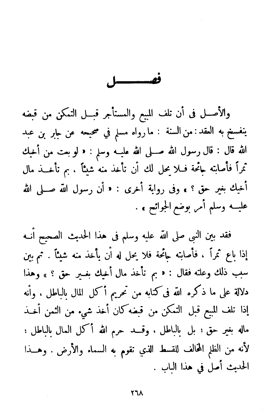 وَالْأَصْلُ فِي أَنَّ تَلَفَ الْمَبِيع وَالْمُسْتَأْجَرِ قَبْلَ التَّمَكُّنِ مِنْ قَبْضِهِ يَنْفَسِخُ بِهِ الْعَقْدُ: مِنْ السُّنَّةِ: مَا رَوَاهُ مُسْلِمٌ فِي صَحِيحِهِ عَنْ جَابِرِ بْنِ عَبْدِ اللَّهِ قَالَ: قَالَ رَسُولُ اللَّهِ صَلَّى اللَّهُ عَلَيْهِ وَسَلَّمَ {لَوْ بِعْت مِنْ أَخِيك ثَمَرًا فَأَصَابَتْهُ جَائِحَةٌ فَلَا يَحِلُّ لَك أَنْ تَأْخُذَ مِنْهُ شَيْئًا بِمَ تَأْخُذُ مَالَ أَخِيك بِغَيْرِ حَقٍّ؟} وَفِي رِوَايَةٍ أُخْرَى: {أَنَّ رَسُولَ اللَّهِ صَلَّى اللَّهُ عَلَيْهِ وَسَلَّمَ أَمَرَ بِوَضْعِ الْجَوَائِحِ} . فَقَدْ بَيَّنَ النَّبِيُّ صَلَّى اللَّهُ عَلَيْهِ وَسَلَّمَ فِي هَذَا الْحَدِيثِ الصَّحِيحِ أَنَّهُ إذَا بَاعَ ثَمَرًا فَأَصَابَتْهُ جَائِحَةٌ فَلَا يَحِلُّ لَهُ أَنْ يَأْخُذَ مِنْهُ شَيْئًا. ثُمَّ بَيَّنَ سَبَبَ ذَلِكَ وَعِلَّتَهُ فَقَالَ: {بِمَ تَأْخُذُ مَالَ أَخِيك بِغَيْرِ حَقٍّ؟} وَهَذَا دَلَالَةٌ عَلَى مَا ذَكَرَهُ اللَّهُ فِي كِتَابِهِ مِنْ تَحْرِيمِ أَكْلِ الْمَالِ بِالْبَاطِلِ وَأَنَّهُ إذَا تَلِفَ الْمَبِيع قَبْلَ التَّمَكُّنِ مِنْ قَبْضِهِ كَانَ أَخْذُ شَيْءٍ مِنْ الثَّمَنِ أَخْذَ مَالِهِ بِغَيْرِ حَقٍّ؛ بَلْ بِالْبَاطِلِ وَقَدْ حَرَّمَ اللَّهُ أَكْلَ الْمَالِ بِالْبَاطِلِ؛ لِأَنَّهُ مِنْ الظُّلْمِ الْمُخَالِفِ لِلْقِسْطِ الَّذِي تَقُومُ بِهِ السَّمَاءُ وَالْأَرْضُ. وَهَذَا الْحَدِيثُ أَصْلٌ فِي هَذَا الْبَابِ.