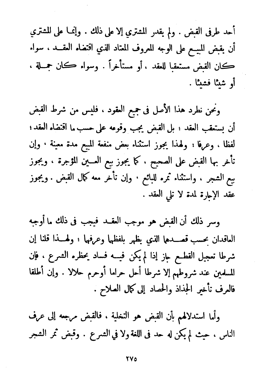 أَحَدُ طَرَفَيْ الْقَبْضِ. وَلَمْ يَقْدِرْ الْمُشْتَرِي إلَّا عَلَى ذَلِكَ. وَإِنَّمَا عَلَى الْمُشْتَرِي أَنْ يَقْبِضَ الْمَبِيع عَلَى الْوَجْهِ الْمَعْرُوفِ الْمُعْتَادِ الَّذِي اقْتَضَاهُ الْعَقْدُ سَوَاءٌ كَانَ الْقَبْضُ مُسْتَعْقِبًا لِلْعَقْدِ أَوْ مُسْتَأْخِرًا. وَسَوَاءٌ كَانَ جُمْلَةً أَوْ شَيْئًا فَشَيْئًا. وَنَحْنُ نَطْرُدُ هَذَا الْأَصْلَ فِي جَمِيعِ الْعُقُودِ فَلَيْسَ مِنْ شَرْطِ الْقَبْضِ أَنْ يَسْتَعْقِبَ الْعَقْدَ؛ بَلْ الْقَبْضُ يَجِبُ وُقُوعُهُ عَلَى حَسَبِ مَا اقْتَضَاهُ الْعَقْدُ؛ لَفْظًا وَعُرْفًا؛ وَلِهَذَا يَجُوزُ اسْتِثْنَاءُ بَعْضِ مَنْفَعَةِ الْمَبِيع مُدَّةً مُعَيَّنَةً وَإِنْ تَأَخَّرَ بِهَا الْقَبْضُ عَلَى الصَّحِيحِ كَمَا يَجُوزُ بَيْعُ الْعَيْنِ الْمُؤَجَّرَةِ وَيَجُوزُ بَيْعُ الشَّجَرِ وَاسْتِثْنَاءُ ثَمَرِهِ لِلْبَائِعِ وَإِنْ تَأَخَّرَ مَعَهُ كَمَالُ الْقَبْضِ. وَيَجُوزُ عَقْدُ الْإِجَارَةِ لِمُدَّةِ لَا تَلِي الْعَقْدَ. وَسِرُّ ذَلِكَ أَنَّ الْقَبْضَ هُوَ مُوجَبُ الْعَقْدِ فَيَجِبُ فِي ذَلِكَ مَا أَوَجَبَهُ الْعَاقِدَانِ بِحَسَبِ قَصْدِهِمَا الَّذِي يَظْهَرُ بِلَفْظِهِمَا وَعُرْفِهِمَا؛ وَلِهَذَا قُلْنَا إنْ شَرَطَا تَعْجِيلَ الْقَطْعِ جَازَ إذَا لَمْ يَكُنْ فِيهِ فَسَادٌ يَحْظُرُهُ الشَّرْعُ فَإِنَّ الْمُسْلِمِينَ عِنْدَ شُرُوطِهِمْ إلَّا شَرْطًا أَحَلَّ حَرَامًا أَوْ حَرَّمَ حَلَالًا. وَإِنْ أَطْلَقَا فَالْعُرْفُ تَأْخِيرُ الْجِذَاذِ وَالْحَصَادِ إلَى كَمَالِ الصَّلَاحِ. وَأَمَّا اسْتِدْلَالُهُمْ بِأَنَّ الْقَبْضَ هُوَ التَّخْلِيَةُ فَالْقَبْضُ مَرْجِعُهُ إلَى عُرْفِ النَّاسِ حَيْثُ لَمْ يَكُنْ لَهُ حَدٌّ فِي اللُّغَةِ وَلَا فِي الشَّرْعِ. وَقَبْضُ ثَمَرِ الشَّجَرِ