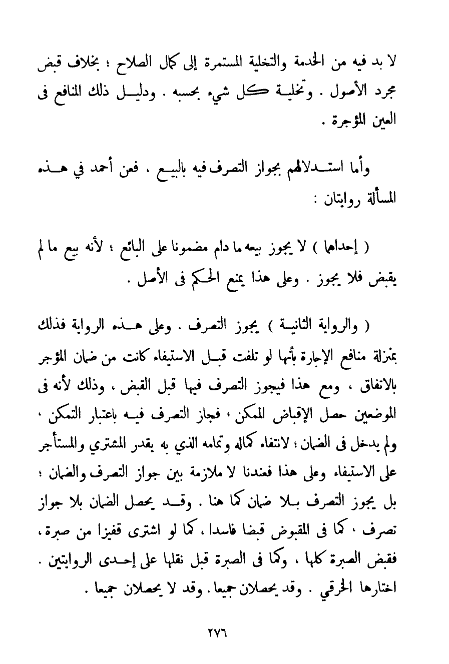 وَالرِّوَايَةُ الثَّانِيَةُ يَجُوزُ التَّصَرُّفُ. وَعَلَى هَذِهِ الرِّوَايَةِ فَذَلِكَ بِمَنْزِلَةِ مَنَافِعِ الْإِجَارَةِ بِأَنَّهَا لَوْ تَلِفَتْ قَبْلَ الِاسْتِيفَاءِ كَانَتْ مِنْ ضَمَانِ الْمُؤَجَّرِ بِالِاتِّفَاقِ وَمَعَ هَذَا فَيَجُوزُ التَّصَرُّفُ فِيهَا قَبْلَ الْقَبْضِ وَذَلِكَ لِأَنَّهُ فِي الْمَوْضِعَيْنِ حَصَلَ الْإِقْبَاضُ الْمُمْكِنُ فَجَازَ التَّصَرُّفُ فِيهِ بِاعْتِبَارِ التَّمَكُّنِ وَلَمْ يَدْخُلْ فِي الضَّمَانِ؛ لِانْتِفَاءِ كَمَالِهِ وَتَمَامِهِ الَّذِي بِهِ يَقْدِرُ الْمُشْتَرِي وَالْمُسْتَأْجِرُ عَلَى الِاسْتِيفَاءِ وَعَلَى هَذَا فَعِنْدَنَا لَا مُلَازَمَةَ بَيْنَ جَوَازِ التَّصَرُّفِ وَالضَّمَانِ؛ بَلْ يَجُوزُ التَّصَرُّفُ بِلَا ضَمَانٍ كَمَا هُنَا. وَقَدْ يَحْصُلُ الضَّمَانُ بِلَا جَوَازِ تَصَرُّفٍ كَمَا فِي الْمَقْبُوضِ قَبْضًا فَاسِدًا كَمَا لَوْ اشْتَرَى قَفِيزًا مِنْ صُبْرَةٍ فَقَبَضَ الصُّبْرَةَ كُلَّهَا وَكَمَا فِي الصُّبْرَةِ قَبْلَ نَقْلِهَا عَلَى إحْدَى الرِّوَايَتَيْنِ. اخْتَارَهَا الخرقي. وَقَدْ يَحْصُلَانِ جَمِيعًا. وَقَدْ لَا يَحْصُلَانِ جَمِيعًا.
