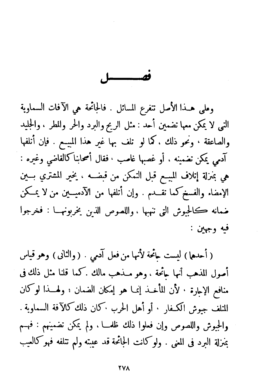 وَالثَّانِي: وَهُوَ قِيَاسُ أُصُولِ الْمَذْهَبِ أَنَّهَا جَائِحَةٌ وَهُوَ مَذْهَبُ مَالِكٍ. كَمَا قُلْنَا مِثْلَ ذَلِكَ فِي مَنَافِعِ الْإِجَارَةِ لِأَنَّ الْمَأْخَذَ إنَّمَا هُوَ إمْكَانُ الضَّمَانِ؛ وَلِهَذَا لَوْ كَانَ الْمُتْلِفُ جُيُوشَ الْكُفَّارِ أَوْ أَهْلَ الْحَرْبِ كَانَ ذَلِكَ كَالْآفَةِ السَّمَاوِيَّةِ. وَالْجُيُوشِ وَاللُّصُوصِ وَإِنْ فَعَلُوا ذَلِكَ ظُلْمًا وَلَمْ يُمْكِنْ تَضْمِينُهُمْ: فَهُمْ بِمَنْزِلَةِ الْبَرْدِ فِي الْمَعْنَى. وَلَوْ كَانَتْ الْجَائِحَةُ قَدْ عَيَّبَتْهُ وَلَمْ تُتْلِفْهُ فَهُوَ كَالْعَيْبِ