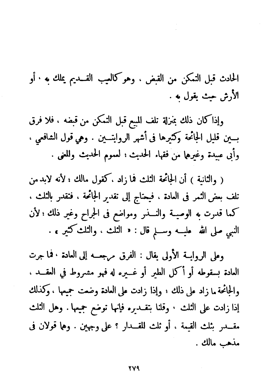 الْحَادِثِ قَبْلَ التَّمَكُّنِ مِنْ الْقَبْضِ وَهُوَ كَالْعَيْبِ الْقَدِيمِ يَمْلِكُ بِهِ أَوْ الْأَرْشِ حَيْثُ يَقُولُ بِهِ. وَإِذَا كَانَ ذَلِكَ بِمَنْزِلَةِ تَلَفِ الْمَبِيع قَبْلَ التَّمَكُّنِ مِنْ قَبْضِهِ فَلَا فَرْقَ بَيْنَ قَلِيلِ الْجَائِحَةِ وَكَثِيرِهَا فِي أَشْهَرِ الرِّوَايَتَيْنِ. وَهِيَ قَوْلُ الشَّافِعِيِّ وَأَبِي عُبَيْدَةَ وَغَيْرِهِمَا مِنْ فُقَهَاءِ الْحَدِيثِ؛ لِعُمُومِ الْحَدِيثِ وَالْمَعْنَى. وَالثَّانِيَةُ أَنَّ الْجَائِحَةَ الثُّلُثُ فَمَا زَادَ كَقَوْلِ مَالِكٍ؛ لِأَنَّهُ لَا بُدَّ مِنْ تَلَفِ بَعْضِ الثَّمَرِ فِي الْعَادَةِ فَيَحْتَاجُ إلَى تَقْدِيرِ الْجَائِحَةِ فَتُقَدَّرُ بِالثُّلُثِ كَمَا قُدِّرَتْ بِهِ الْوَصِيَّةُ وَالنُّذُرُ وَمَوَاضِعُ فِي الْجِرَاحِ وَغَيْرِ ذَلِكَ؛ لِأَنَّ النَّبِيَّ صَلَّى اللَّهُ عَلَيْهِ وَسَلَّمَ قَالَ: {الثُّلُثُ وَالثُّلُثُ كَثِيرٌ} . وَعَلَى الرِّوَايَةِ الْأُولَى يُقَالُ: الْفَرْقُ مَرْجِعُهُ إلَى الْعَادَةِ فَمَا جَرَتْ الْعَادَةُ بِسُقُوطِهِ أَوْ أَكَلَ الطَّيْرُ أَوْ غَيْرُهُ لَهُ فَهُوَ مَشْرُوطٌ فِي الْعَقْدِ وَالْجَائِحَةُ مَا زَادَ عَلَى ذَلِكَ؛ وَإِذَا زَادَتْ عَلَى الْعَادَةِ وُضِعَتْ جَمِيعُهَا وَكَذَلِكَ إذَا زَادَتْ عَلَى الثُّلُثِ وَقُلْنَا بِتَقْدِيرِهِ فَإِنَّهَا تُوضَعُ جَمِيعُهَا. وَهَلْ الثُّلُثُ مُقَدَّرٌ بِثُلُثِ الْقِيمَةِ أَوْ ثُلُثِ الْمِقْدَارِ؟ عَلَى وَجْهَيْنِ. وَهُمَا قَوْلَانِ فِي مَذْهَبِ مَالِكٍ.