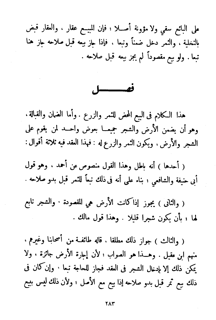 هَذَا الْكَلَامُ فِي الْبَيْعِ الْمَحْضِ لِلثَّمَرِ وَالزَّرْعِ. وَأَمَّا الضَّمَانُ وَالْقَبَالَةُ وَهُوَ أَنْ يَضْمَنَ الْأَرْضَ وَالشَّجَرَ جَمِيعًا بِعِوَضِ وَاحِدٍ لِمَنْ يَقُومُ عَلَى الشَّجَرِ وَالْأَرْضِ وَيَكُونُ الثَّمَرُ وَالزَّرْعُ لَهُ: فَهَذَا الْعَقْدُ فِيهِ ثَلَاثَةُ أَقْوَالٍ: (أَحَدُهَا أَنَّهُ بَاطِلٌ وَهَذَا الْقَوْلُ مَنْصُوصٌ عَنْ أَحْمَدَ وَهُوَ قَوْلُ أَبِي حَنِيفَةَ وَالشَّافِعِيِّ؛ بِنَاءً عَلَى أَنَّهُ فِي ذَلِكَ تَبَعًا لِلثَّمَرِ قَبْلَ بُدُوِّ صَلَاحِهِ.