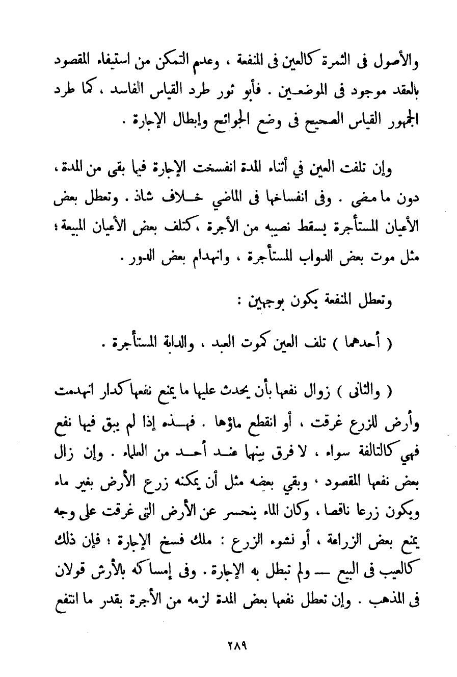 وَالْأُصُولُ فِي الثَّمَرَةِ كَالْعَيْنِ فِي الْمَنْفَعَةِ وَعَدَمُ التَّمَكُّنِ مِنْ اسْتِيفَاءِ الْمَقْصُودِ بِالْعَقْدِ مَوْجُودٌ فِي الْمَوْضِعَيْنِ. فَأَبُو ثَوْرٍ طَرَدَ الْقِيَاسَ الْفَاسِدَ كَمَا طَرَدَ الْجُمْهُورُ الْقِيَاسَ الصَّحِيحَ فِي وَضْعِ الْجَوَائِحِ وَإِبْطَالِ الْإِجَارَةِ. وَإِنْ تَلِفَتْ الْعَيْنُ فِي أَثْنَاءِ الْمُدَّةِ انْفَسَخَتْ الْإِجَارَةُ فِيمَا بَقِيَ مِنْ الْمُدَّةِ دُونَ مَا مَضَى. وَفِي انْفِسَاخِهَا فِي الْمَاضِي خِلَافٌ شَاذٌّ. وَتَعَطُّلُ بَعْضِ الْأَعْيَانِ الْمُسْتَأْجَرَةِ يُسْقِطُ نَصِيبَهُ مِنْ الْأُجْرَةِ كَتَلَفِ بَعْضِ الْأَعْيَانِ الْمَبِيعَةِ؛ مِثْلَ مَوْتِ بَعْضِ الدَّوَابِّ الْمُسْتَأْجَرَةِ وَانْهِدَامِ بَعْضِ الدُّورِ. وَتَعَطُّلُ الْمَنْفَعَةِ يَكُونُ بِوَجْهَيْنِ: (أَحَدُهُمَا تَلَفُ الْعَيْنِ كَمَوْتِ الْعَبْدِ وَالدَّابَّةِ الْمُسْتَأْجَرَةِ.