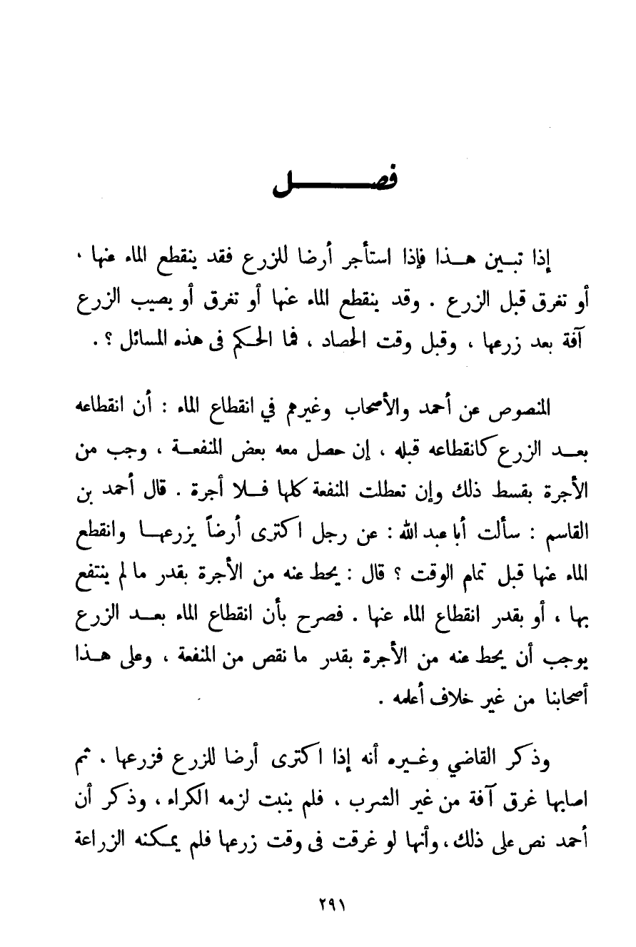 (إذَا تَبَيَّنَ هَذَا فَإِذَا اسْتَأْجَرَ أَرْضًا لِلزَّرْعِ فَقَدْ يَنْقَطِعُ الْمَاءُ عَنْهَا أَوْ تَغْرَقُ قَبْلَ الزَّرْعِ. [وَقَدْ يَنْقَطِعُ الْمَاءُ عَنْهَا أَوْ تَغْرَقُ] أَوْ يُصِيبُ الزَّرْعَ آفَةٌ بَعْدَ زَرْعِهَا وَقَبْلَ وَقْتِ الْحَصَادِ فَمَا الْحُكْمُ فِي هَذِهِ الْمَسَائِلِ؟) (*) .