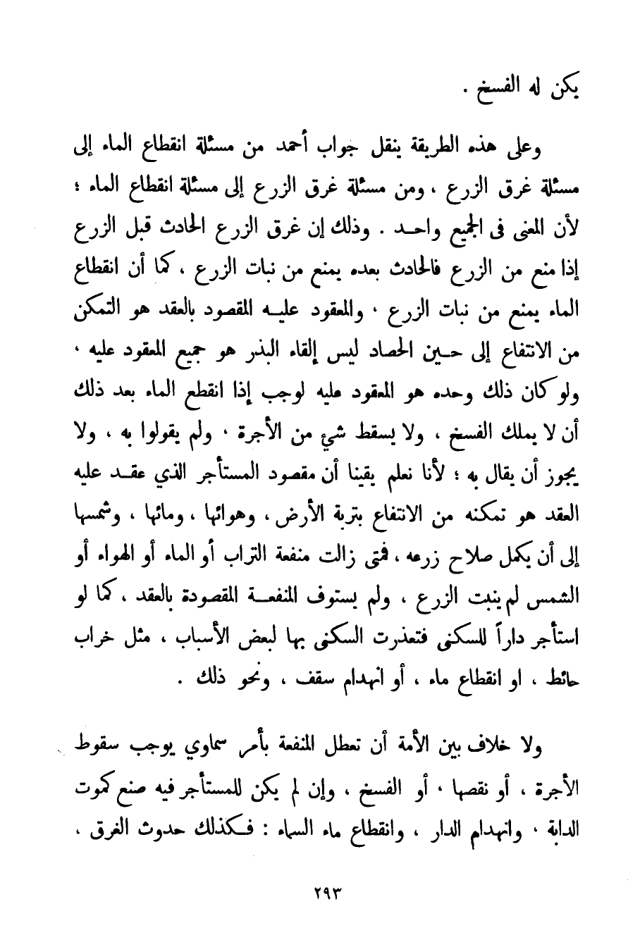 يَكُنْ لَهُ الْفَسْخُ. وَعَلَى هَذِهِ الطَّرِيقَةِ يَنْقُلُ جَوَابَ أَحْمَدَ مِنْ مَسْأَلَةِ انْقِطَاعِ الْمَاءِ إلَى مَسْأَلَةِ غَرَقِ الزَّرْعِ وَمِنْ مَسْأَلَةِ غَرَقِ الزَّرْعِ إلَى مَسْأَلَةِ انْقِطَاعِ الْمَاءِ؛ لِأَنَّ الْمَعْنَى فِي الْجَمِيعِ وَاحِدٌ. وَذَلِكَ إنْ غَرِقَ الزَّرْعُ الْحَادِثُ قَبْلَ الزَّرْعِ إذَا مُنِعَ مِنْ الزَّرْعِ فَالْحَادِثُ بَعْدَهُ يَمْنَعُ مِنْ نَبَاتِ الزَّرْعِ كَمَا أَنَّ انْقِطَاعَ الْمَاءِ يَمْنَعُ مِنْ نَبَاتِ الزَّرْعِ وَالْمَعْقُودُ عَلَيْهِ الْمَقْصُودُ بِالْعَقْدِ هُوَ التَّمَكُّنُ مِنْ الِانْتِفَاعِ إلَى حِينِ الْحَصَادِ لَيْسَ إلْقَاءُ الْبَذْرِ هُوَ جَمِيعُ الْمَعْقُودِ عَلَيْهِ وَلَوْ كَانَ ذَلِكَ وَحْدَهُ هُوَ الْمَعْقُودُ عَلَيْهِ لَوَجَبَ إذَا انْقَطَعَ الْمَاءُ بَعْدَ ذَلِكَ أَنْ لَا يَمْلِكَ الْفَسْخَ وَلَا يَسْقُطُ شَيْءٌ مِنْ الْأُجْرَةِ وَلَمْ يَقُولُوا بِهِ وَلَا يَجُوزُ أَنْ يُقَالَ بِهِ؛ لِأَنَّا نَعْلَمُ يَقِينًا أَنَّ مَقْصُودَ الْمُسْتَأْجِرِ الَّذِي عَقَدَ عَلَيْهِ الْعَقْدَ هُوَ تَمَكُّنُهُ مِنْ الِانْتِفَاعِ بِتُرْبَةِ الْأَرْضِ وَهَوَائِهَا وَمَائِهَا وَشَمْسِهَا إلَى أَنْ يَكْمُلَ صَلَاحُ زَرْعِهِ فَمَتَى زَالَتْ مَنْفَعَةُ التُّرَابِ أَوْ الْمَاءِ أَوْ الْهَوَاءِ أَوْ الشَّمْسِ لَمْ يَنْبُتْ الزَّرْعُ وَلَمْ يَسْتَوْفِ الْمَنْفَعَةَ الْمَقْصُودَةَ بِالْعَقْدِ كَمَا لَوْ اسْتَأْجَرَ دَارًا لِلسُّكْنَى فَتَعَذَّرَتْ السُّكْنَى بِهَا لِبَعْضِ الْأَسْبَابِ مِثْلَ خَرَابِ حَائِطٍ أَوْ انْقِطَاعِ مَاءٍ أَوْ انْهِدَامِ سَقْفٍ وَنَحْوِ ذَلِكَ. وَلَا خِلَافَ بَيْنَ الْأُمَّةِ أَنَّ تَعَطُّلَ الْمَنْفَعَةِ بِأَمْرِ سَمَاوِيٍّ يُوجِبُ سُقُوطَ الْأُجْرَةِ أَوْ نَقْصَهَا أَوْ الْفَسْخَ وَإِنْ لَمْ يَكُنْ لِلْمُسْتَأْجِرِ فِيهِ صُنْعٌ كَمَوْتِ الدَّابَّةِ وَانْهِدَامِ الدَّارِ وَانْقِطَاعِ مَاءِ السَّمَاءِ: فَكَذَلِكَ حُدُوثُ الْغَرَقِ