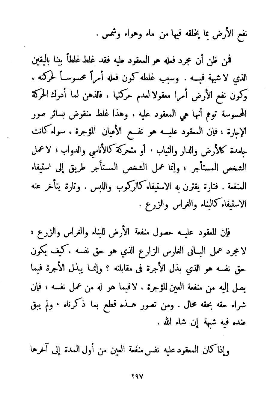 نَفْعُ الْأَرْضِ بِمَا يَخْلُقُهُ فِيهَا مِنْ مَاءٍ وَهَوَاءٍ وَشَمْسٍ. فَمَنْ ظَنَّ أَنَّ مُجَرَّدَ فِعْلِهِ هُوَ الْمَعْقُودُ عَلَيْهِ فَقَدْ غَلِطَ غَلَطًا بَيِّنًا بِالْيَقِينِ الَّذِي لَا شُبْهَةَ فِيهِ. وَسَبَبُ غَلَطِهِ كَوْنُ فِعْلِهِ أَمْرًا مَحْسُوسًا لِحَرَكَتِهِ وَكَوْنُ نَفْعِ الْأَرْضِ أَمْرًا مَعْقُولًا لِعَدَمِ حَرَكَتِهَا فَالذِّهْنُ لَمَّا أَدْرَكَ الْحَرَكَةَ الْمَحْسُوسَةَ تَوَهَّمَ أَنَّهَا هِيَ الْمَعْقُودُ عَلَيْهِ وَهَذَا غَلَطٌ مَنْقُوضٌ بِسَائِرِ صُوَرِ الْإِجَارَةِ؛ فَإِنَّ الْمَعْقُودَ عَلَيْهِ هُوَ نَفْعُ الْأَعْيَانِ الْمُؤَجَّرَةِ سَوَاءٌ كَانَتْ جَامِدَةً كَالْأَرْضِ وَالدَّارِ وَالثِّيَابِ أَوْ مُتَحَرِّكَةً كَالْأَنَاسِيِّ وَالدَّوَابِّ؛ لَا عَمَلُ الشَّخْصِ الْمُسْتَأْجِرِ؛ وَإِنَّمَا عَمَلُ الشَّخْصِ الْمُسْتَأْجِرِ طَرِيقٌ إلَى اسْتِيفَاءِ الْمَنْفَعَةِ. فَتَارَةً يُقْرَنُ بِهِ الِاسْتِيفَاءُ كَالرُّكُوبِ وَاللَّبْسِ. وَتَارَةً يَتَأَخَّرُ عَنْهُ الِاسْتِيفَاءُ كَالْبِنَاءِ وَالْغِرَاسِ وَالزَّرْعِ. فَإِنَّ الْمَعْقُودَ عَلَيْهِ حُصُولُ مَنْفَعَةِ الْأَرْضِ لِلْبِنَاءِ وَالْغِرَاسِ وَالزَّرْعِ؛ لَا مُجَرَّدُ عَمَلِ الْبَانِي الْغَارِسِ الزَّارِعِ الَّذِي هُوَ حَقُّ نَفْسِهِ كَيْفَ يَكُونُ حَقُّ نَفْسِهِ هُوَ الَّذِي بَذَلَ الْأُجْرَةَ فِي مُقَابَلَتِهِ؟ وَإِنَّمَا يَبْذُلُ الْأُجْرَةَ فِيمَا يَصِلُ إلَيْهِ مِنْ مَنْفَعَةِ الْعَيْنِ الْمُؤَجَّرَةِ لَا فِيمَا هُوَ لَهُ مِنْ عَمَلِ نَفْسِهِ؛ فَإِنَّ شِرَاءَ حَقِّهِ بِحَقِّهِ مُحَالٌ. وَمَنْ تَصَوَّرَ هَذِهِ قَطَعَ بِمَا ذَكَرْنَاهُ وَلَمْ يَبْقَ عِنْدَهُ فِيهِ شُبْهَةٌ إنْ شَاءَ اللَّهُ. وَإِذَا كَانَ الْمَعْقُودُ عَلَيْهِ نَفْسَ مَنْفَعَةِ الْعَيْنِ مِنْ أَوَّلِ الْمُدَّةِ إلَى آخِرِهَا