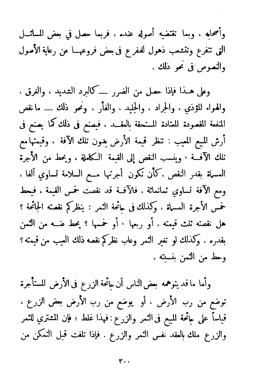 وَأَصْحَابُهُ وَبِمَا تَقْتَضِيهِ أُصُولُهُ عِنْدَهُ فَرُبَّمَا حَصَلَ فِي بَعْضِ الْمَسَائِلِ الَّتِي تَتَفَرَّعُ وَتَتَشَعَّبُ ذُهُولٌ لِلْمُفَرِّعِ فِي بَعْضِ فُرُوعِهَا عَنْ رِعَايَةِ الْأُصُولِ وَالنُّصُوصِ فِي نَحْوِ ذَلِكَ. وَعَلَى هَذَا فَإِذَا حَصَلَ مِنْ الضَّرَرِ - كَالْبَرْدِ الشَّدِيدِ وَالْغَرَقِ وَالْهَوَاءِ الْمُؤْذِي وَالْجَرَادِ وَالْجَلِيدِ وَالْفَأْرِ وَنَحْوِ ذَلِكَ - مَا نَقَصَ الْمَنْفَعَةَ الْمَقْصُودَةَ الْمُعْتَادَةَ الْمُسْتَحَقَّةَ بِالْعَقْدِ فَيُصْنَعُ فِي ذَلِكَ كَمَا يُصْنَعُ فِي أَرْشِ الْمَبِيع الْمَعِيبِ: تُنْظَرُ قِيمَةُ الْأَرْضِ بِدُونِ تِلْكَ الْآفَةِ وَقِيمَتُهَا مَعَ تِلْكَ الْآفَةِ وَيُنْسَبُ النَّقْصُ إلَى الْقِيمَةِ الْكَامِلَةِ وَيُحَطُّ مِنْ الْأُجْرَةِ الْمُسَمَّاةِ بِقَدْرِ النَّقْصِ كَأَنْ تَكُونَ أُجْرَتُهَا مَعَ السَّلَامَةِ تُسَاوِي أَلْفًا وَمَعَ الْآفَةِ تُسَاوِي ثَمَانِمِائَةٍ فَالْآفَةُ قَدْ نَقَصَتْ خُمْسَ الْقِيمَةِ فَيُحَطُّ خُمْسُ الْأُجْرَةِ الْمُسَمَّاةِ وَكَذَلِكَ فِي جَائِحَةِ الثَّمَرِ: يُنْظَرُ كَمْ نَقَصَتْهُ الْجَائِحَةُ؟ هَلْ نَقَصَتْهُ ثُلُثَ قِيمَتِهِ أَوْ رُبْعَهَا أَوْ خُمْسَهَا؟ يُحَطُّ عَنْهُ مِنْ الثَّمَنِ بِقَدْرِهِ. وَكَذَلِكَ لَوْ تَغَيَّرَ الثَّمَرُ وَعَابَ نَظَرَ كَمْ نَقَصَهُ ذَلِكَ الْعَيْبُ مَنْ قِيمَتِهِ؟ وَحَطَّ مِنْ الثَّمَنِ بِنِسْبَتِهِ. وَأَمَّا مَا قَدْ يَتَوَهَّمُهُ بَعْضُ النَّاسِ أَنَّ جَائِحَةَ الزَّرْعِ فِي الْأَرْضِ الْمُسْتَأْجَرَةِ تُوضَعُ مِنْ رَبِّ الْأَرْضِ أَوْ يُوضَعُ مِنْ رَبِّ الْأَرْضِ بَعْضُ الزَّرْعِ قِيَاسًا عَلَى جَائِحَةِ الْمَبِيع فِي الثَّمَرِ وَالزَّرْعِ: فَهَذَا غَلَطٌ؛ فَإِنَّ الْمُشْتَرِيَ لِلثَّمَرِ وَالزَّرْعِ مَلَكَ بِالْعَقْدِ نَفْسَ الثَّمَرِ وَالزَّرْعِ. فَإِذَا تَلِفَتْ قَبْلَ التَّمَكُّنِ مِنْ