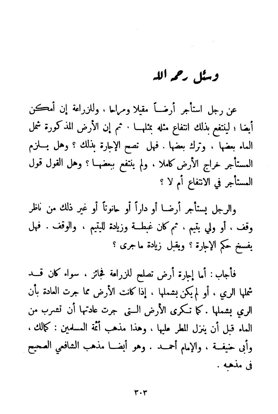 أَمَّا إجَارَةُ أَرْضٍ تَصْلُحُ لِلزِّرَاعَةِ فَجَائِزٌ سَوَاءٌ كَانَ قَدْ شَمِلَهَا الرَّيُّ أَوْ لَمْ يَكُنْ يَشْمَلُهَا إذَا كَانَتْ الْأَرْضُ مِمَّا جَرَتْ الْعَادَةُ بِأَنَّ الرَّيَّ يَشْمَلُهَا. كَمَا تُكْرَى الْأَرْضُ الَّتِي جَرَتْ عَادَتُهَا أَنْ تَشْرَبَ مِنْ الْمَاءِ قَبْلَ أَنْ يَنْزِلَ الْمَطَرُ عَلَيْهَا وَهَذَا مَذْهَبُ أَئِمَّةِ الْمُسْلِمِينَ: كَمَالِكِ وَأَبِي حَنِيفَةَ وَالْإِمَامِ أَحْمَد. وَهُوَ أَيْضًا مَذْهَبُ الشَّافِعِيِّ الصَّحِيحُ فِي مَذْهَبِهِ.