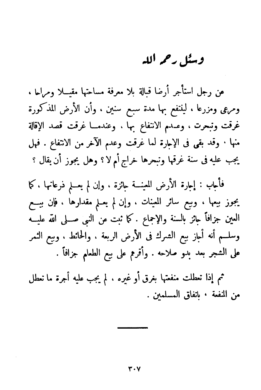 عَنْ رَجُلٍ اسْتَأْجَرَ أَرْضًا قَبَالَةً بِلَا مَعْرِفَةِ مِسَاحَتِهَا مَقِيلًا وَمَرَاحًا وَمَرْعًى ومزرعا لِيَنْتَفِعَ بِهَا مُدَّةَ سَبْعِ سِنِينَ وَأَنَّ الْأَرْضَ الْمَذْكُورَةَ غَرِقَتْ وَتَبَحَّرَتْ وَعَدِمَ الِانْتِفَاعَ بِهَا وَعِنْدَمَا غَرِقَتْ قَصَدَ الْإِقَالَةَ مِنْهَا وَقَدْ بَقِيَ فِي الْإِجَارَةِ لَمَّا غَرِقَتْ وَعُدِمَ الْآخَرُ مِنْ الِانْتِفَاعِ. فَهَلْ يَجِبُ عَلَيْهِ فِي سَنَةِ غَرَقِهَا وَتَبَحُّرِهَا خَرَاجٌ أَمْ لَا؟ وَهَلْ يَجُوزُ أَنْ يُقَالَ؟