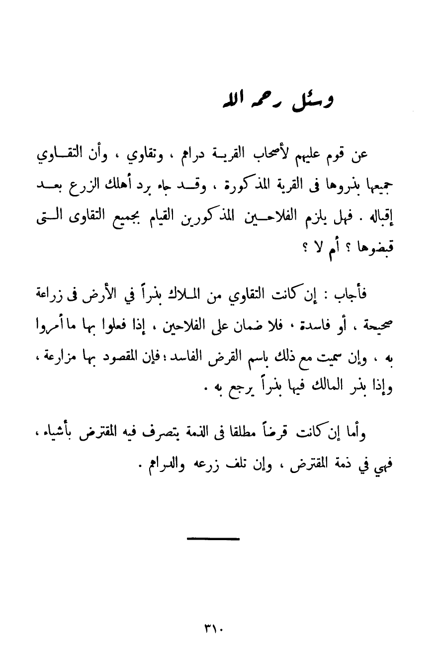 عَنْ قَوْمٍ عَلَيْهِمْ لِأَصْحَابِ الْقَرْيَةِ دَرَاهِمُ وَتَقَاوِي وَأَنَّ التَّقَاوِيَ جَمِيعَهَا بَذَرُوهَا فِي الْقَرْيَةِ الْمَذْكُورَةِ وَقَدْ جَاءَ بَرْدٌ أَهَلَكَ الزَّرْعَ بَعْدَ إقْبَالِهِ. فَهَلْ يَلْزَمُ الْفَلَّاحِينَ الْمَذْكُورِينَ الْقِيَامُ بِجَمِيعِ التَّقَاوِي الَّتِي قَبَضُوهَا؟ أَمْ لَا؟