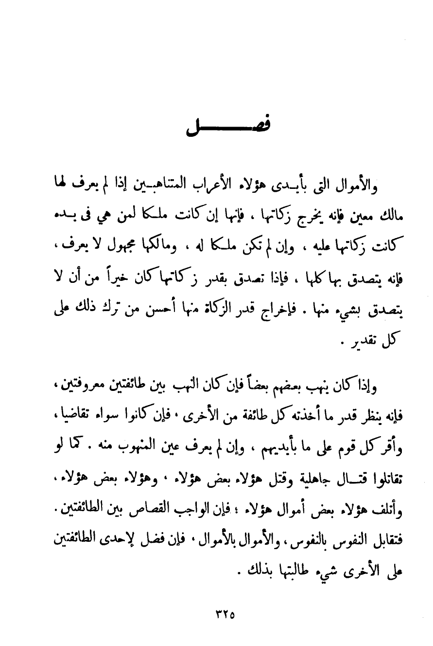 وَالْأَمْوَالُ الَّتِي بِأَيْدِي هَؤُلَاءِ الْأَعْرَابِ المتناهبين إذَا لَمْ يُعْرَفْ لَهَا مَالِكٌ مُعَيَّنٌ فَإِنَّهُ يُخْرِجُ زَكَاتَهَا فَإِنَّهَا إنْ كَانَتْ مِلْكًا لِمَنْ هِيَ فِي يَدِهِ كَانَتْ زَكَاتُهَا عَلَيْهِ وَإِنْ لَمْ تَكُنْ مِلْكًا لَهُ وَمَالِكُهَا مَجْهُولٌ لَا يُعْرَفُ فَإِنَّهُ يَتَصَدَّقُ بِهَا كُلِّهَا فَإِذَا تَصَدَّقَ بِقَدْرِ زَكَاتِهَا كَانَ خَيْرًا مِنْ أَنْ لَا يَتَصَدَّقَ بِشَيْءِ مِنْهَا. فَإِخْرَاجُ قَدْرِ الزَّكَاةِ مِنْهَا أَحْسَنُ مِنْ تَرْكِ ذَلِكَ عَلَى كُلِّ تَقْدِيرٍ. وَإِذَا كَانَ يَنْهَبُ بَعْضُهُمْ بَعْضًا فَإِنْ كَانَ النَّهْبُ بَيْنَ طَائِفَتَيْنِ مَعْرُوفَتَيْنِ فَإِنَّهُ يَنْظُرُ قَدْرَ مَا أَخَذَتْهُ كُلُّ طَائِفَةٍ مِنْ الْأُخْرَى فَإِنْ كَانُوا سَوَاءً تَقَاضَيَا وَأَقَرَّ كُلَّ قَوْمٍ عَلَى مَا بِأَيْدِيهِمْ وَإِنْ لَمْ يُعْرَفْ عَيْنُ الْمَنْهُوبِ مِنْهُ. كَمَا لَوْ تَقَاتَلُوا قِتَالَ جَاهِلِيَّةٍ وَقَتَلَ هَؤُلَاءِ بَعْضَ هَؤُلَاءِ وَهَؤُلَاءِ بَعْضَ هَؤُلَاءِ وَأَتْلَفَ هَؤُلَاءِ بَعْضَ أَمْوَالِ هَؤُلَاءِ؛ فَإِنَّ الْوَاجِبَ الْقِصَاصُ بَيْنَ الطَّائِفَتَيْنِ. فَتَقَابُلُ النُّفُوسِ بِالنُّفُوسِ وَالْأَمْوَالِ بِالْأَمْوَالِ فَإِنَّ فَضَلَ لِإِحْدَى الطَّائِفَتَيْنِ عَلَى الْأُخْرَى شَيْءٌ طَالَبَتْهَا بِذَلِكَ.
