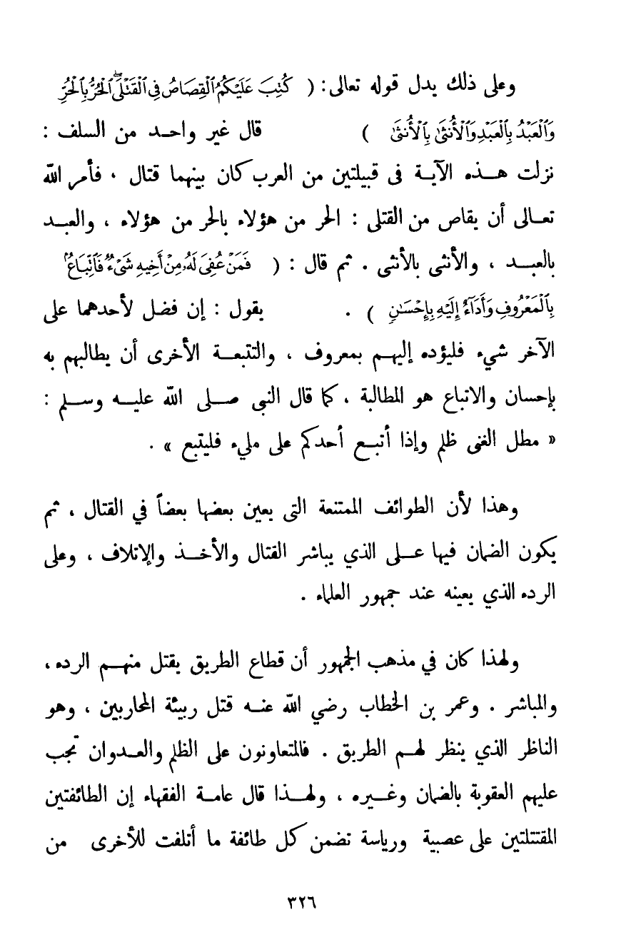 وَعَلَى ذَلِكَ يَدُلُّ قَوْلُهُ تَعَالَى: {كُتِبَ عَلَيْكُمُ الْقِصَاصُ فِي الْقَتْلَى الْحُرُّ بِالْحُرِّ وَالْعَبْدُ بِالْعَبْدِ وَالْأُنْثَى بِالْأُنْثَى} قَالَ غَيْرُ وَاحِدٍ مِنْ السَّلَفِ: نَزَلَتْ هَذِهِ الْآيَةُ فِي قَبِيلَتَيْنِ مِنْ الْعَرَبِ كَانَ بَيْنَهُمَا قِتَالٌ فَأَمَرَ اللَّهُ تَعَالَى أَنْ يُقَاصَّ مِنْ الْقَتْلَى: الْحُرُّ مِنْ هَؤُلَاءِ بِالْحُرِّ مِنْ هَؤُلَاءِ وَالْعَبْدُ بِالْعَبْدِ وَالْأُنْثَى بِالْأُنْثَى. ثُمَّ قَالَ: {فَمَنْ عُفِيَ لَهُ مِنْ أَخِيهِ شَيْءٌ فَاتِّبَاعٌ بِالْمَعْرُوفِ وَأَدَاءٌ إلَيْهِ بِإِحْسَانٍ} . يَقُولُ: إنْ فَضَلَ لِأَحَدِهِمَا عَلَى الْآخَرِ شَيْءٌ فَلْيُؤَدِّهِ إلَيْهِمْ بِمَعْرُوفِ والتتبعة الْأُخْرَى أَنْ يُطَالِبَهُمْ بِهِ بِإِحْسَانِ وَالِاتِّبَاعُ هُوَ الْمُطَالَبَةُ كَمَا قَالَ النَّبِيُّ صَلَّى اللَّهُ عَلَيْهِ وَسَلَّمَ {مَطْلُ الْغَنِيِّ ظُلْمٌ وَإِذَا أُتْبِعَ أَحَدُكُمْ عَلَى مَلِيءٍ فَلْيَتْبَعْ} . وَهَذَا لِأَنَّ الطَّوَائِفَ الْمُمْتَنِعَةَ الَّتِي يُعِينُ بَعْضُهَا بَعْضًا فِي الْقِتَالِ ثُمَّ يَكُونُ الضَّمَانُ فِيهَا عَلَى الَّذِي يُبَاشِرُ الْقِتَالَ وَالْأَخْذَ وَالْإِتْلَافَ وَعَلَى الرَّدْءِ الَّذِي يُعِينُهُ عِنْدَ جُمْهُورِ الْعُلَمَاءِ. وَلِهَذَا كَانَ فِي مَذْهَبِ الْجُمْهُورِ أَنَّ قُطَّاعَ الطَّرِيقِ يُقْتَلُ مِنْهُمْ الرِّدْءُ وَالْمُبَاشِرُ. وَعُمَرُ بْنُ الْخَطَّابِ رَضِيَ اللَّهُ عَنْهُ قَتَلَ رَبِيئَةَ الْمُحَارِبِينَ وَهُوَ النَّاظِرُ الَّذِي يَنْظُرُ لَهُمْ الطَّرِيقَ. فالمتعاونون عَلَى الظُّلْمِ وَالْعُدْوَانِ تَجِبُ عَلَيْهِمْ الْعُقُوبَةُ بِالضَّمَانِ وَغَيْرِهِ وَلِهَذَا قَالَ عَامَّةُ الْفُقَهَاءِ إنَّ الطَّائِفَتَيْنِ الْمُقْتَتِلَتَيْن عَلَى عَصَبِيَّةٍ وَرِيَاسَةٍ تَضْمَنُ كُلُّ طَائِفَةٍ مَا أَتْلَفَتْ لِلْأُخْرَى مِنْ