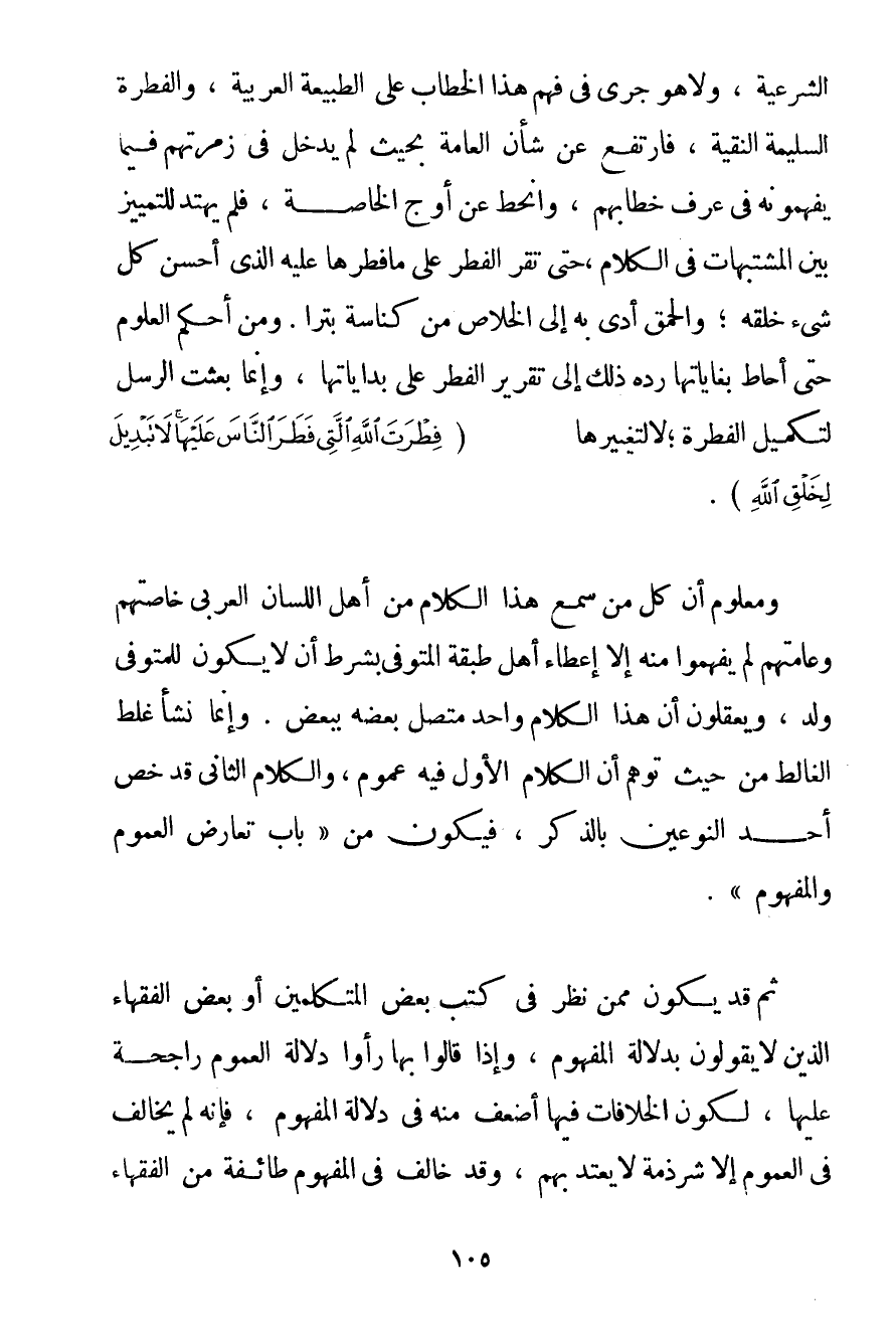 وَلَا هُوَ جَرَى فِي فَهْمِ هَذَا الْخِطَابِ عَلَى الطَّبِيعَةِ الْعَرَبِيَّةِ وَالْفِطْرَةِ السَّلِيمَةِ النَّقِيَّةِ فَارْتَفَعَ عَنْ شَأْنِ الْعَامَّةِ بِحَيْثُ لَمْ يَدْخُلْ فِي زُمْرَتِهِمْ فِيمَا يَفْهَمُونَهُ فِي عُرْفِ خِطَابِهِمْ وَانْحَطَّ عَنْ أَوْجِ الْخَاصَّةِ فَلَمْ يَهْتَدِ لِلتَّمْيِيزِ بَيْنَ الْمُشَبَّهَاتِ فِي الْكَلَامِ حَتَّى تُقِرَّ الْفِطَرُ عَلَى مَا فَطَرَهَا عَلَيْهِ الَّذِي أَحْسَنَ كُلَّ شَيْءٍ خَلَقَهُ؛ وَالْحُمْقُ أَدَّى بِهِ إلَى الْخَلَاصِ مِنْ كُنَاسَةِ بترا. وَمَنْ أَحْكَمَ الْعُلُومَ حَتَّى أَحَاطَ بِغَايَاتِهَا رَدَّهُ ذَلِكَ إلَى تَقْرِيرِ الْفِطَرِ عَلَى بِدَايَاتِهَا وَإِنَّمَا بُعِثَتْ الرُّسُلُ لِتَكْمِيلِ الْفِطْرَةِ؛ لَا لِتَغْيِيرِهَا {فِطْرَةَ اللَّهِ الَّتِي فَطَرَ النَّاسَ عَلَيْهَا لَا تَبْدِيلَ لِخَلْقِ اللَّهِ} . وَمَعْلُومٌ أَنَّ كُلَّ مَنْ سَمِعَ هَذَا الْكَلَامَ مِنْ أَهْلِ اللِّسَانِ الْعَرَبِيِّ خَاصَّتِهِمْ وَعَامَّتِهِمْ لَمْ يَفْهَمُوا مِنْهُ إلَّا إعْطَاءَ أَهْلِ طَبَقَةِ الْمُتَوَفَّى بِشَرْطِ أَنْ لَا يَكُونَ لِلْمُتَوَفَّى وَلَدٌ وَيَعْقِلُونَ أَنَّ هَذَا الْكَلَامَ وَاحِدٌ مُتَّصِلٌ بَعْضُهُ بِبَعْضِ. وَإِنَّمَا نَشَأَ غَلَطُ الغالط مِنْ حَيْثُ تَوَهَّمَ أَنَّ الْكَلَامَ الْأَوَّلَ فِيهِ عُمُومٌ وَالْكَلَامَ الثَّانِي قَدْ خَصَّ أَحَدَ النَّوْعَيْنِ بِالذِّكْرِ فَيَكُونُ مِنْ " بَابِ تَعَارُضِ الْعُمُومِ وَالْمَفْهُومِ ". ثُمَّ قَدْ يَكُونُ مِمَّنْ نَظَرَ فِي كُتُبِ بَعْضِ الْمُتَكَلِّمِينَ أَوْ بَعْضِ الْفُقَهَاءِ الَّذِينَ لَا يَقُولُونَ بِدَلَالَةِ الْمَفْهُومِ وَإِذَا قَالُوا بِهَا رَأَوْا دَلَالَةَ الْعُمُومِ رَاجِحَةً عَلَيْهَا لِكَوْنِ الْخِلَافَاتِ فِيهَا أَضْعَفَ مِنْهُ فِي دَلَالَةِ الْمَفْهُومِ فَإِنَّهُ لَمْ يُخَالِفْ فِي الْعُمُومِ إلَّا شِرْذِمَةٌ لَا يُعْتَدُّ بِهِمْ وَقَدْ خَالَفَ فِي الْمَفْهُومِ طَائِفَة مِنْ الْفُقَهَاءِ