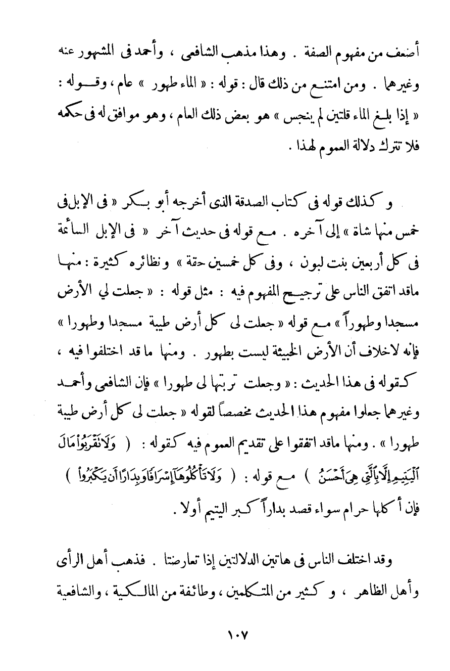 أَضْعَفُ مِنْ مَفْهُومِ الصِّفَةِ. وَهَذَا مَذْهَبُ الشَّافِعِيِّ وَأَحْمَد فِي الْمَشْهُورِ عَنْهُ وَغَيْرِهِمَا. وَمَنْ امْتَنَعَ مِنْ ذَلِكَ قَالَ: قَوْلُهُ: " {الْمَاءُ طَهُورٌ} عَامٌّ وَقَوْلُهُ: " {إذَا بَلَغَ الْمَاءُ قُلَّتَيْنِ لَمْ يُنَجَّسْ} هُوَ بَعْضُ ذَلِكَ الْعَامِّ وَهُوَ مُوَافِقٌ لَهُ فِي حُكْمِهِ فَلَا تُتْرَكُ دَلَالَةُ الْعُمُومِ لِهَذَا: وَكَذَلِكَ قَوْلُهُ فِي كِتَابِ الصَّدَقَةِ الَّذِي أَخْرَجَهُ أَبُو بَكْرٍ " {فِي الْإِبِلِ فِي خَمْسٍ مِنْهَا شَاةٌ} إلَى آخِرِهِ. مَعَ قَوْلِهِ فِي حَدِيثٍ آخَرَ " {فِي الْإِبِلِ السَّائِمَةِ فِي كُلِّ أَرْبَعِينَ بِنْتُ لَبُونٍ وَفِي كُلِّ خَمْسِينَ حِقَّةٌ} وَنَظَائِرُهُ كَثِيرَةٌ: مِنْهَا مَا قَدْ اتَّفَقَ النَّاسُ عَلَى تَرْجِيحِ الْمَفْهُومِ فِيهِ: مِثْلَ قَوْلِهِ: " {جُعِلَتْ لِي الْأَرْضُ مَسْجِدًا وَطَهُورًا} مَعَ قَوْلِهِ " {جُعِلَتْ لِي كُلُّ أَرْضٍ طَيِّبَةٍ مَسْجِدًا وَطَهُورًا} فَإِنَّهُ لَا خِلَافَ أَنَّ الْأَرْضَ الْخَبِيثَةَ لَيْسَتْ بِطَهُورِ. وَمِنْهَا مَا قَدْ اخْتَلَفُوا فِيهِ كَقَوْلِهِ فِي هَذَا الْحَدِيثِ: " {وَجُعِلَتْ تُرْبَتُهَا لِي طَهُورًا} فَإِنَّ الشَّافِعِيِّ وَأَحْمَد وَغَيْرَهُمَا جَعَلُوا مَفْهُومَ هَذَا الْحَدِيثِ مُخَصَّصًا لِقَوْلِهِ " {جُعِلَتْ لِي كُلُّ أَرْضٍ طَيِّبَةٍ طَهُورًا} . وَمِنْهَا مَا قَدْ اتَّفَقُوا عَلَى تَقْدِيمِ الْعُمُومِ فِيهِ كَقَوْلِهِ: {وَلَا تَقْرَبُوا مَالَ الْيَتِيمِ إلَّا بِالَّتِي هِيَ أَحْسَنُ} مَعَ قَوْلِهِ: {وَلَا تَأْكُلُوهَا إسْرَافًا وَبِدَارًا أَنْ يَكْبَرُوا} فَإِنَّ أَكْلَهَا حَرَامٌ سَوَاءٌ قَصَدَ بِدَارًا كِبَرَ الْيَتِيمِ أَوْ لَا. وَقَدْ اخْتَلَفَ النَّاسُ فِي هَاتَيْنِ الدَّلَالَتَيْنِ إذَا تَعَارَضَتَا. فَذَهَبَ أَهْلُ الرَّأْيِ وَأَهْلُ الظَّاهِرِ وَكَثِيرٌ مِنْ الْمُتَكَلِّمِينَ وَطَائِفَةٌ مِنْ الْمَالِكِيَّةِ وَالشَّافِعِيَّةِ
