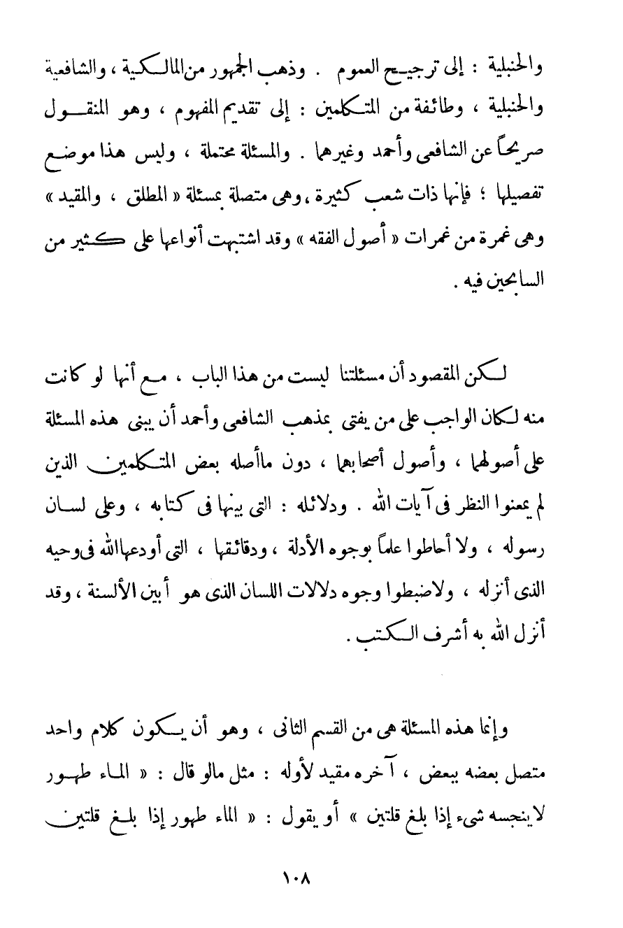 وَالْحَنْبَلِيَّةِ: إلَى تَرْجِيحِ الْعُمُومِ. وَذَهَبَ الْجُمْهُورُ مِنْ الْمَالِكِيَّةِ وَالشَّافِعِيَّةِ وَالْحَنْبَلِيَّةِ وَطَائِفَةٌ مِنْ الْمُتَكَلِّمِينَ: إلَى تَقْدِيمِ الْمَفْهُومِ وَهُوَ الْمَنْقُولُ صَرِيحًا عَنْ الشَّافِعِيِّ وَأَحْمَد وَغَيْرِهِمَا. وَالْمَسْأَلَةُ مُحْتَمَلَةٌ وَلَيْسَ هَذَا مَوْضِعَ تَفْصِيلِهَا؛ فَإِنَّهَا ذَاتُ شُعَبٍ كَثِيرَةٍ وَهِيَ مُتَّصِلَةٌ بِمَسْأَلَةِ " الْمُطْلَقِ وَالْمُقَيَّدِ " وَهِيَ غَمْرَةٌ مِنْ غَمَرَاتِ " أُصُولِ الْفِقْهِ " وَقَدْ اشْتَبَهَتْ أَنْوَاعُهَا عَلَى كَثِيرٍ مِنْ السَّابِحِينَ فِيهِ. لَكِنْ الْمَقْصُودُ أَنَّ مَسْأَلَتَنَا لَيْسَتْ مِنْ هَذَا الْبَابِ مَعَ أَنَّهَا لَوْ كَانَتْ مِنْهُ لَكَانَ الْوَاجِبُ عَلَى مِنْ يُفْتِي بِمَذْهَبِ الشَّافِعِيِّ وَأَحْمَد أَنْ يَبْنِيَ هَذِهِ الْمَسْأَلَةَ عَلَى أُصُولِهِمَا وَأُصُولِ أَصْحَابِهِمَا دُونَ مَا أَصَّلَهُ بَعْضُ الْمُتَكَلِّمِينَ الَّذِينَ لَمْ يُمْعِنُوا النَّظَرَ فِي آيَاتِ اللَّهِ. وَدَلَائِلُهُ: الَّتِي بَيَّنَهَا فِي كِتَابِهِ وَعَلَى لِسَانِ رَسُولِهِ وَلَا أَحَاطُوا عِلْمًا بِوُجُوهِ الْأَدِلَّةِ وَدَقَائِقِهَا الَّتِي أَوْدَعَهَا اللَّهُ فِي وَحْيِهِ الَّذِي أَنْزَلَهُ وَلَا ضَبَطُوا وُجُوهَ دَلَالَاتِ اللِّسَانِ الَّذِي هُوَ أَبْيَنُ الْأَلْسِنَةِ وَقَدْ أَنْزَلَ اللَّهُ بِهِ أَشْرَفَ الْكُتُبِ. وَإِنَّمَا هَذِهِ الْمَسْأَلَةُ هِيَ مِنْ الْقِسْمِ الثَّانِي وَهُوَ أَنْ يَكُونَ كَلَامٌ وَاحِدٌ مُتَّصِلٌ بَعْضُهُ بِبَعْضِ آخِرُهُ مُقَيِّدٌ لِأَوَّلِهِ: مِثْلَ مَا لَوْ قَالَ: " {الْمَاءُ طَهُورٌ لَا يُنَجِّسُهُ شَيْءٌ إذَا بَلَغَ قُلَّتَيْنِ} أَوْ يَقُولُ: " {الْمَاءُ طَهُورٌ إذَا بَلَغَ قُلَّتَيْنِ
