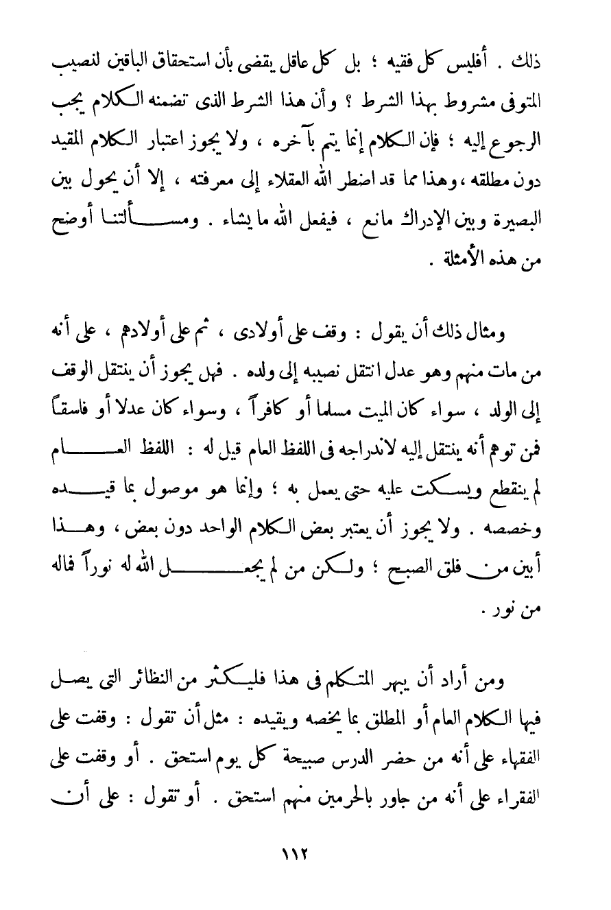 ذَلِكَ. أَفَلَيْسَ كُلُّ فَقِيهٍ؛ بَلْ كُلُّ عَاقِلٍ يَقْضِي بِأَنَّ اسْتِحْقَاقَ الْبَاقِينَ لِنَصِيبِ الْمُتَوَفَّى مَشْرُوطٌ بِهَذَا الشَّرْطِ؟ وَأَنَّ هَذَا الشَّرْطَ الَّذِي تَضَمَّنَهُ الْكَلَامُ يَجِبُ الرُّجُوعُ إلَيْهِ؛ فَإِنَّ الْكَلَامَ إنَّمَا يَتِمُّ بِآخِرِهِ وَلَا يَجُوز اعْتِبَارُ الْكَلَامِ الْمُقَيَّدِ دُونَ مُطْلَقِهِ وَهَذَا مِمَّا قَدْ اضْطَرَّ اللَّهُ الْعُقَلَاءَ إلَى مَعْرِفَتِهِ إلَّا أَنْ يَحُولَ بَيْنَ الْبَصِيرَةِ وَبَيْنَ الْإِدْرَاكِ مَانِعٌ فَيَفْعَلُ اللَّهُ مَا يَشَاءُ. وَمَسْأَلَتُنَا أَوْضَحُ مِنْ هَذِهِ الْأَمْثِلَةِ. وَمِثَالُ ذَلِكَ أَنْ يَقُولَ: وَقَفَ عَلَى أَوْلَادِي ثُمَّ عَلَى أَوْلَادِهِمْ عَلَى أَنَّهُ مَنْ مَاتَ مِنْهُمْ وَهُوَ عَدْلٌ انْتَقَلَ نَصِيبُهُ إلَى وَلَدِهِ. فَهَلْ يَجُوز أَنْ يَنْتَقِلَ الْوَقْفُ إلَى الْوَلَدِ سَوَاءٌ كَانَ الْمَيِّتُ مُسْلِمًا أَوْ كَافِرًا وَسَوَاءٌ كَانَ عَدْلًا أَوْ فَاسِقًا فَمَنْ تَوَهَّمَ أَنَّهُ يَنْتَقِلُ إلَيْهِ لِانْدِرَاجِهِ فِي اللَّفْظِ الْعَامِّ قِيلَ لَهُ: اللَّفْظُ الْعَامُّ لَمْ يَنْقَطِعْ وَيَسْكُتْ عَلَيْهِ حَتَّى يَعْمَلَ بِهِ؛ وَإِنَّمَا هُوَ مَوْصُولٌ بِمَا قَيَّدَهُ وَخَصَّصَهُ. وَلَا يَجُوز أَنْ يُعْتَبَرَ بَعْضُ الْكَلَامِ الْوَاحِدِ دُونَ بَعْضٍ وَهَذَا أَبْيَنُ مِنْ فَلَقِ الصُّبْحِ؛ وَلَكِنْ مَنْ لَمْ يَجْعَلْ اللَّهُ لَهُ نُورًا فَمَا لَهُ مِنْ نُورٍ. وَمَنْ أَرَادَ أَنْ يُبْهِرْ الْمُتَكَلِّمَ فِي هَذَا فَلْيُكْثِرْ مِنْ النَّظَائِرِ الَّتِي يَصِلُ فِيهَا الْكَلَامَ الْعَامَّ أَوْ الْمُطْلَقَ بِمَا يَخُصُّهُ وَيُقَيِّدُهُ: مِثْلَ أَنْ تَقُولَ: وَقَفْت عَلَى الْفُقَهَاءِ عَلَى أَنَّهُ مَنْ حَضَرَ الدَّرْسَ صَبِيحَةَ كُلِّ يَوْمٍ اسْتَحَقَّ. أَوْ وَقَفْت عَلَى الْفُقَرَاءِ عَلَى أَنَّهُ مَنْ جَاوَرَ بِالْحَرَمَيْنِ مِنْهُمْ اسْتَحَقَّ. أَوْ تَقُولُ: عَلَى أَنْ