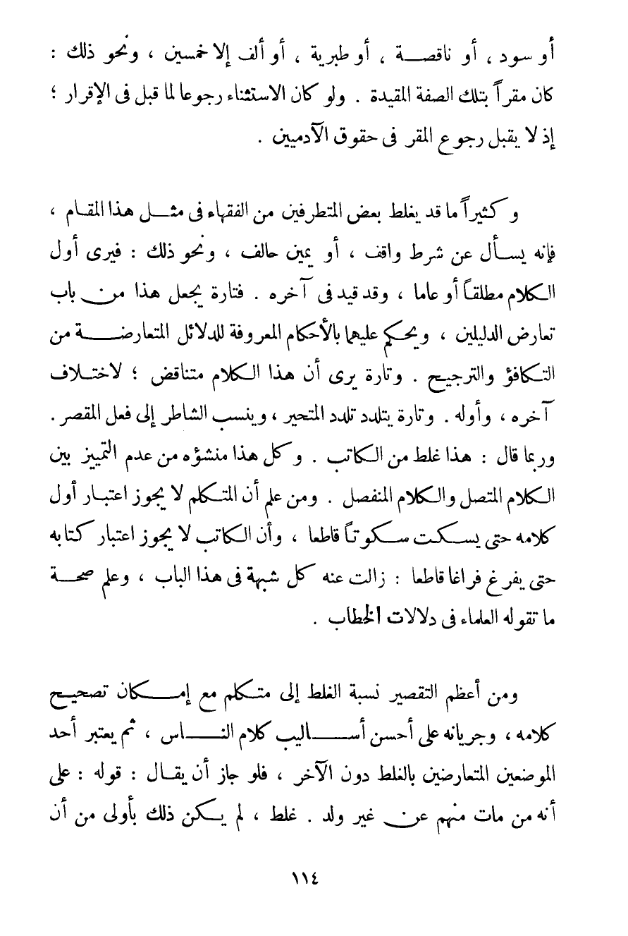 أَوْ سُودٌ أَوْ نَاقِصَةٌ أَوْ طبرية أَوْ أَلْفٌ إلَّا خَمْسِينَ وَنَحْوُ ذَلِكَ: كَانَ مُقِرًّا بِتِلْكَ الصِّفَةِ الْمُقَيَّدَةِ. وَلَوْ كَانَ الِاسْتِثْنَاءُ رُجُوعًا لَمَا قُبِلَ فِي الْإِقْرَارِ؛ إذْ لَا يُقْبَلُ رُجُوعُ الْمُقِرِّ فِي حُقُوقِ الْآدَمِيِّينَ. وَكَثِيرًا مَا قَدْ يَغْلَطُ بَعْضُ الْمُتَطَرِّفِينَ مِنْ الْفُقَهَاءِ فِي مِثْلِ هَذَا الْمَقَامِ فَإِنَّهُ يَسْأَلُ عَنْ شَرْطِ وَاقِفٍ أَوْ يَمِينِ حَالِفٍ وَنَحْوَ ذَلِكَ: فَيَرَى أَوَّلَ الْكَلَامِ مُطْلَقًا أَوْ عَامًّا وَقَدْ قَيَّدَ فِي آخِرِهِ. فَتَارَةً يَجْعَلُ هَذَا مِنْ بَابِ تَعَارُضِ الدَّلِيلَيْنِ وَيَحْكُمُ عَلَيْهِمَا بِالْأَحْكَامِ الْمَعْرُوفَةِ لِلدَّلَائِلِ الْمُتَعَارِضَةِ مِنْ التَّكَافُؤِ وَالتَّرْجِيحِ. وَتَارَةً يَرَى أَنَّ هَذَا الْكَلَامَ مُتَنَاقِضٌ؛ لِاخْتِلَافِ آخِرِهِ وَأَوَّلِهِ. وَتَارَةً يَتَلَدَّدُ تَلَدُّدَ الْمُتَحَيِّرِ وَيَنْسِبُ الشَّاطِرَ إلَى فِعْلِ الْمُقَصِّرِ. وَرُبَّمَا قَالَ: هَذَا غَلَطٌ مِنْ الْكَاتِبِ. وَكُلُّ هَذَا مَنْشَؤُهُ مِنْ عَدَمِ التَّمْيِيزِ بَيْنَ الْكَلَامِ الْمُتَّصِلِ وَالْكَلَامِ الْمُنْفَصِلِ. وَمَنْ عَلِمَ أَنَّ الْمُتَكَلِّمَ لَا يَجُوزُ اعْتِبَارُ أَوَّلِ كَلَامِهِ حَتَّى يَسْكُتَ سُكُوتًا قَاطِعًا وَأَنَّ الْكَاتِبَ لَا يَجُوزُ اعْتِبَارُ كِتَابِهِ حَتَّى يَفْرَغَ فَرَاغًا قَاطِعًا: زَالَتْ عَنْهُ شُبْهَةٌ فِي هَذَا الْبَابِ وَعَلِمَ صِحَّةَ مَا تَقُولُهُ الْعُلَمَاءُ فِي دَلَالَاتِ الْخِطَابِ. وَمِنْ أَعْظَمِ التَّقْصِيرِ نِسْبَةُ الْغَلَطِ إلَى مُتَكَلِّمٍ مَعَ إمْكَانِ تَصْحِيحِ كَلَامِهِ وَجَرَيَانِهِ عَلَى أَحْسَنِ أَسَالِيبِ كَلَامِ النَّاسِ ثُمَّ يَعْتَبِرُ أَحَدَ الْمَوْضِعَيْنِ الْمُتَعَارِضَيْنِ بِالْغَلَطِ دُونَ الْآخَرِ فَلَوْ جَازَ أَنْ يُقَالَ: قَوْلُهُ: عَلَى أَنَّهُ مَنْ مَاتَ مِنْهُمْ عَنْ غَيْرِ وَلَدٍ. غَلِطَ لَمْ يَكُنْ ذَلِكَ بِأَوْلَى مِنْ أَنْ