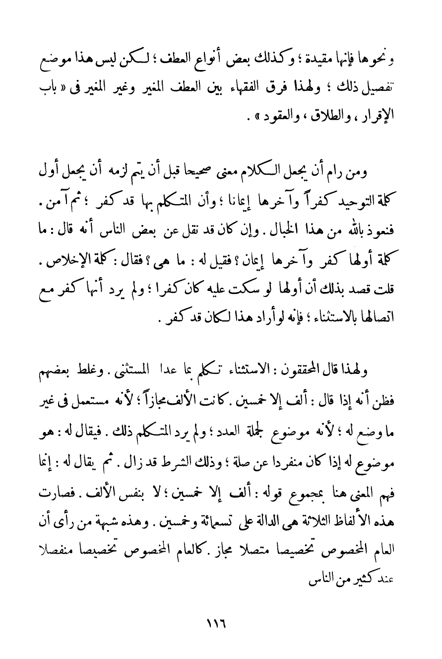 وَنَحْوِهَا فَإِنَّهَا مُقَيِّدَةٌ؛ وَكَذَلِكَ بَعْضُ أَنْوَاعِ الْعَطْفِ؛ لَكِنْ لَيْسَ هَذَا مَوْضِعَ تَفْصِيلِ ذَلِكَ؛ وَلِهَذَا فَرَّقَ الْفُقَهَاءُ بَيْنَ الْعَطْفِ الْمُغَيِّرِ وَغَيْرِ الْمُغَيِّرِ فِي " بَابِ الْإِقْرَارِ وَالطَّلَاقِ وَالْعُقُودِ ". وَمَنْ رَامَ أَنْ يَجْعَلَ الْكَلَامَ مَعْنًى صَحِيحًا قَبْلَ أَنْ يَتِمَّ لَزِمَهُ أَنْ يَجْعَلَ أَوَّلَ كَلِمَةِ التَّوْحِيدِ كُفْرًا وَآخِرَهَا إيمَانًا؛ وَأَنَّ الْمُتَكَلِّمَ بِهَا قَدْ كَفَرَ؛ ثُمَّ آمَنَ. فَنَعُوذُ بِاَللَّهِ مِنْ هَذَا الْخَبَالِ. وَإِنْ كَانَ قَدْ نُقِلَ عَنْ بَعْضِ النَّاسِ أَنَّهُ قَالَ: مَا كَلِمَةٌ أَوَّلُهَا كُفْرٌ وَآخِرُهَا إيمَانٌ؟ فَقِيلَ لَهُ: مَا هِيَ؟ فَقَالَ: كَلِمَةُ الْإِخْلَاصِ. قُلْت قَصَدَ بِذَلِكَ أَنَّ أَوَّلَهَا لَوْ سَكَتَ عَلَيْهِ كَانَ كُفْرًا؛ وَلَمْ يُرِدْ أَنَّهَا كُفْرٌ مَعَ اتِّصَالِهَا بِالِاسْتِثْنَاءِ؛ فَإِنَّهُ لَوْ أَرَادَ هَذَا لَكَانَ قَدْ كَفَرَ. وَلِهَذَا قَالَ الْمُحَقِّقُونَ: الِاسْتِثْنَاءُ تَكَلَّمَ بِمَا عَدَا الْمُسْتَثْنَى. وَغَلِطَ بَعْضُهُمْ فَظَنَّ أَنَّهُ إذَا قَالَ: أَلْفٌ إلَّا خَمْسِينَ. كَانَتْ الْأَلْفُ مَجَازًا؛ لِأَنَّهُ مُسْتَعْمَلٌ فِي غَيْرِ مَا وُضِعَ لَهُ؛ لِأَنَّهُ مَوْضُوعٌ لِجُمْلَةِ الْعَدَدِ؛ وَلَمْ يُرِدْ الْمُتَكَلِّمُ ذَلِكَ. فَيُقَالُ لَهُ: هُوَ مَوْضُوعٌ لَهُ إذَا كَانَ مُنْفَرِدًا عَنْ صِلَةٍ؛ وَذَلِكَ الشَّرْطُ قَدْ زَالَ. ثُمَّ يُقَالُ لَهُ: إنَّمَا فُهِمَ الْمَعْنَى هُنَا بِمَجْمُوعِ قَوْلِهِ: أَلْفٌ إلَّا خَمْسِينَ؛ لَا بِنَفْسِ الْأَلْفِ. فَصَارَتْ هَذِهِ الْأَلْفَاظُ الثَّلَاثَةُ هِيَ الدَّالَّةُ عَلَى تِسْعِمِائَةٍ وَخَمْسِينَ. وَهَذِهِ شُبْهَةُ مَنْ رَأَى أَنَّ الْعَامَّ الْمَخْصُوصَ تَخْصِيصًا مُتَّصِلًا مَجَازٌ. كَالْعَامِّ الْمَخْصُوصِ تَخْصِيصًا مُنْفَصِلًا عِنْدَ كَثِيرٍ مِنْ النَّاسِ