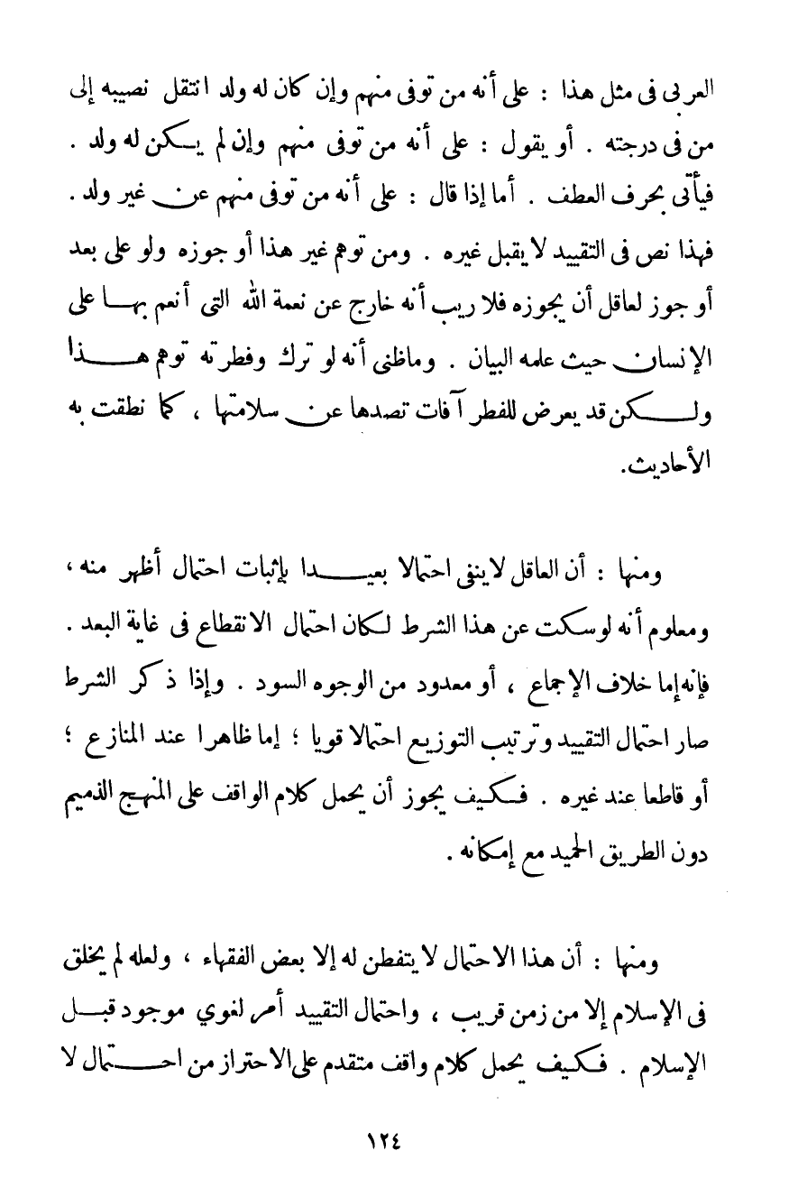 الْعَرَبِيُّ فِي مِثْلِ هَذَا: عَلَى أَنَّهُ مَنْ تُوُفِّيَ مِنْهُمْ وَإِنْ كَانَ لَهُ وَلَدٌ انْتَقَلَ نَصِيبُهُ إلَى مَنْ فِي دَرَجَتِهِ. أَوْ يَقُولُ: عَلَى أَنَّهُ مَنْ تُوُفِّيَ مِنْهُمْ وَإِنْ لَمْ يَكُنْ لَهُ وَلَدٌ. فَيَأْتِي بِحَرْفِ الْعَطْفِ. أَمَّا إذَا قَالَ: عَلَى أَنَّهُ مَنْ تُوُفِّيَ مِنْهُمْ عَنْ غَيْرِ وَلَدٍ. فَهَذَا نَصٌّ فِي التَّقْيِيدِ لَا يُقْبَلُ غَيْرُهُ. وَمَنْ تَوَهَّمَ غَيْرَ هَذَا أَوْ جَوَّزَهُ وَلَوْ عَلَى بُعْدٍ أَوْ جَوَّزَ لِعَاقِلِ أَنْ يُجَوِّزَهُ فَلَا رَيْبَ أَنَّهُ خَارِجٌ عَنْ نِعْمَةِ اللَّهِ الَّتِي أَنْعَمَ بِهَا عَلَى الْإِنْسَانِ حَيْثُ عَلَّمَهُ الْبَيَانَ. وَمَا ظَنِّي أَنَّهُ لَوْ تُرِكَ وَفِطْرَتَهُ تُوُهِّمَ هَذَا وَلَكِنْ قَدْ يَعْرِضُ لِلْمُفْطِرِ آفَاتٌ تَصُدُّهَا عَنْ سَلَامَتِهَا كَمَا نَطَقَتْ بِهِ الْأَحَادِيثُ. وَمِنْهَا: أَنَّ الْعَاقِلَ لَا يَنْفِي احْتِمَالًا بَعِيدًا بِإِثْبَاتِ احْتِمَالٍ أَظْهَرَ مِنْهُ وَمَعْلُومٌ أَنَّهُ لَوْ سَكَتَ عَنْ هَذَا الشَّرْطِ لَكَانَ احْتِمَالُ الِانْقِطَاعِ فِي غَايَةِ الْبُعْدِ. فَإِنَّهُ إمَّا خِلَافُ الْإِجْمَاعِ أَوْ مَعْدُودٌ مِنْ الْوُجُوهِ السُّودِ. وَإِذَا ذُكِرَ الشَّرْطُ صَارَ احْتِمَالُ التَّقْيِيدِ وَتَرْتِيبُ التَّوْزِيعِ احْتِمَالًا قَوِيًّا؛ إمَّا ظَاهِرًا عِنْدَ الْمُنَازِعِ؛ أَوْ قَاطِعًا عِنْدَ غَيْرِهِ. فَكَيْفَ يَجُوزُ أَنْ يُحْمَلَ كَلَامُ الْوَاقِفِ عَلَى الْمَنْهَجِ الذَّمِيمِ دُونَ الطَّرِيقِ الْحَمِيدِ مَعَ إمْكَانِهِ. وَمِنْهَا: أَنَّ هَذَا الِاحْتِمَالَ لَا يَتَفَطَّنُ لَهُ إلَّا بَعْضُ الْفُقَهَاءِ وَلَعَلَّهُ لَمْ يُخْلَقْ فِي الْإِسْلَامِ إلَّا مِنْ زَمَنٍ قَرِيبٍ وَاحْتِمَالُ التَّقْيِيدِ أَمْرٌ لُغَوِيٌّ مَوْجُودٌ قَبْلَ الْإِسْلَامِ. فَكَيْفَ يُحْمَلُ كَلَامُ وَاقِفٍ مُتَقَدِّمٍ عَلَى الِاحْتِرَازِ مِنْ احْتِمَالٍ لَا