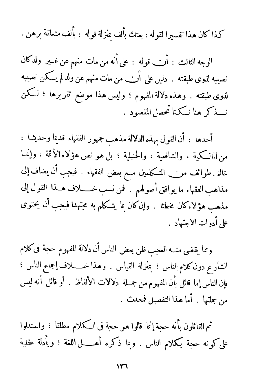 الْوَجْهُ الثَّالِثُ: أَنَّ قَوْلَهُ: عَلَى أَنَّهُ مَنْ مَاتَ مِنْهُمْ عَنْ غَيْرِ وَلَدٍ كَانَ نَصِيبُهُ لِذَوِي طَبَقَتِهِ. دَلِيلٌ عَلَى أَنَّ مَنْ مَاتَ مِنْهُمْ عَنْ وَلَدٍ لَمْ يَكُنْ نَصِيبُهُ لِذَوِي طَبَقَتِهِ. وَهَذِهِ دَلَالَةُ الْمَفْهُومِ؛ وَلَيْسَ هَذَا مَوْضِعَ تَقْرِيرِهَا؛ لَكِنْ نَذْكُرُ هُنَا نُكَتًا تُحْصِلُ الْمَقْصُودَ. أَحَدُهَا: أَنَّ الْقَوْلَ بِهَذِهِ الدَّلَالَةِ مَذْهَبُ جُمْهُورِ الْفُقَهَاءِ قَدِيمًا وَحَدِيثًا: مِنْ الْمَالِكِيَّةِ والشَّافِعِيَّةِ وَالْحَنْبَلِيَّةِ؛ بَلْ هُوَ نَصُّ هَؤُلَاءِ الْأَئِمَّةِ وَإِنَّمَا خَالَفَ طَوَائِفَ مِنْ الْمُتَكَلِّمِينَ مَعَ بَعْضِ الْفُقَهَاءِ. فَيَجِبُ أَنْ يُضَافَ إلَى مَذَاهِبِ الْفُقَهَاءِ مَا يُوَافِقُ أُصُولَهُمْ. فَمَنْ نَسَبَ خِلَافَ هَذَا الْقَوْلِ إلَى مَذْهَبِ هَؤُلَاءِ كَانَ مُخْطِئًا. وَإِنْ كَانَ بِمَا يَتَكَلَّمُ بِهِ مُجْتَهِدًا فَيَجِبُ أَنْ يَحْتَوِيَ عَلَى أَدَوَاتِ الِاجْتِهَادِ. وَمِمَّا يَقْضِي مِنْهُ الْعَجَبُ ظَنُّ بَعْضِ النَّاسِ أَنَّ دَلَالَةَ الْمَفْهُومِ حُجَّةٌ فِي كَلَامِ الشَّارِعِ دُونَ كَلَامِ النَّاسِ؛ بِمَنْزِلَةِ الْقِيَاسِ. وَهَذَا خِلَافُ إجْمَاعِ النَّاسِ؛ فَإِنَّ النَّاسَ إمَّا قَائِلٌ بِأَنَّ الْمَفْهُومَ مِنْ جُمْلَةِ دَلَالَاتِ الْأَلْفَاظِ. أَوْ قَائِلٌ أَنَّهُ لَيْسَ مِنْ جُمْلَتِهَا. أَمَّا هَذَا التَّفْصِيلُ فَمُحْدَثٌ. ثُمَّ الْقَائِلُونَ بِأَنَّهُ حُجَّةٌ إنَّمَا قَالُوا هُوَ حُجَّةٌ فِي الْكَلَامِ مُطْلَقًا؛ وَاسْتَدَلُّوا عَلَى كَوْنِهِ حُجَّةً بِكَلَامِ النَّاسِ. وَبِمَا ذَكَرَهُ أَهْلُ اللُّغَةِ؛ وَبِأَدِلَّةِ عَقْلِيَّةٍ