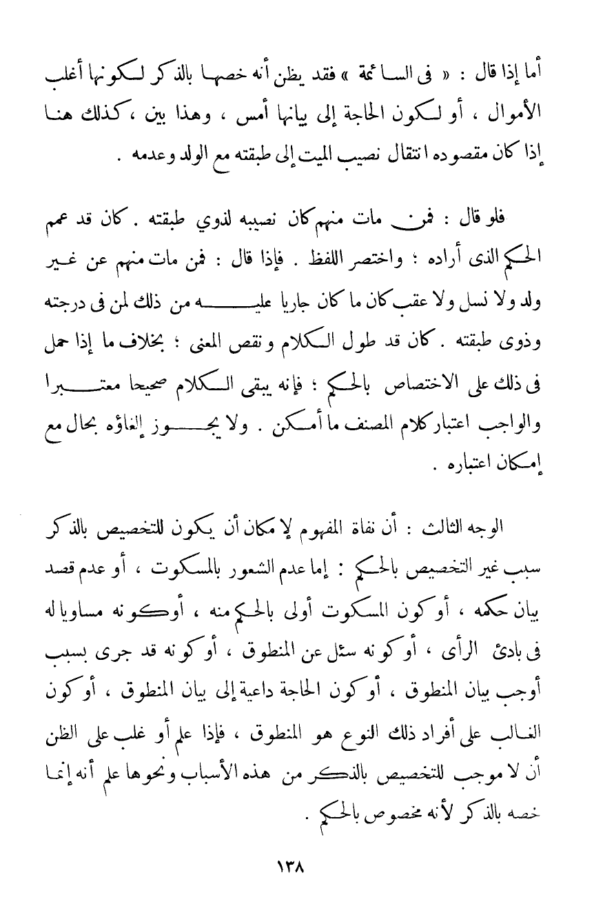إذَا قَالَ: " {فِي السَّائِمَةِ} فَقَدْ يُظَنُّ أَنَّهُ خَصَّهَا بِالذِّكْرِ لِكَوْنِهَا أَغْلَبَ الْأَمْوَالِ أَوْ لِكَوْنِ الْحَاجَةِ إلَى بَيَانِهَا أَمَسَّ وَهَذَا بَيِّنٌ كَذَلِكَ هُنَا إذَا كَانَ مَقْصُودُهُ انْتِقَالَ نَصِيبِ الْمَيِّتِ إلَى طَبَقَتِهِ مَعَ الْوَلَدِ وَعَدَمِهِ. فَلَوْ قَالَ: فَمَنْ مَاتَ مِنْهُمْ كَانَ نَصِيبُهُ لِذَوِي طَبَقَتِهِ. كَانَ قَدْ عَمَّمَ الْحُكْمَ الَّذِي أَرَادَهُ؛ وَاخْتَصَرَ اللَّفْظَ. فَإِذَا قَالَ: فَمَنْ مَاتَ مِنْهُمْ عَنْ غَيْرِ وَلَدٍ وَلَا نَسْلٍ وَلَا عَقِبٍ كَانَ مَا كَانَ جَارِيًا عَلَيْهِ مِنْ ذَلِكَ لِمَنْ فِي دَرَجَتِهِ وَذَوِي طَبَقَتِهِ. كَانَ قَدْ طَوَّلَ الْكَلَامَ وَنَقَّصَ الْمَعْنَى؛ بِخِلَافِ مَا إذَا حُمِلَ فِي ذَلِكَ عَلَى الِاخْتِصَاصِ بِالْحُكْمِ؛ فَإِنَّهُ يَبْقَى الْكَلَامُ صَحِيحًا مُعْتَبَرًا وَالْوَاجِبُ اعْتِبَارُ كَلَامِ الْمُصَنِّفِ مَا أَمْكَنَ. وَلَا يَجُوز إلْغَاؤُهُ بِحَالِ مَعَ إمْكَانِ اعْتِبَارِهِ. الْوَجْهُ الثَّالِثُ: أَنَّ نفاة الْمَفْهُومِ لِإِمْكَانِ أَنْ يَكُونَ لِلتَّخْصِيصِ بِالذِّكْرِ سَبَبٌ غَيْرُ التَّخْصِيصِ بِالْحُكْمِ: إمَّا عَدَمُ الشُّعُورِ بِالْمَسْكُوتِ أَوْ عَدَمُ قَصْدِ بَيَانِ حُكْمِهِ أَوْ كَوْنِ الْمَسْكُوتِ أَوْلَى بِالْحُكْمِ مِنْهُ أَوْ كَوْنِهِ مُسَاوِيًا لَهُ فِي بَادِئِ الرَّأْيِ أَوْ كَوْنِهِ سُئِلَ عَنْ الْمَنْطُوقِ أَوْ كَوْنِهِ قَدْ جَرَى بِسَبَبِ أَوْجَبَ بَيَانَ الْمَنْطُوقِ أَوْ كَوْنِ الْحَاجَةِ دَاعِيَةً إلَى بَيَانِ الْمَنْطُوقِ أَوْ كَوْنِ الْغَالِبِ عَلَى أَفْرَادِ ذَلِكَ النَّوْعِ هُوَ الْمَنْطُوقُ فَإِذَا عُلِمَ أَوْ غَلَبَ عَلَى الظَّنِّ أَنْ لَا مُوجِبَ لِلتَّخْصِيصِ بِالذِّكْرِ مِنْ هَذِهِ الْأَسْبَابِ وَنَحْوِهَا عُلِمَ أَنَّهُ إنَّمَا خَصَّهُ بِالذِّكْرِ لِأَنَّهُ مَخْصُوصٌ بِالْحُكْمِ.
