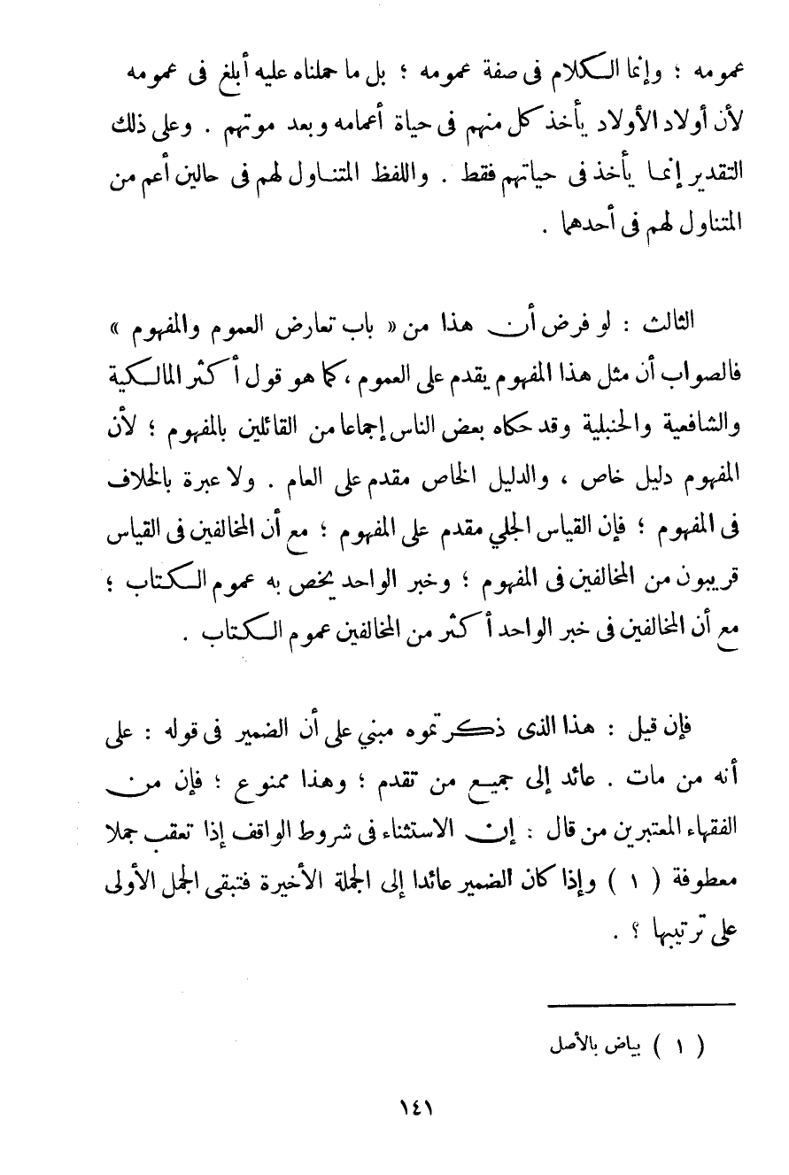 عُمُومِهِ؛ وَإِنَّمَا الْكَلَامُ فِي صِفَةِ عُمُومِهِ؛ بَلْ مَا حَمَلْنَاهُ عَلَيْهِ أَبْلَغُ فِي عُمُومِهِ لِأَنَّ أَوْلَادَ الْأَوْلَادِ يَأْخُذُ كُلٌّ مِنْهُمْ فِي حَيَاةِ أَعْمَامِهِ وَبَعْدَ مَوْتِهِمْ. وَعَلَى ذَلِكَ التَّقْدِيرِ إنَّمَا يَأْخُذُ فِي حَيَاتِهِمْ فَقَطْ. وَاللَّفْظُ الْمُتَنَاوِلُ لَهُمْ فِي حَالَيْنِ أَعَمُّ مِنْ الْمُتَنَاوِلِ لَهُمْ فِي أَحَدِهِمَا. الثَّالِثُ: لَوْ فُرِضَ أَنَّ هَذَا مِنْ " بَابِ تَعَارُضِ الْعُمُومِ وَالْمَفْهُومِ " فَالصَّوَابُ أَنَّ مِثْلَ هَذَا الْمَفْهُومِ يُقَدَّمُ عَلَى الْعُمُومِ كَمَا هُوَ قَوْلُ أَكْثَرِ الْمَالِكِيَّةِ وَالشَّافِعِيَّةِ وَالْحَنْبَلِيَّةِ وَقَدْ حَكَاهُ بَعْضُ النَّاسِ إجْمَاعًا مِنْ الْقَائِلِينَ بِالْمَفْهُومِ؛ لِأَنَّ الْمَفْهُومَ دَلِيلٌ خَاصٌّ وَالدَّلِيلُ الْخَاصُّ مُقَدَّمٌ عَلَى الْعَامِّ. وَلَا عِبْرَةَ بِالْخِلَافِ فِي الْمَفْهُومِ؛ فَإِنَّ الْقِيَاسَ الْجَلِيَّ مُقَدَّمٌ عَلَى الْمَفْهُومِ؛ مَعَ أَنَّ الْمُخَالِفِينَ فِي الْقِيَاسِ قَرِيبُونَ مِنْ الْمُخَالِفِينَ فِي الْمَفْهُومِ؛ وَخَبَرُ الْوَاحِدِ يَخُصُّ بِهِ عُمُومَ الْكِتَابِ مَعَ أَنَّ الْمُخَالِفِينَ فِي خَبَرِ الْوَاحِدِ أَكْثَرُ مِنْ الْمُخَالِفِينَ عُمُومَ الْكِتَابِ.