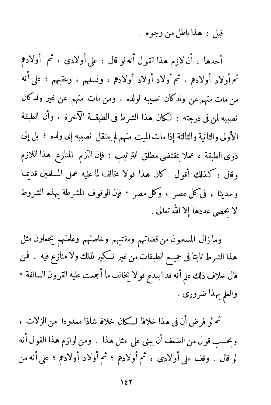 قِيلَ: هَذَا بَاطِلٌ مِنْ وُجُوهٍ. أَحَدُهَا: أَنَّ لَازِمَ هَذَا الْقَوْلِ أَنَّهُ لَوْ قَالَ: عَلَى أَوْلَادِي ثُمَّ أَوْلَادِهِمْ ثُمَّ أَوْلَادِ أَوْلَادِهِمْ ثُمَّ أَوْلَادِ أَوْلَادِ أَوْلَادِهِمْ وَنَسْلِهِمْ وَعَقِبِهِمْ؛ عَلَى أَنَّهُ مَنْ مَاتَ مِنْهُمْ عَنْ وَلَدٍ كَانَ نَصِيبُهُ لِوَلَدِهِ وَمَنْ مَاتَ مِنْهُمْ عَنْ غَيْرِ وَلَدٍ كَانَ نَصِيبُهُ لِمَنْ فِي دَرَجَتِهِ: لَكَانَ هَذَا الشَّرْطُ فِي الطَّبَقَةِ الْآخِرَةِ وَأَنَّ الطَّبَقَةَ الْأُولَى وَالثَّانِيَةَ وَالثَّالِثَةَ إذَا مَاتَ الْمَيِّتُ مِنْهُمْ لَمْ يَنْتَقِلْ نَصِيبُهُ إلَى وَلَدِهِ؛ بَلْ إلَى ذَوِي الطَّبَقَةِ عَمَلًا بِمُقْتَضَى مُطْلَقِ التَّرْتِيبِ؛ فَإِنْ الْتَزَمَ الْمُنَازِعُ هَذَا اللَّازِمَ وَقَالَ: كَذَلِكَ أَقُولُ. كَانَ هَذَا قَوْلًا مُخَالِفًا لِمَا عَلَيْهِ عَمَلُ الْمُسْلِمِينَ قَدِيمًا وَحَدِيثًا فِي كُلِّ عَصْرٍ وَكُلِّ مِصْرٍ؛ فَإِنَّ الْوُقُوفَ الْمُشْرَطَةَ بِهَذِهِ الشُّرُوطِ لَا يُحْصِي عَدَدَهَا إلَّا اللَّهُ تَعَالَى. وَمَا زَالَ الْمُسْلِمُونَ مِنْ قُضَاتِهِمْ وَمُفْتِيهمْ وَخَاصَّتِهِمْ وَعَامَّتِهِمْ يَجْعَلُونَ مِثْلَ هَذَا الشَّرْطِ ثَابِتًا فِي جَمِيعِ الطَّبَقَاتِ مِنْ غَيْرِ نَكِيرٍ لِذَلِكَ وَلَا مُنَازِعٍ فِيهِ. فَمَنْ قَالَ خِلَافَ ذَلِكَ عَلِمَ أَنَّهُ قَدْ ابْتَدَعَ قَوْلًا يُخَالِفُ مَا أَجْمَعَتْ عَلَيْهِ الْقُرُونُ السَّالِفَةُ وَالْعِلْمُ بِهَذَا ضَرُورِيٌّ. ثُمَّ لَوْ فُرِضَ أَنَّ فِي هَذَا خِلَافًا لَكَانَ خِلَافًا شَاذًّا مَعْدُودًا مِنْ الزَّلَّاتِ وَبِحَسَبِ قَوْلٍ مِنْ الضَّعْفِ أَنْ يبنى عَلَى مِثْلِ هَذَا. وَمِنْ لَوَازِمِ هَذَا الْقَوْلِ أَنَّهُ لَوْ قَالَ. وَقَفَ عَلَى أَوْلَادِي ثُمَّ أَوْلَادِهِمْ ثُمَّ أَوْلَادِ أَوْلَادِهِمْ عَلَى أَنَّهُ مَنْ