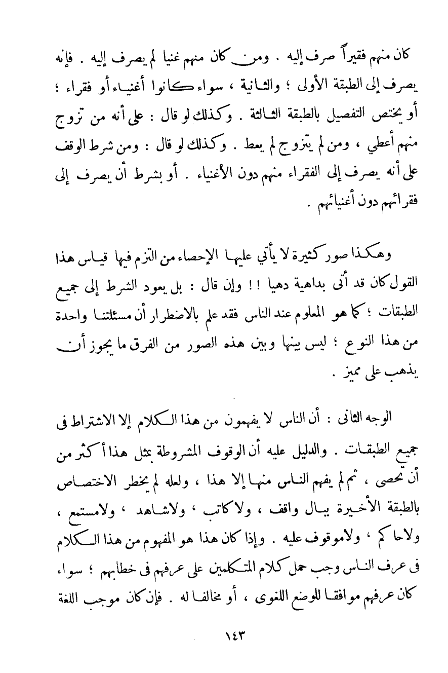 كَانَ مِنْهُمْ فَقِيرًا صُرِفَ إلَيْهِ وَمَنْ كَانَ مِنْهُمْ غَنِيًّا لَمْ يُصْرَفْ إلَيْهِ. فَإِنَّهُ يُصْرَفُ إلَى الطَّبَقَةِ الْأُولَى؛ وَالثَّانِيَةِ سَوَاءٌ كَانُوا أَغْنِيَاءَ أَوْ فُقَرَاءَ؛ أَوْ يَخْتَصُّ التَّفْصِيلُ بِالطَّبَقَةِ الثَّالِثَةِ. وَكَذَلِكَ لَوْ قَالَ: عَلَى أَنَّهُ مَنْ تَزَوَّجَ مِنْهُمْ أُعْطِيَ وَمَنْ لَمْ يَتَزَوَّجْ لَمْ يُعْطَ. وَكَذَلِكَ لَوْ قَالَ: وَمَنْ شَرَطَ الْوَقْفَ عَلَى أَنَّهُ يُصْرَفُ إلَى الْفُقَرَاءِ مِنْهُمْ دُونَ الْأَغْنِيَاءِ. أَوْ بِشَرْطِ أَنْ يُصْرَفَ إلَى فُقَرَائِهِمْ دُونَ أَغْنِيَائِهِمْ. وَهَكَذَا صُوَرٌ كَثِيرَةٌ لَا يَأْتِي عَلَيْهَا الْإِحْصَاءُ مَنْ الْتَزَمَ فِيهَا قِيَاسَ هَذَا الْقَوْلِ كَانَ قَدْ أَتَى بِدَاهِيَةِ دَهْيًا وَإِنْ قَالَ: بَلْ يَعُودُ الشَّرْطُ إلَى جَمِيعِ الطَّبَقَاتِ؛ كَمَا هُوَ الْمَعْلُومُ عِنْدَ النَّاسِ فَقَدْ عَلِمَ بِالِاضْطِرَارِ أَنَّ مَسْأَلَتَنَا وَاحِدَةٌ مِنْ هَذَا النَّوْعِ؛ لَيْسَ بَيْنَهَا وَبَيْنَ هَذِهِ الصُّوَرِ مِنْ الْفَرْقِ مَا يَجُوزُ أَنْ يَذْهَبَ عَلَى مُمَيَّزٍ. الْوَجْهُ الثَّانِي: أَنَّ النَّاسَ لَا يَفْهَمُونَ مِنْ هَذَا الْكَلَامِ إلَّا الِاشْتِرَاطَ فِي جَمِيعِ الطَّبَقَاتِ. وَالدَّلِيلُ عَلَيْهِ أَنَّ الْوُقُوفَ الْمَشْرُوطَةَ بِمِثْلِ هَذَا أَكْثَرُ مِنْ أَنْ تُحْصَى ثُمَّ لَمْ يَفْهَمْ النَّاسُ مِنْهَا إلَّا هَذَا وَلَعَلَّهُ لَمْ يَخْطِرْ الِاخْتِصَاصُ بِالطَّبَقَةِ الْأَخِيرَةِ بِبَالِ وَاقِفٍ وَلَا كَاتِبٍ وَلَا شَاهِدٍ وَلَا مُسْتَمِعٍ وَلَا حَاكِمٍ وَلَا مَوْقُوفٍ عَلَيْهِ. وَإِذَا كَانَ هَذَا هُوَ الْمَفْهُومَ مِنْ هَذَا الْكَلَامِ فِي عُرْفِ النَّاسِ وَجَبَ حَمْلُ كَلَامِ الْمُتَكَلِّمِينَ عَلَى عُرْفِهِمْ فِي خِطَابِهِمْ سَوَاءٌ كَانَ عُرْفُهُمْ مُوَافِقًا لِلْوَضْعِ اللُّغَوِيِّ أَوْ مُخَالِفًا لَهُ. فَإِنْ كَانَ مُوجَبُ اللُّغَةِ