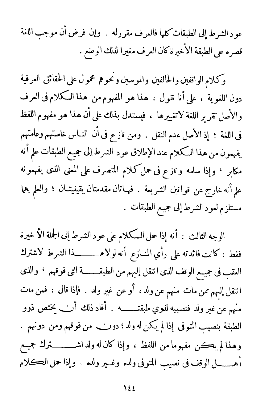 عَوْدُ الشَّرْطِ إلَى الطَّبَقَاتِ كُلِّهَا فَالْعُرْفُ مُقَرِّرٌ لَهُ. وَإِنْ فُرِضَ أَنَّ مُوجِبَ اللُّغَةِ قَصْرُهُ عَلَى الطَّبَقَةِ الْأَخِيرَةِ كَانَ الْعُرْفُ مُغَيِّرًا لِذَلِكَ الْوَضْعِ. وَكَلَامُ الْوَاقِفِينَ وَالْحَالِفِينَ وَالْمُوصِينَ وَنَحْوِهِمْ مَحْمُولٌ عَلَى الْحَقَائِقِ الْعُرْفِيَّةِ دُونَ اللُّغَوِيَّةِ عَلَى أَنَّا نَقُولُ: هَذَا هُوَ الْمَفْهُومُ مِنْ هَذَا الْكَلَامِ فِي الْعُرْفِ وَالْأَصْلُ تَقْرِيرُ اللُّغَةِ لَا تَغْيِيرُهَا فَيُسْتَدَلُّ بِذَلِكَ عَلَى أَنَّ هَذَا هُوَ مَفْهُومُ اللَّفْظِ فِي اللُّغَةِ؛ إذْ الْأَصْلُ عَدَمُ النَّقْلِ. وَمَنْ نَازَعَ فِي أَنَّ النَّاسَ خَاصَّتَهُمْ وَعَامَّتَهُمْ يَفْهَمُونَ مِنْ هَذَا الْكَلَامِ عِنْدَ الْإِطْلَاقِ عَوْدَ الشَّرْطِ إلَى جَمِيعِ الطَّبَقَاتِ عُلِمَ أَنَّهُ مُكَابِرٌ وَإِذَا سَلَّمَهُ وَنَازَعَ فِي حَمْلِ كَلَامِ الْمُتَصَرِّفِ عَلَى الْمَعْنَى الَّذِي يَفْهَمُونَهُ عُلِمَ أَنَّهُ خَارِجٌ عَنْ قَوَانِينِ الشَّرِيعَةِ. فَهَاتَانِ مُقَدِّمَتَانِ يَقِينِيَّتَانِ؛ وَالْعِلْمُ بِهِمَا مُسْتَلْزِمٌ لِعَوْدِ الشَّرْطِ إلَى جَمِيعِ الطَّبَقَاتِ. الْوَجْهُ الثَّالِثُ: أَنَّهُ إذَا حَمَلَ الْكَلَامَ عَلَى عَوْدِ الشَّرْطِ إلَى الْجُمْلَةِ الْأَخِيرَةِ فَقَطْ: كَانَتْ فَائِدَتُهُ عَلَى رَأْيِ الْمُنَازِعِ أَنَّهُ لَوْلَا هَذَا الشَّرْطُ لَاشْتَرَكَ الْعَقِبُ فِي جَمِيعِ الْوَقْفِ الَّذِي انْتَقَلَ إلَيْهِمْ مِنْ الطَّبَقَةِ الَّتِي فَوْقَهُمْ وَاَلَّذِي انْتَقَلَ إلَيْهِمْ مِمَّنْ مَاتَ مِنْهُمْ عَنْ وَلَدٍ أَوْ عَنْ غَيْرِ وَلَدٍ. فَإِذَا قَالَ: فَمَنْ مَاتَ مِنْهُمْ عَنْ غَيْرِ وَلَدٍ فَنَصِيبُهُ لِذَوِي طَبَقَتِهِ. أَفَادَ ذَلِكَ أَنْ يَخْتَصَّ ذووا الطَّبَقَةِ بِنَصِيبِ الْمُتَوَفَّى إذَا لَمْ يَكُنْ لَهُ وَلَدٌ؛ دُونَ مَنْ فَوْقَهُمْ وَمَنْ دُونَهُمْ. وَهَذَا لَمْ يَكُنْ مَفْهُومًا مِنْ اللَّفْظِ وَإِذَا كَانَ لَهُ وَلَدٌ اشْتَرَكَ جَمِيعُ أَهْلِ الْوَقْفِ فِي نَصِيبِ الْمُتَوَفَّى وَلَدُهُ وَغَيْرُ وَلَدِهِ. وَإِذَا حُمِلَ الْكَلَامُ