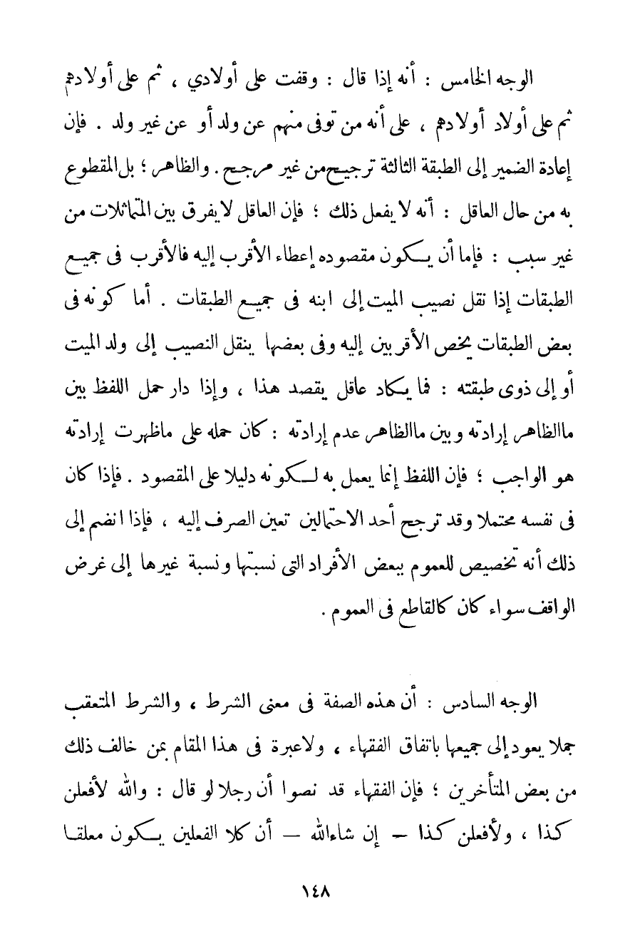 الْوَجْهُ الْخَامِسُ: أَنَّهُ إذَا قَالَ: وَقَفْت عَلَى أَوْلَادِي ثُمَّ عَلَى أَوْلَادِهِمْ ثُمَّ عَلَى أَوْلَادِ أَوْلَادِهِمْ عَلَى أَنَّهُ مَنْ تُوُفِّيَ مِنْهُمْ عَنْ وَلَدٍ أَوْ عَنْ غَيْرِ وَلَدٍ. فَإِنَّ إعَادَةَ الضَّمِيرِ إلَى الطَّبَقَةِ الثَّالِثَةِ تَرْجِيحٌ مِنْ غَيْرِ مُرَجِّحٍ. وَالظَّاهِرُ؛ بَلْ الْمَقْطُوعُ بِهِ مِنْ حَالِ الْعَاقِلِ: أَنَّهُ لَا يَفْعَلُ ذَلِكَ؛ فَإِنَّ الْعَاقِلَ لَا يُفَرِّقُ بَيْنَ الْمُتَمَاثِلَاتِ مِنْ غَيْرِ سَبَبٍ: فَإِمَّا أَنْ يَكُونَ مَقْصُودُهُ إعْطَاءَ الْأَقْرَبِ إلَيْهِ فَالْأَقْرَبِ فِي جَمِيعِ الطَّبَقَاتِ إذَا نُقِلَ نَصِيبُ الْمَيِّتِ إلَى ابْنِهِ فِي جَمِيعِ الطَّبَقَاتِ. أَمَّا كَوْنُهُ فِي بَعْضِ الطَّبَقَاتِ يَخُصُّ الْأَقْرَبِينَ إلَيْهِ وَفِي بَعْضِهَا بِنَقْلِ النَّصِيبِ إلَى وَلَدِ الْمَيِّتِ أَوْ إلَى ذَوِي طَبَقَتِهِ: فَمَا يَكَادُ عَاقِلٌ يَقْصِدُ هَذَا وَإِذَا دَارَ حَمْلُ اللَّفْظِ بَيْنَ مَا الظَّاهِرُ إرَادَتُهُ وَبَيْنَ مَا الظَّاهِرُ عَدَمُ إرَادَتِهِ: كَانَ حَمْلُهُ عَلَى مَا ظَهَرَتْ إرَادَتُهُ هُوَ الْوَاجِبَ؛ فَإِنَّ اللَّفْظَ إنَّمَا يُعْمَلُ بِهِ لِكَوْنِهِ دَلِيلًا عَلَى الْمَقْصُودِ. فَإِذَا كَانَ فِي نَفْسِهِ مُحْتَمَلًا وَقَدْ تَرَجَّحَ أَحَدُ الِاحْتِمَالَيْنِ تَعَيَّنَ الصَّرْفُ إلَيْهِ فَإِذَا انْضَمَّ إلَى ذَلِكَ أَنَّهُ تَخْصِيصٌ لِلْعُمُومِ بِبَعْضِ الْأَفْرَادِ الَّتِي نِسْبَتُهَا وَنِسْبَةُ غَيْرِهَا إلَى غَرَضِ الْوَاقِفِ سَوَاءٌ كَانَ كَالْقَاطِعِ فِي الْعُمُومِ. الْوَجْهُ السَّادِسُ: أَنَّ هَذِهِ الصِّفَةَ فِي مَعْنَى الشَّرْطِ وَالشَّرْطُ الْمُتَعَقِّبُ جُمَلًا يَعُودُ إلَى جَمِيعِهَا بِاتِّفَاقِ الْفُقَهَاءِ وَلَا عِبْرَةَ فِي هَذَا الْمَقَامِ بِمَنْ خَالَفَ ذَلِكَ مِنْ بَعْضِ الْمُتَأَخِّرِينَ؛ فَإِنَّ الْفُقَهَاءَ قَدْ نَصُّوا أَنَّ رَجُلًا لَوْ قَالَ: وَاَللَّهِ لَأَفْعَلَن كَذَا وَلَأَفْعَلَن كَذَا - إنْ شَاءَ اللَّهُ - أَنَّ كِلَا الْفِعْلَيْنِ يَكُونُ مُعَلَّقًا